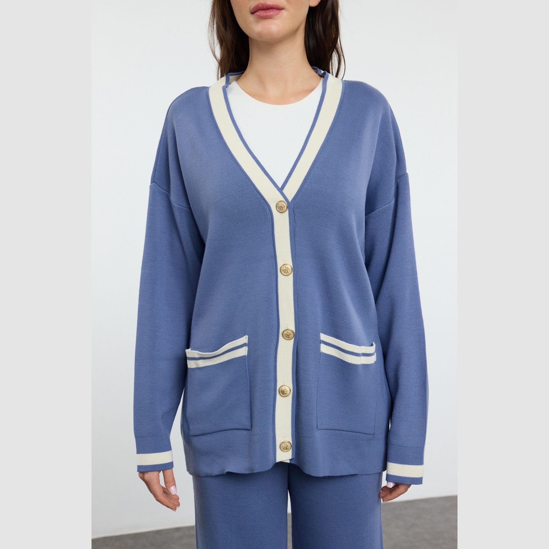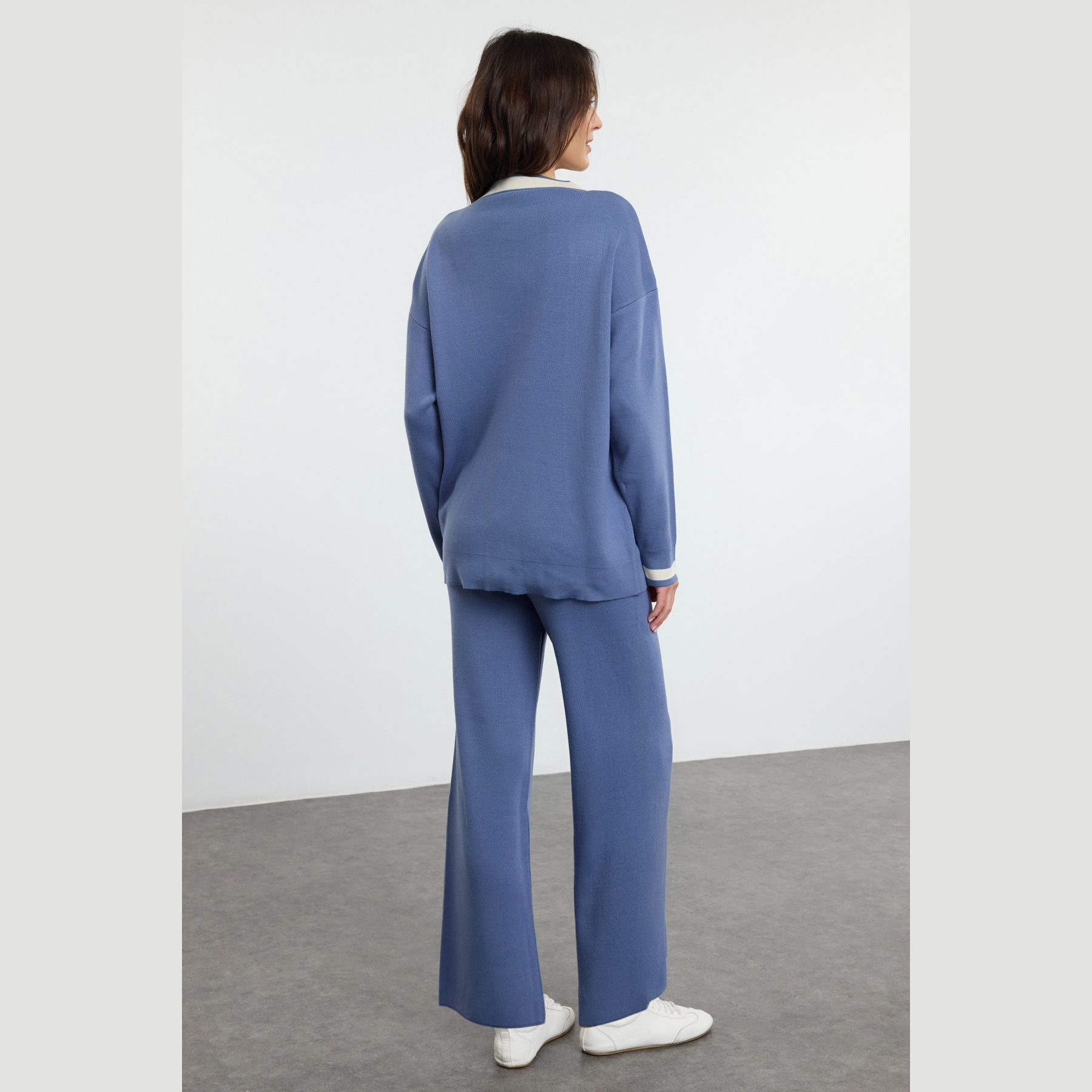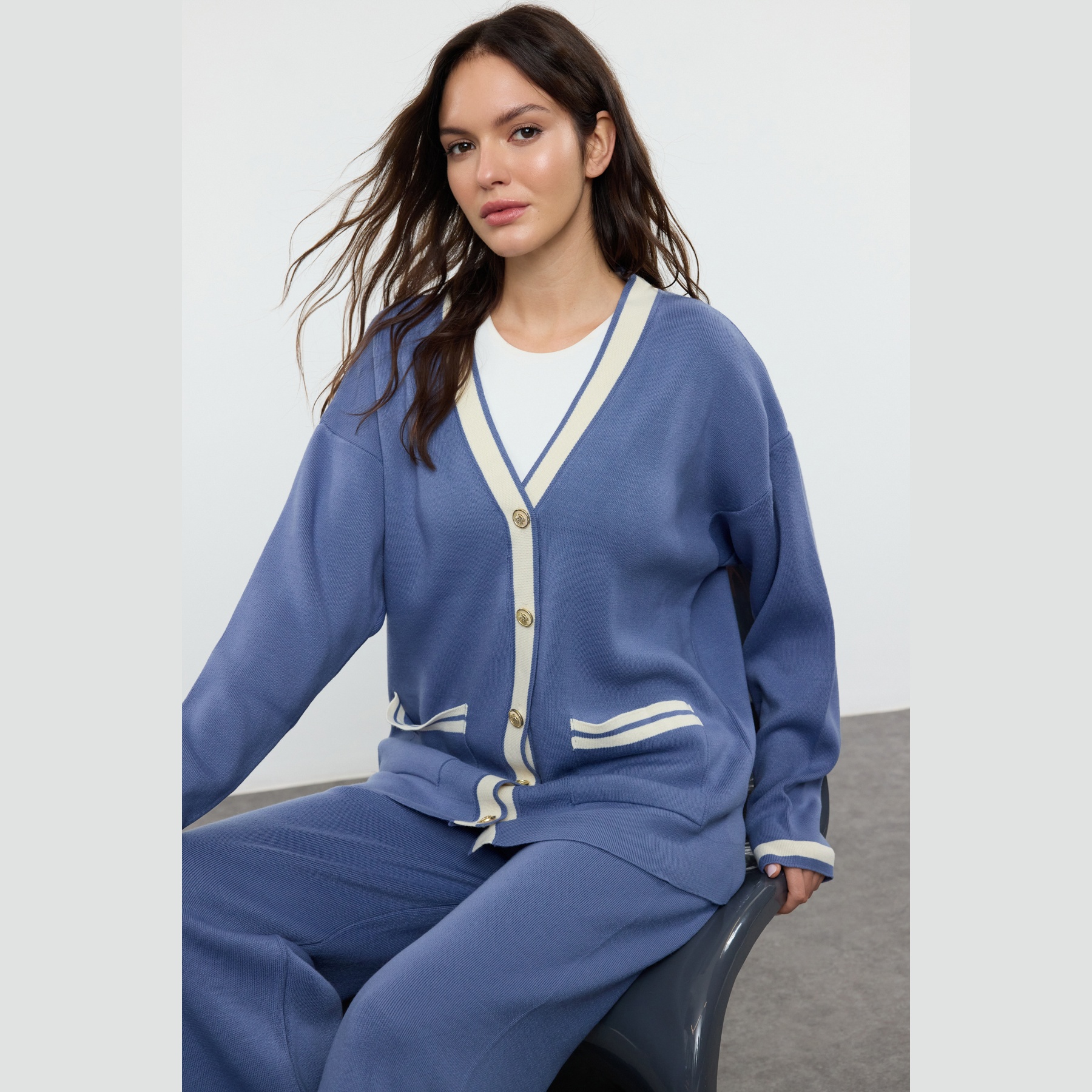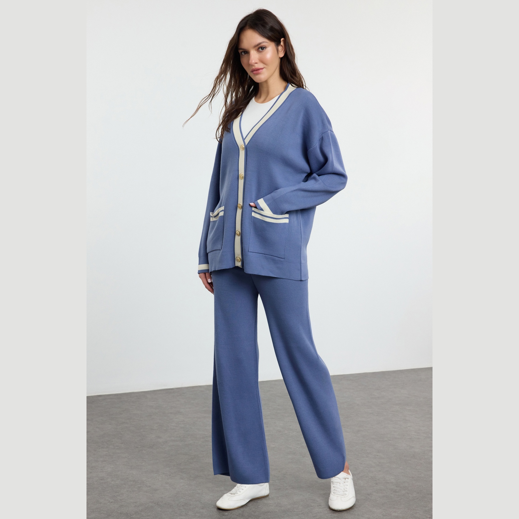 طقم أنيق بلون أزرق نيلي (Indigo) مزين بتفاصيل ألوان متداخلة وأزرار ذهبية لامعة من مجموعة Trendyolmilla Modest – لأناقة شتوية دافئة ومحتشمة بلمسة فاخرة، يتكون من كنزة طويلة بأزرار أمامية وياقة V وجيوب جانبية عملية مع بنطال واسع بخصر مرتفع وقصة مستقيمة، مصنوع من خامة تريكو مزدوجة الطبقة بتركيبة 100% أكريليك، ما يجعله مثاليًا للأجواء الباردة والإطلالات اليومية المحتشمة.