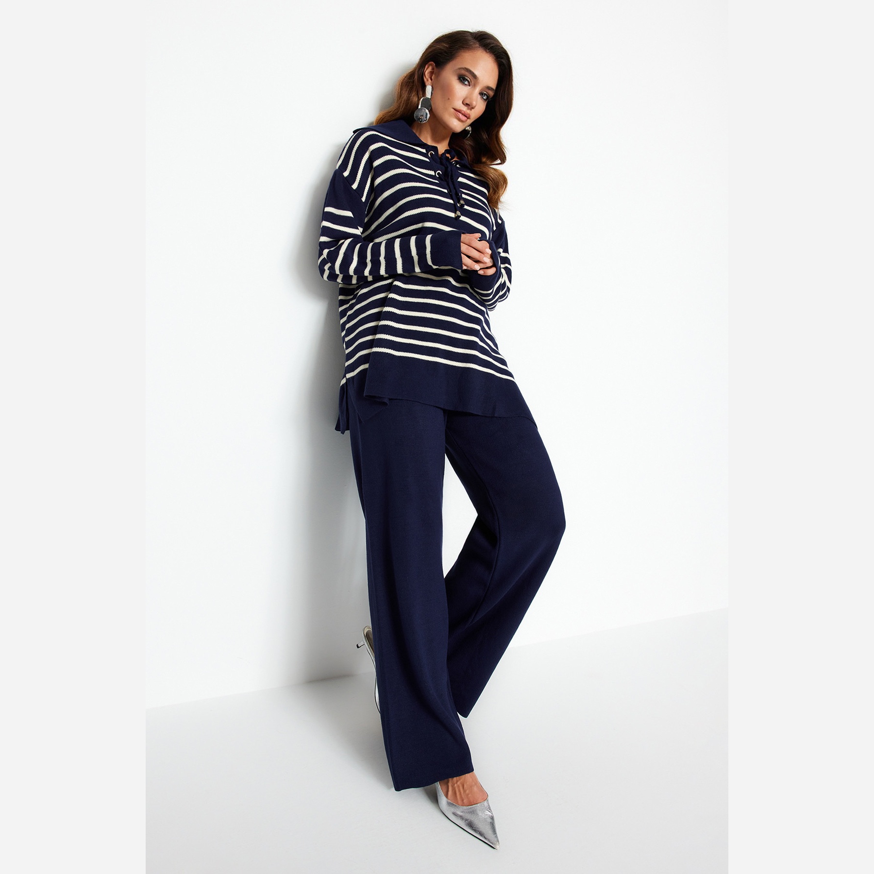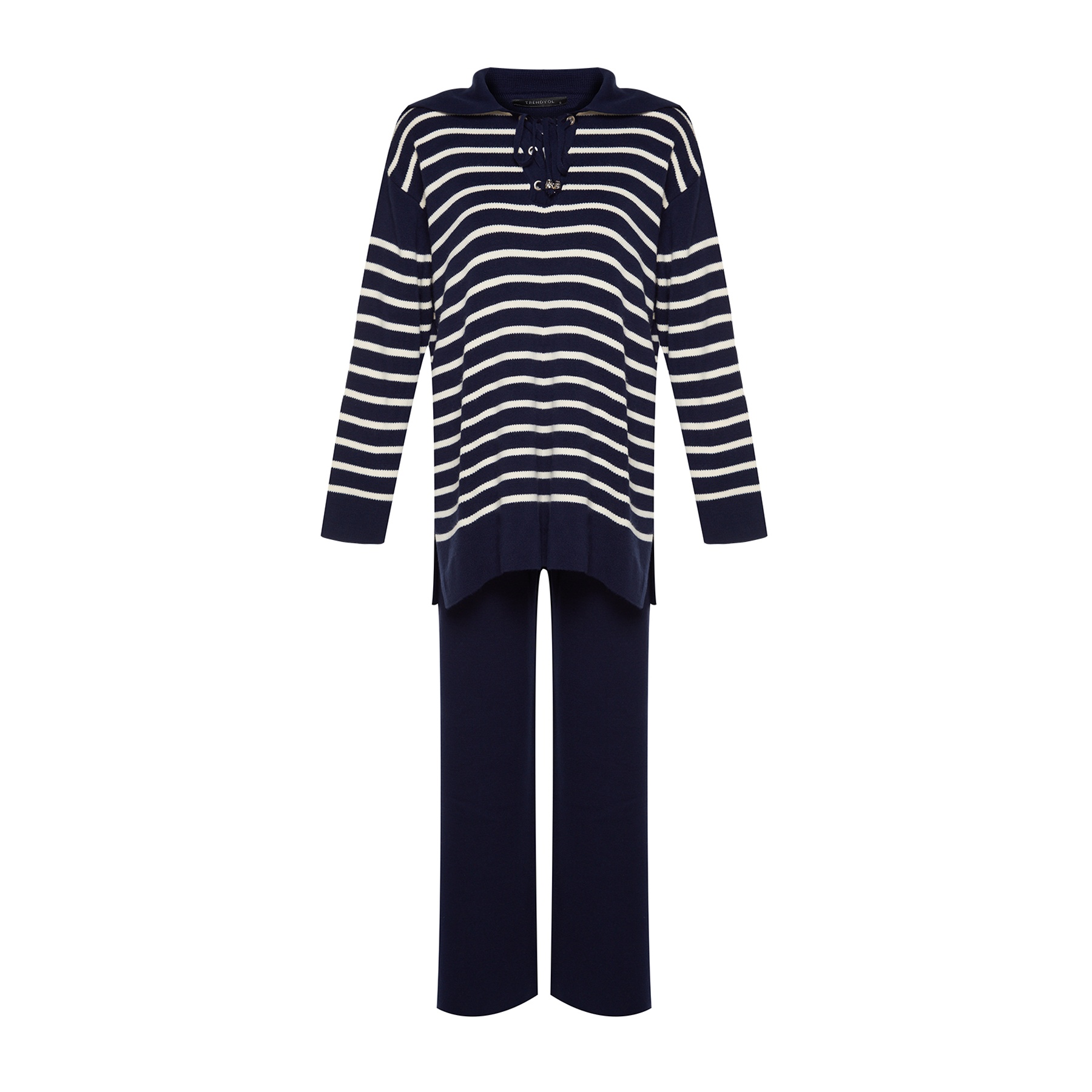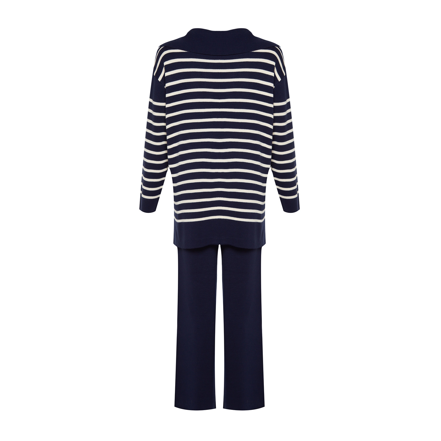 طقم نسائي مكون من كنزة وبنطال – كحلي بخطوط وياقة مربعة برباط (قماش تريكو، تصميم محتشم)