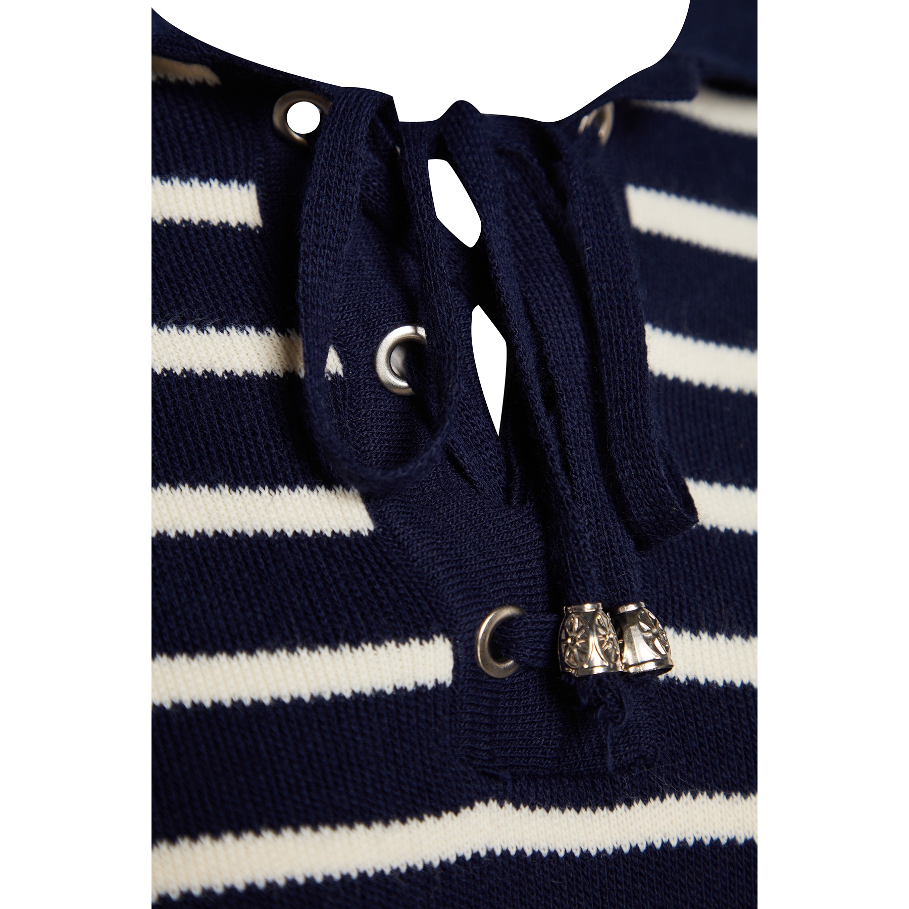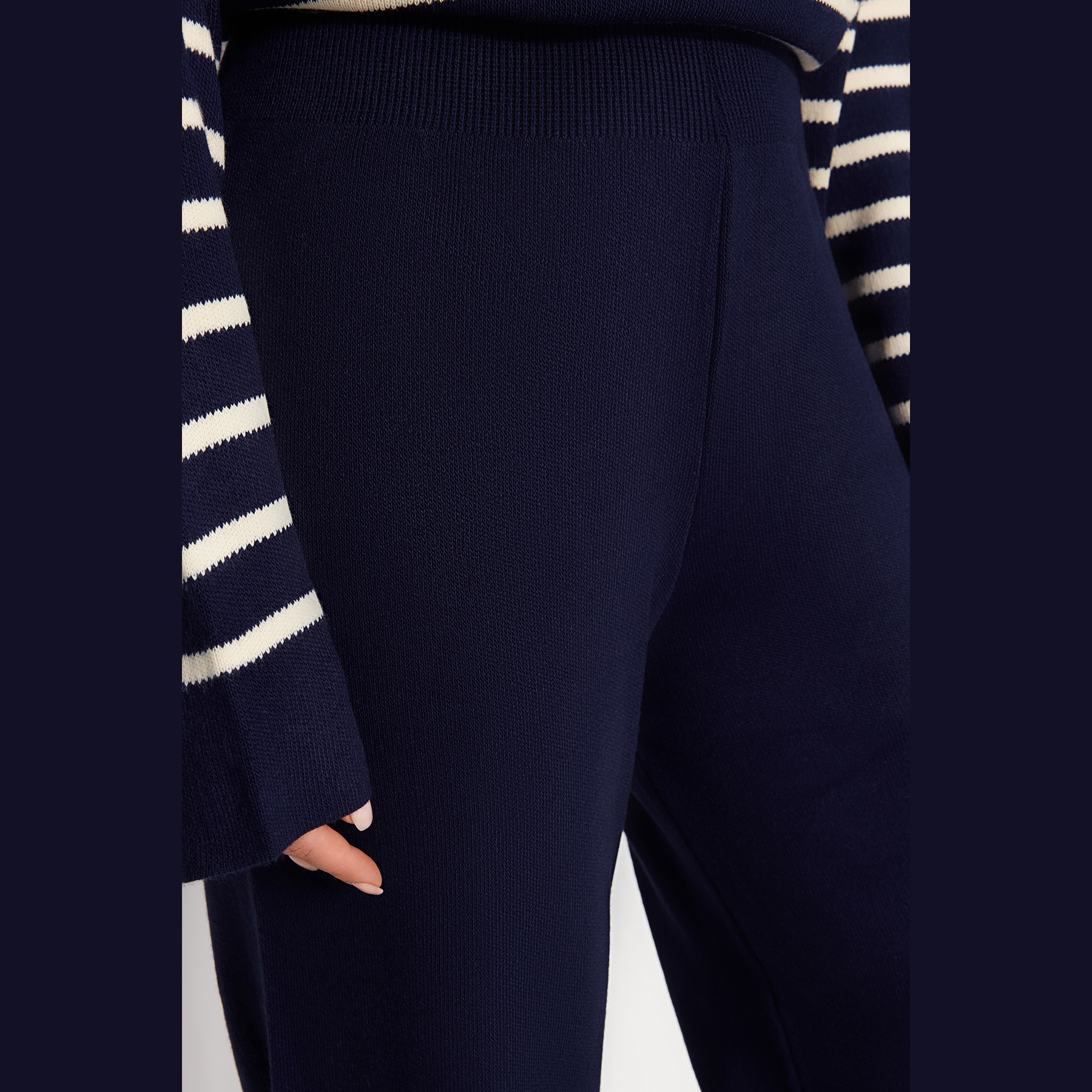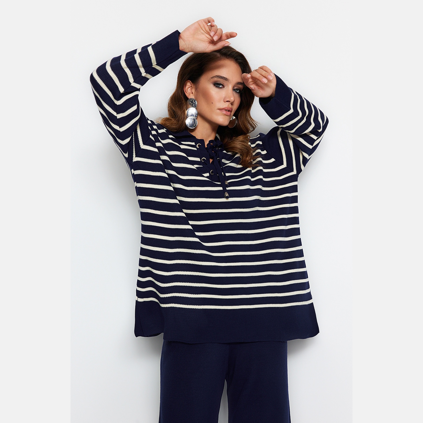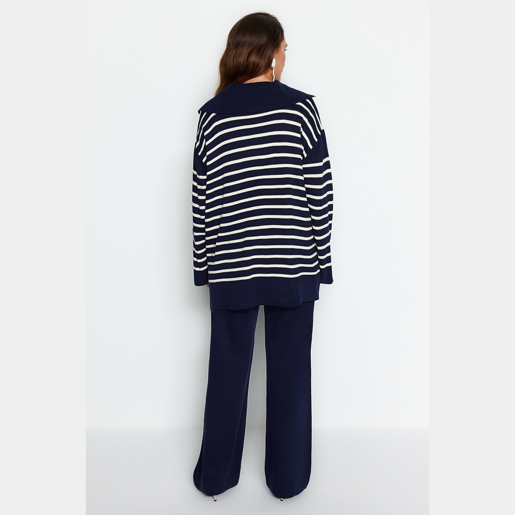 طقم نسائي مكون من كنزة وبنطال – كحلي بخطوط وياقة مربعة برباط (قماش تريكو، تصميم محتشم)