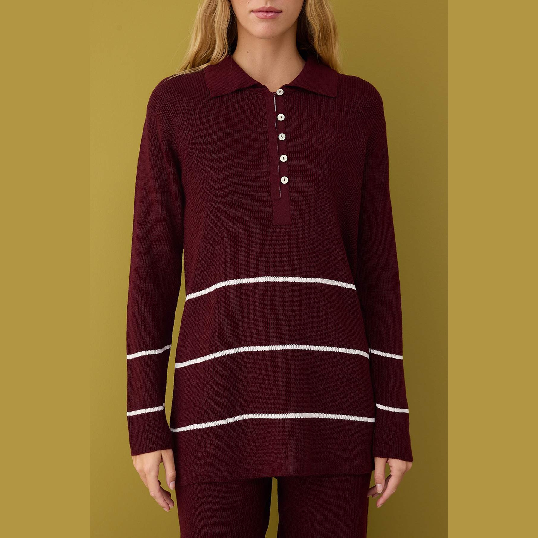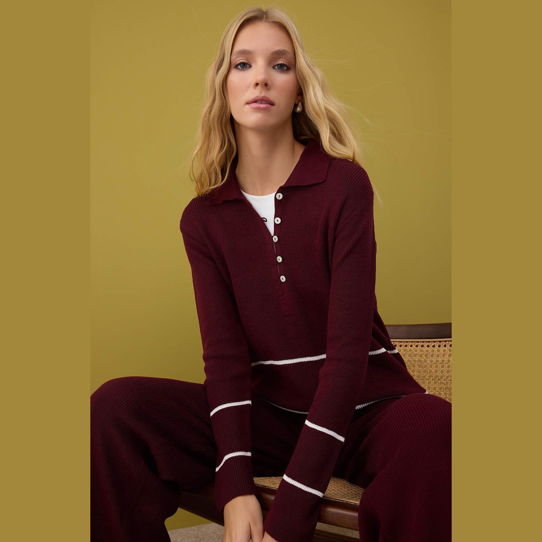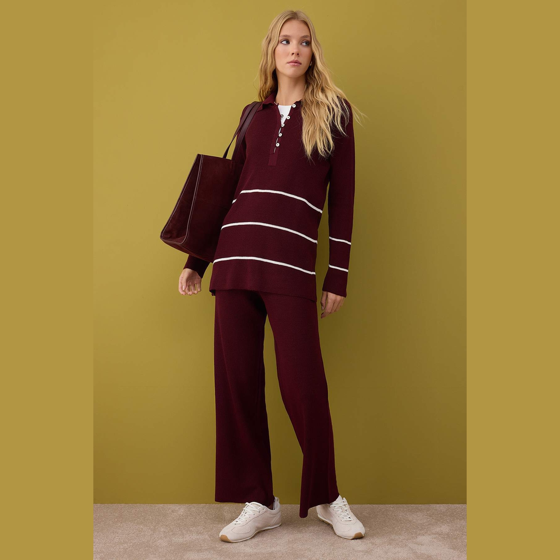 طقم أنيق بلوني بوردو وكريمي من مجموعة Trendyolmilla Modest – لأناقة شتوية دافئة ومحتشمة بلمسة كلاسيكية مميزة، يتكون من كنزة طويلة بياقة بولو وأكمام كاملة مع بنطال بخصر مرتفع وقصة Fitted ضيقة نسبياً، مصنوع من خامة تريكو سادة بنمط سيلانيك بتركيبة 100% أكريليك، ما يجعله مثاليًا للأجواء الباردة والإطلالات اليومية المحتشمة.