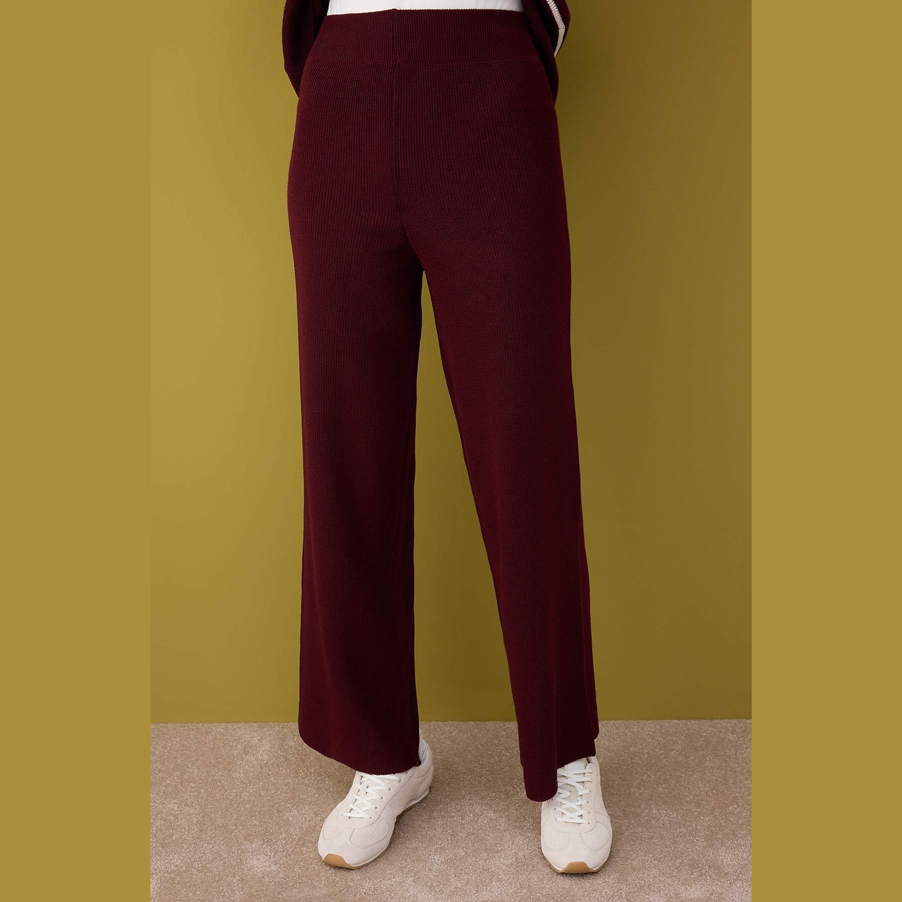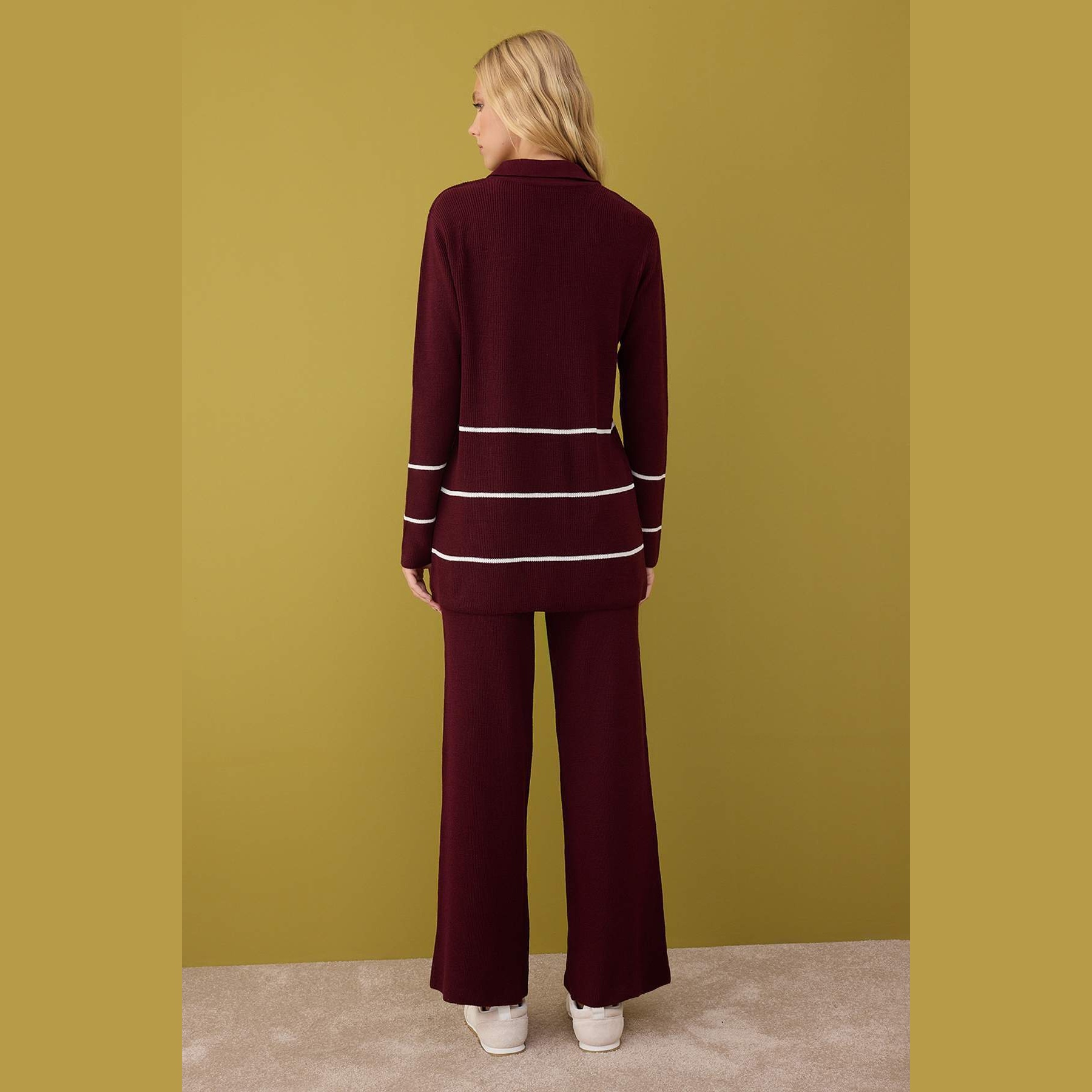 طقم نسائي مكون من كنزة وبنطال – بوردو وكريمي بقصة ضيقة (قماش تريكو سادة، تصميم محتشم)