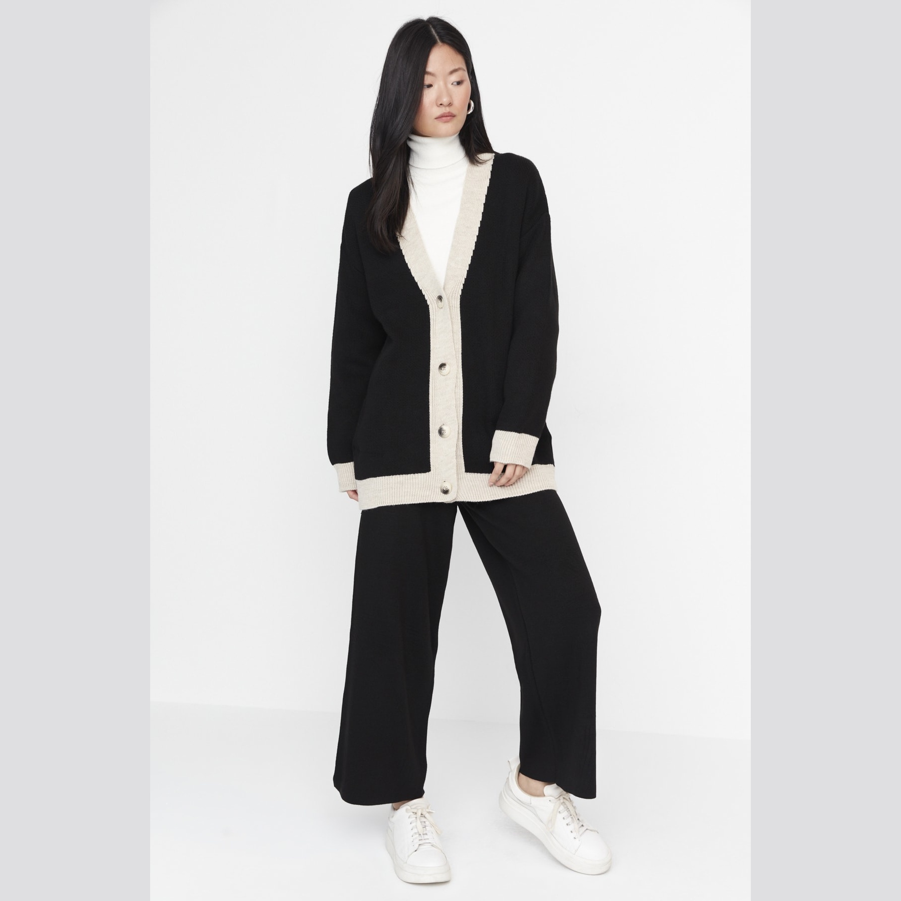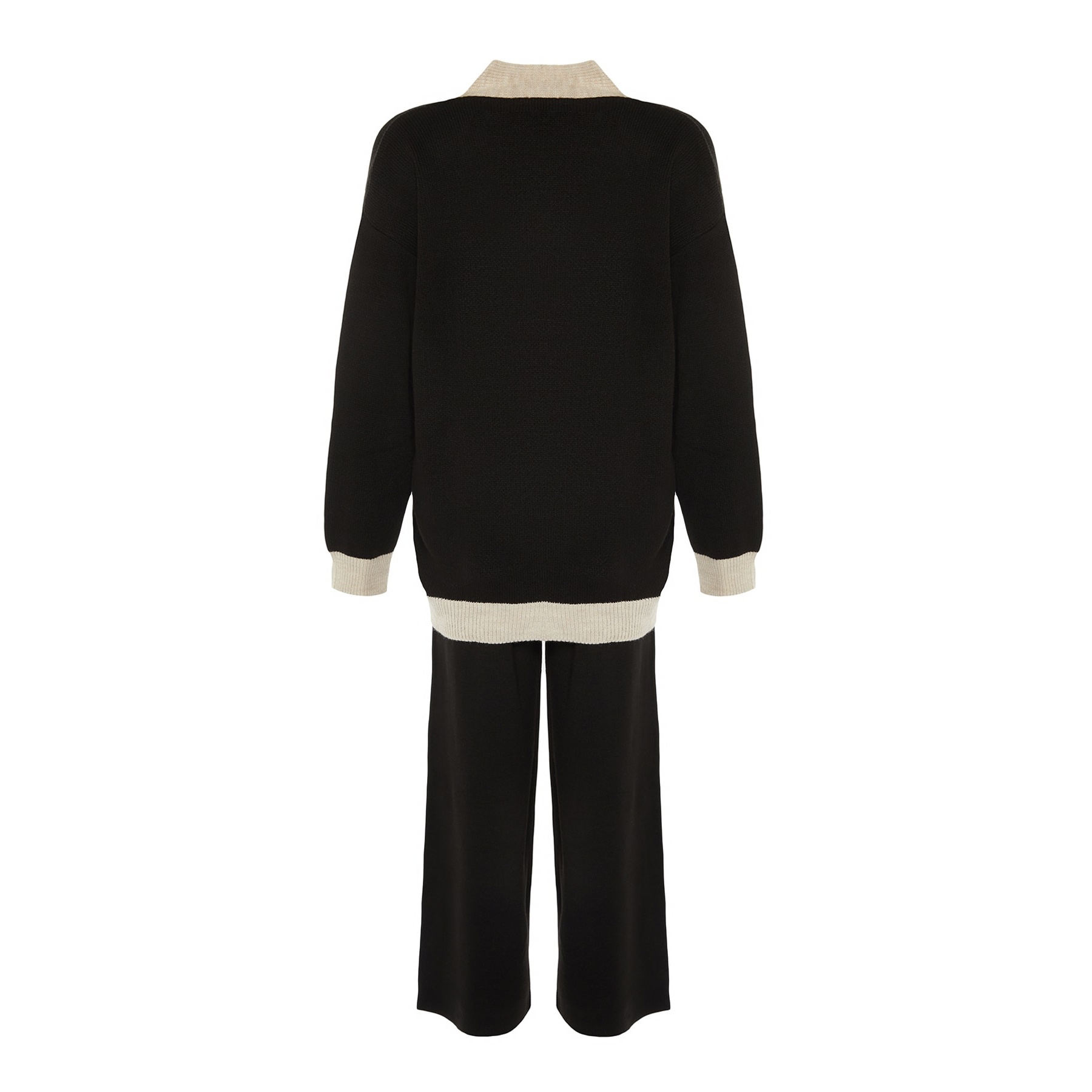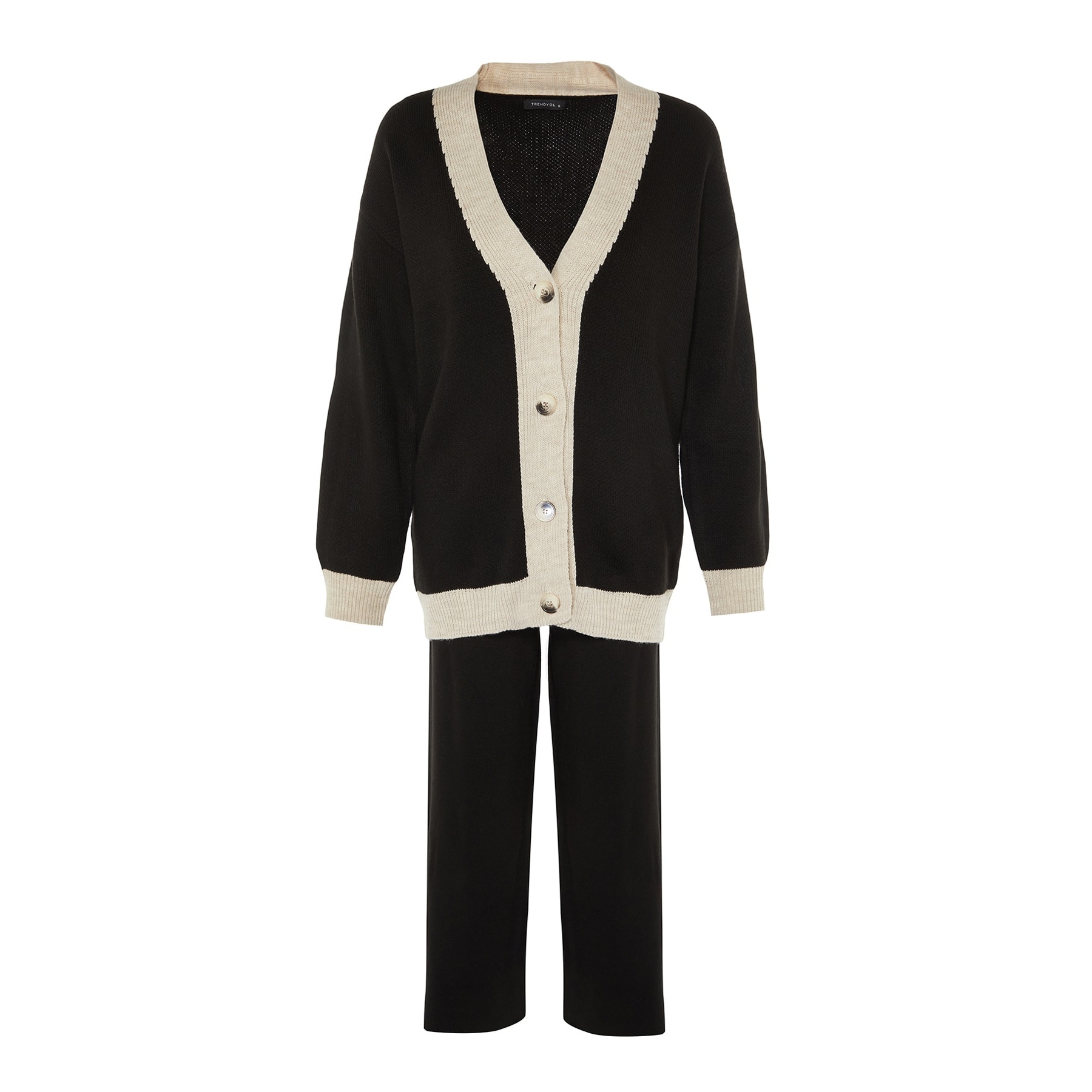 طقم أنيق بلون طاش (بيج فاتح) مزين بشرائط بلون متباين من مجموعة Trendyolmilla Modest – لأناقة شتوية دافئة ومحتشمة بلمسة تصميمية عصرية، يتكون من كنزة طويلة بأزرار أمامية وياقة V مع بنطال واسع بخصر مرتفع وقصة مستقيمة، مصنوع من خامة تريكو ناعمة مزدوجة الطبقة بتركيبة 100% أكريليك، ما يجعله مثاليًا للأجواء الباردة والإطلالات اليومية المحتشمة.