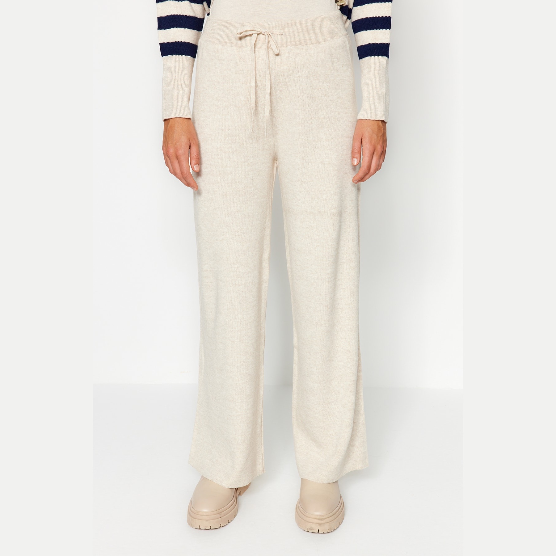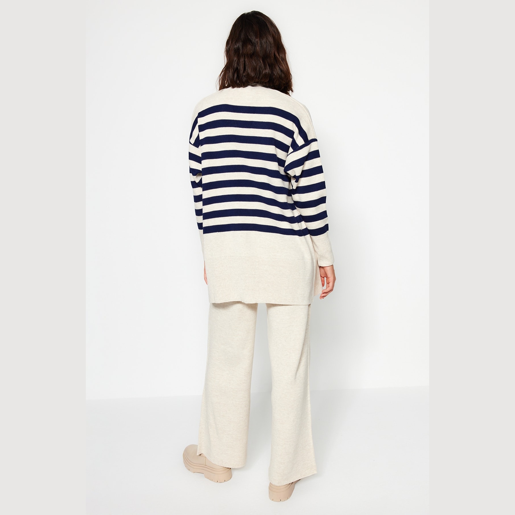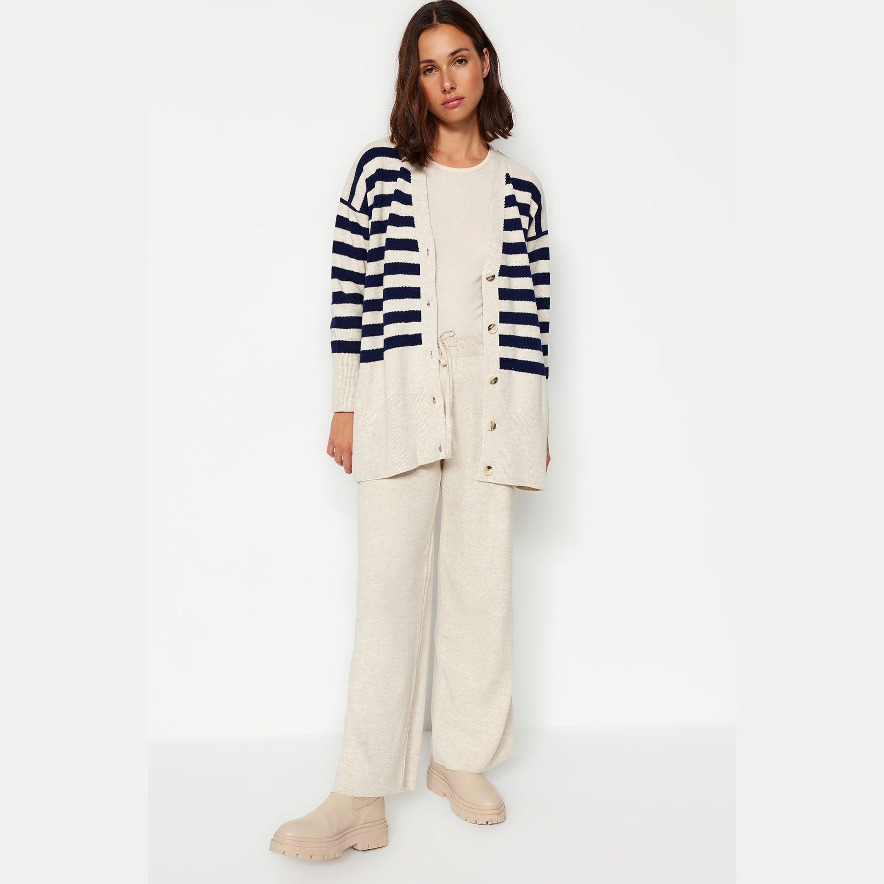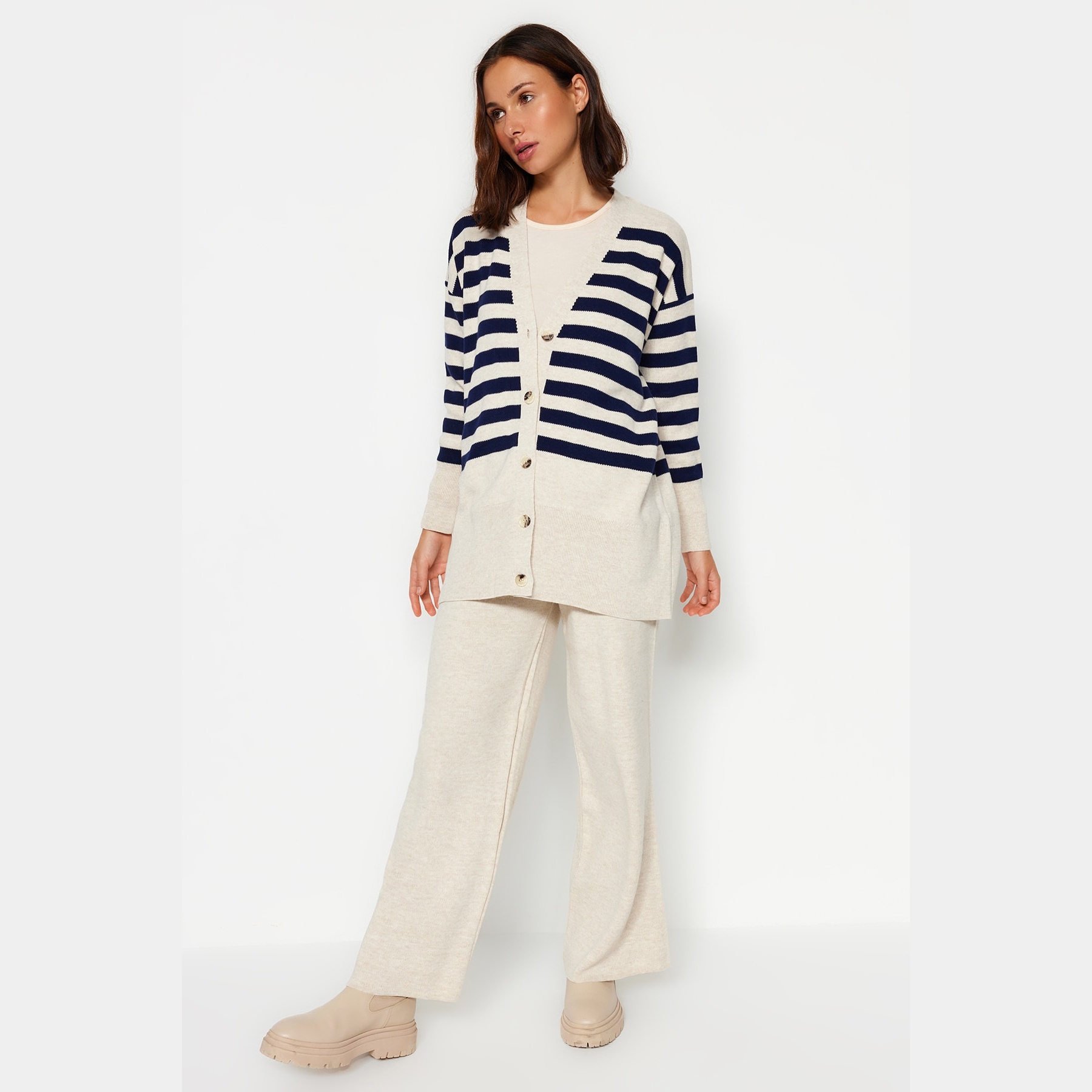 طقم أنيق بلون بيج فاتح مزين بنقشة جاكار بخطوط ناعمة وأزرار أمامية من مجموعة Trendyolmilla Modest – لأناقة شتوية دافئة ومحتشمة بلمسة كلاسيكية مميزة، يتكون من كنزة طويلة بياقة V وأزرار أمامية مع بنطال مستقيم بخصر مرتفع وقصة مريحة، مصنوع من خامة تريكو مزدوجة الطبقة بتركيبة 100% أكريليك، ما يجعله مثاليًا للأجواء الباردة والإطلالات اليومية المحتشمة.