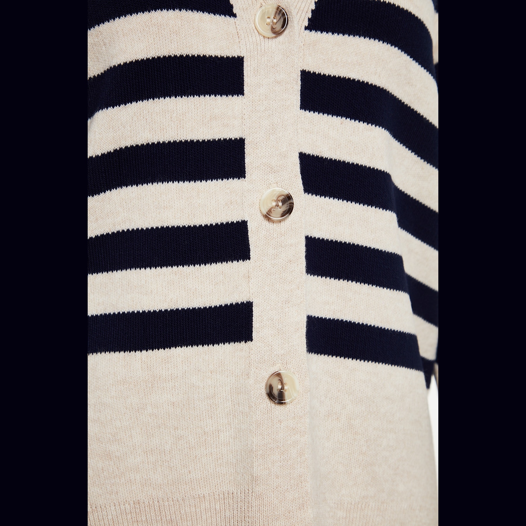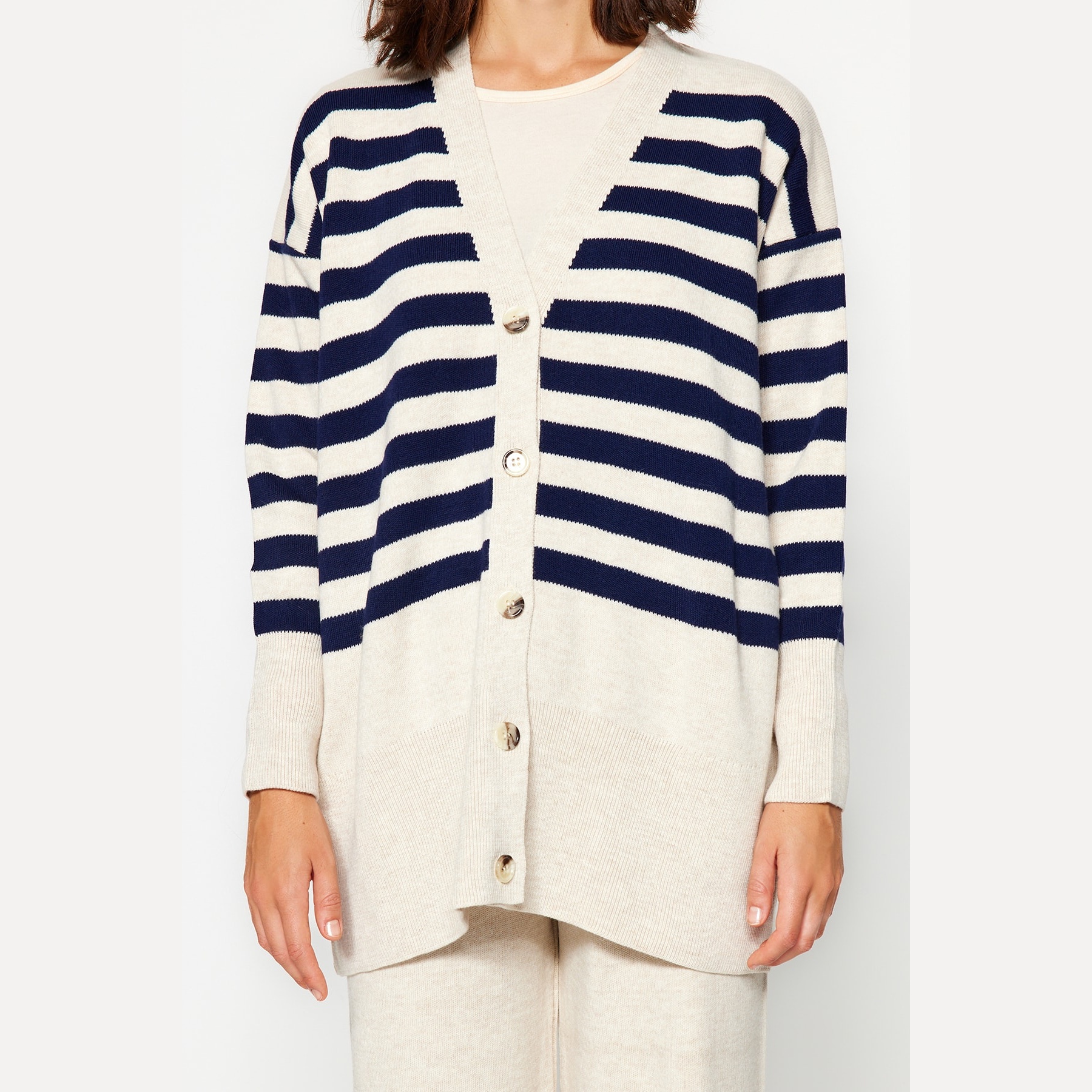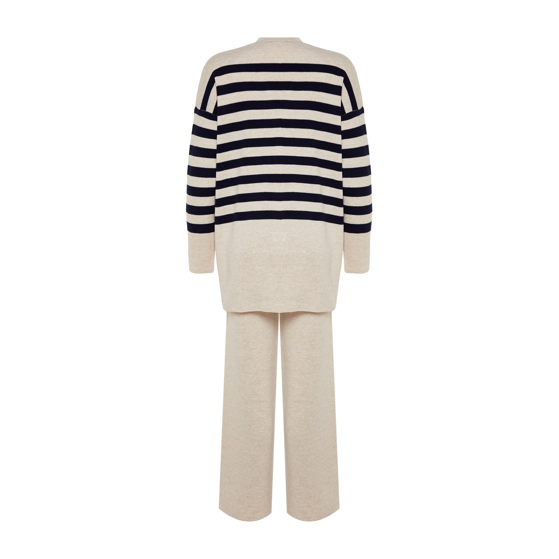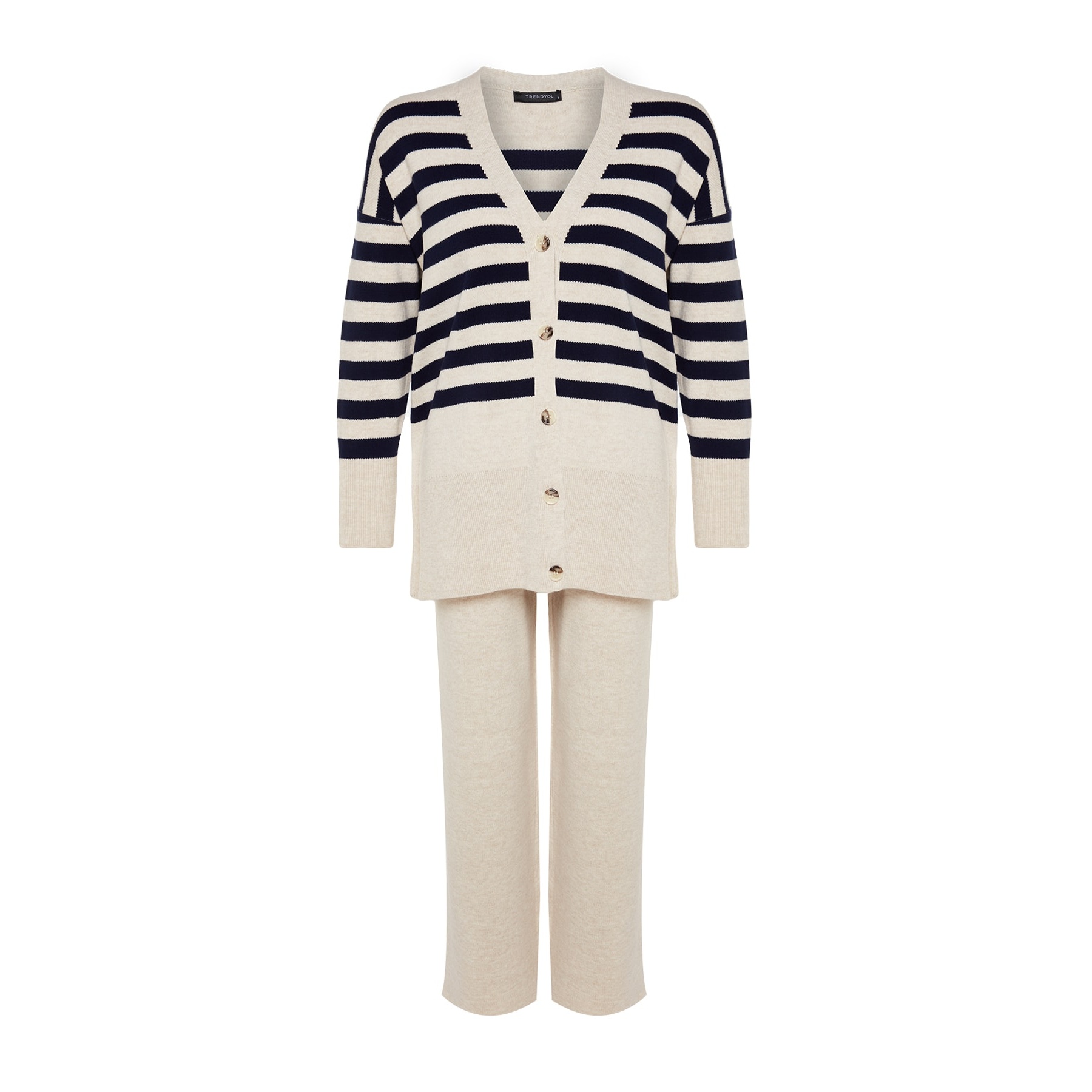 طقم نسائي مكون من كنزة وبنطال – بيج بنقشة جاكار وخطوط وأزرار أمامية (قماش تريكو، تصميم محتشم)
