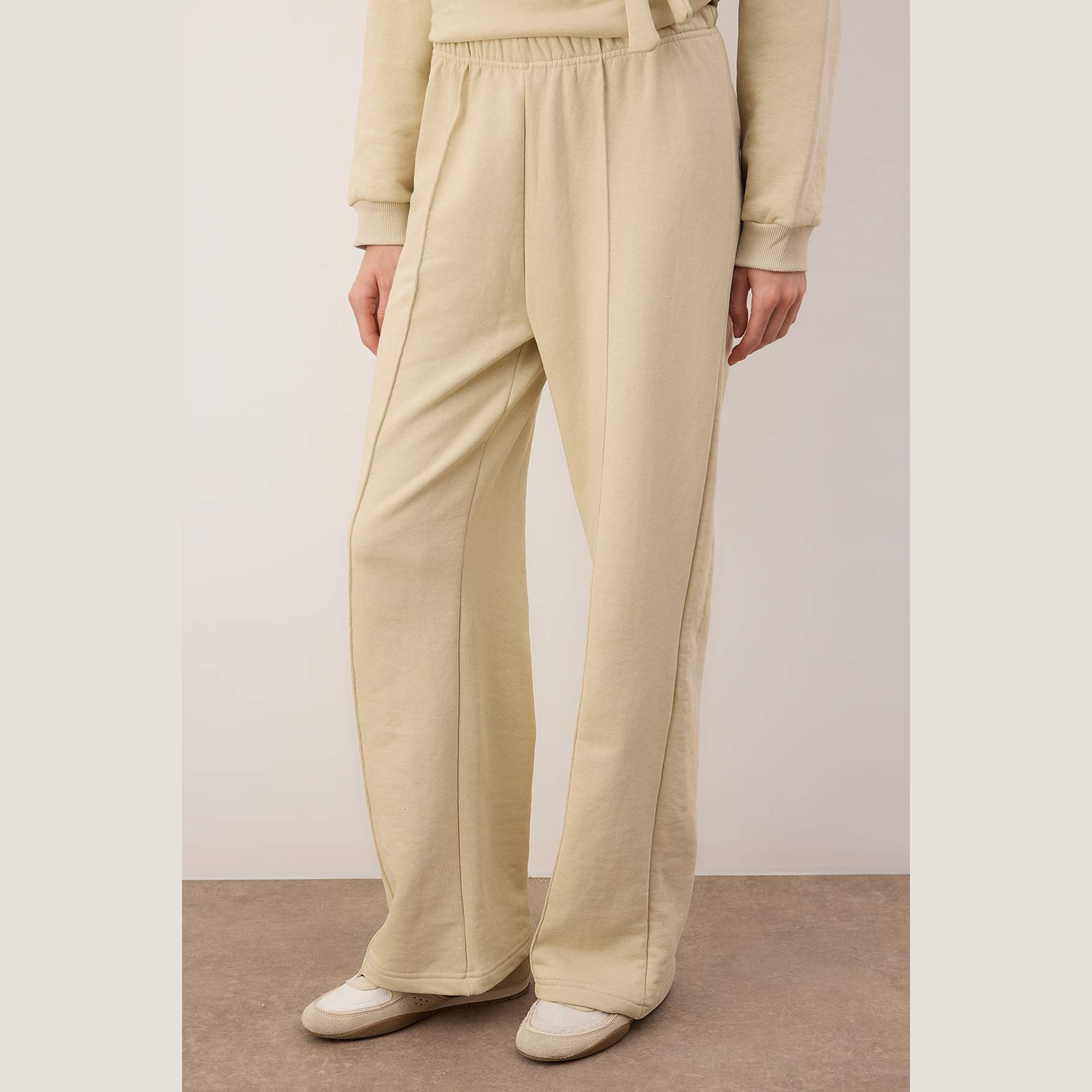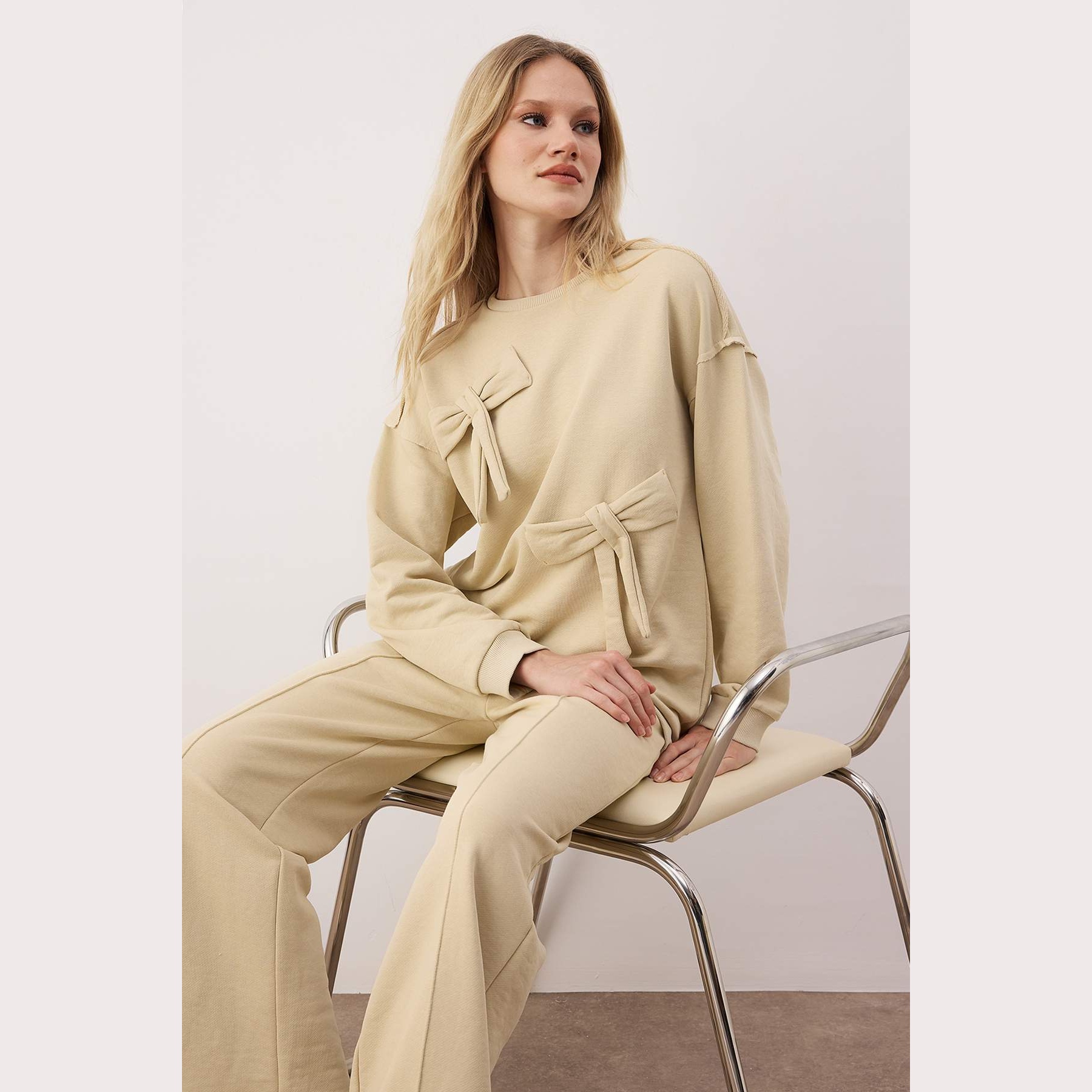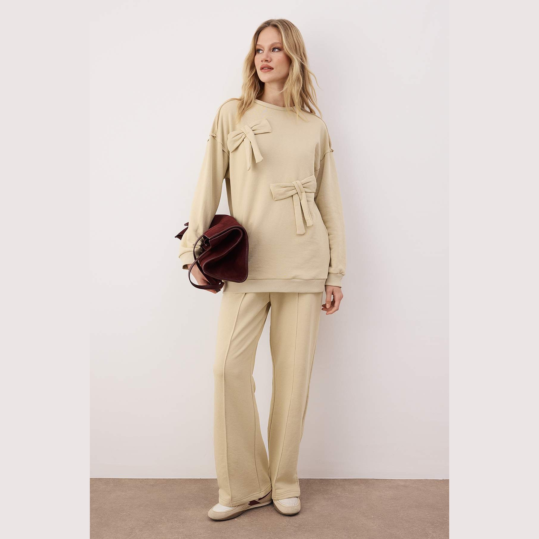 طقم نسائي مكون من تونيك وبنطال – بيج بقصة واسعة (قماش 3-خيوط بنسيج قطني، تصميم محتشم)