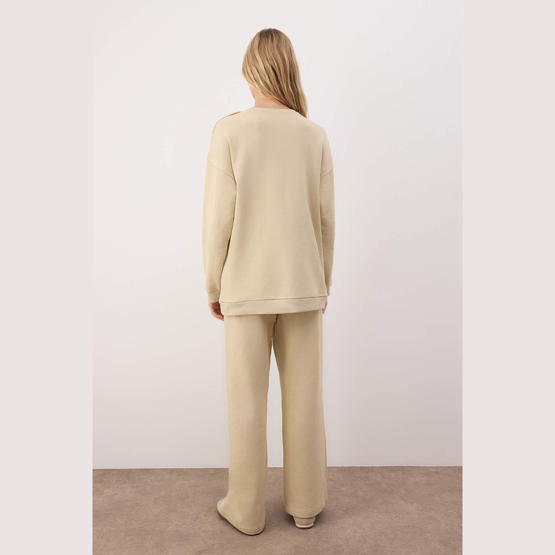 طقم عملي بلون بيج موحد من مجموعة Trendyolmilla Modest – لأناقة يومية مريحة ومحتشمة بلمسة كاجوال ناعمة، يتكون من تونيك طويل بأكمام كاملة وياقة دائرية مع بنطال واسع بخصر مرتفع وقصة مريحة، مصنوع من خامة قطنية سميكة منسوجة بتقنية 3-خيوط (3 İplik Penye) بتركيبة 56% بوليستر، 44% قطن، ما يجعله مثاليًا للأيام الباردة والإطلالات اليومية المحتشمة.