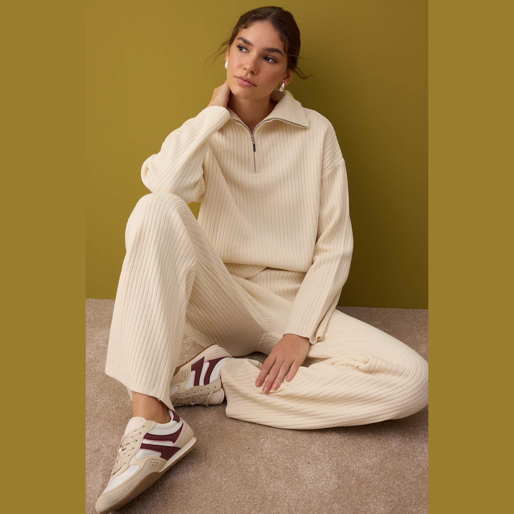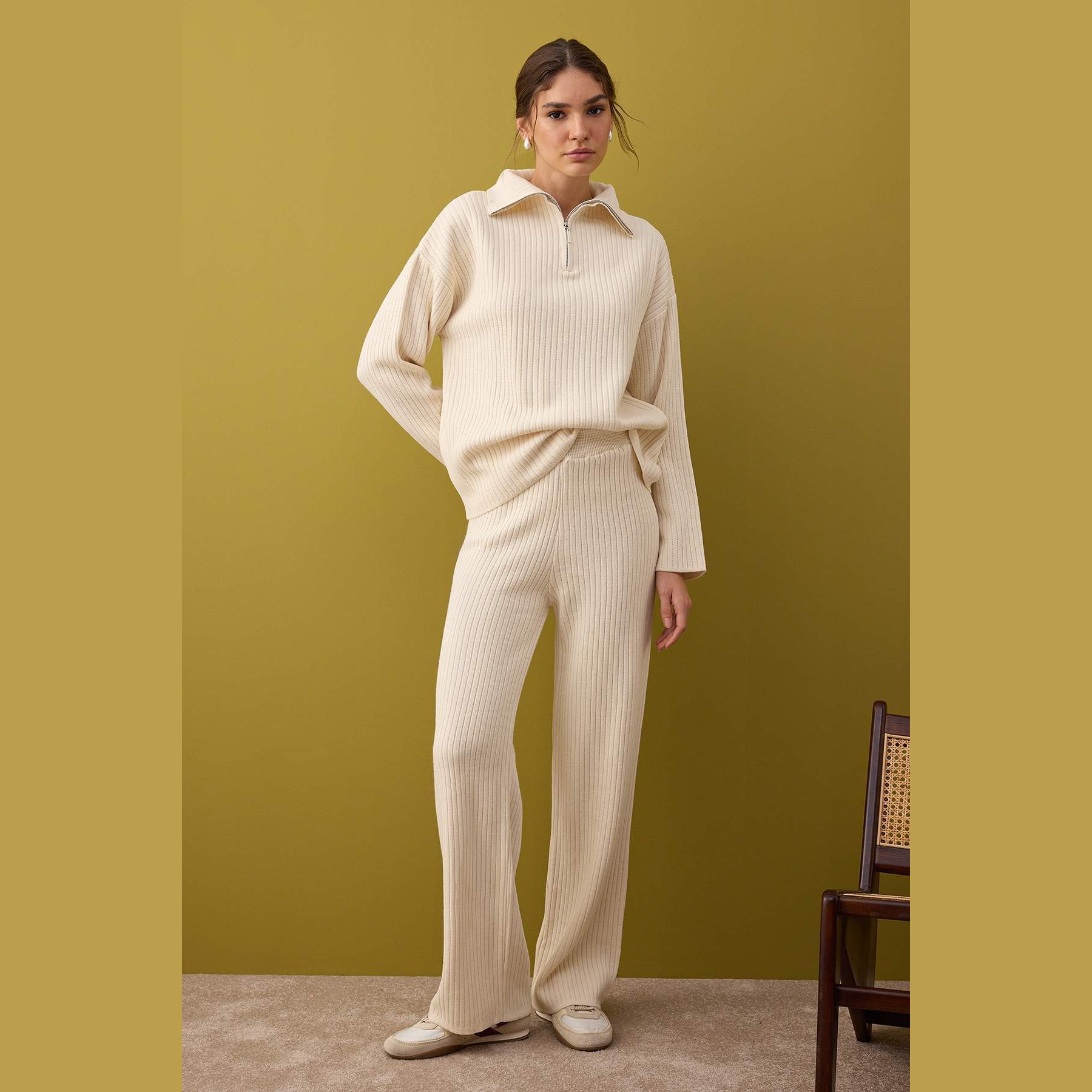 طقم أنيق بلون إكرو موحد من مجموعة Trendyolmilla – لأناقة يومية مريحة وعصرية بلمسة شتوية دافئة، يتكون من كنزة طويلة بسحاب أمامي وياقة عالية مع بنطال واسع بخصر مرتفع وقصة مستقيمة، مصنوع من خامة تريكو متوسطة السماكة بتركيبة 100% أكريليك، ما يجعله مثاليًا للأجواء الباردة والإطلالات الكاجوال العملية.