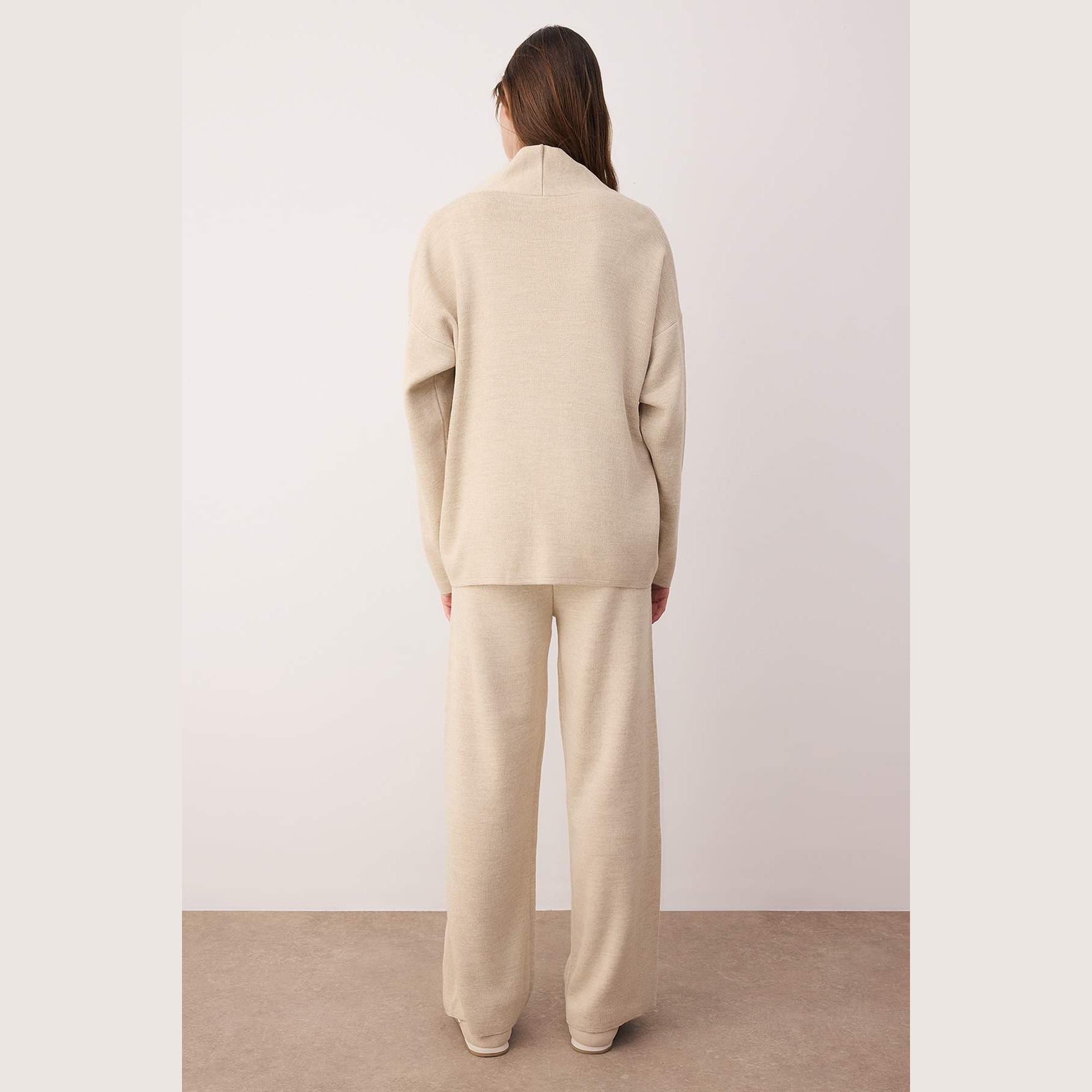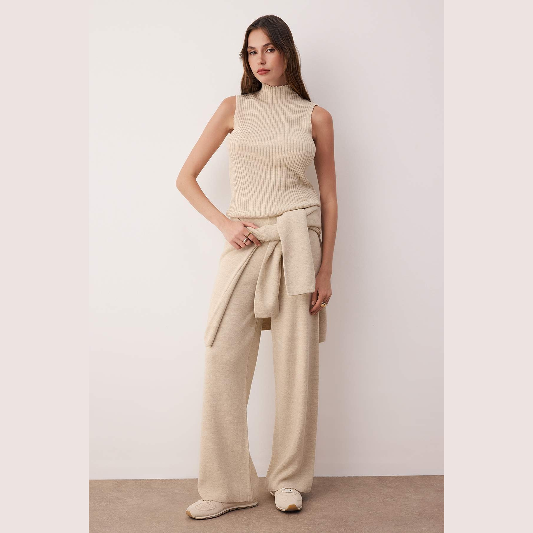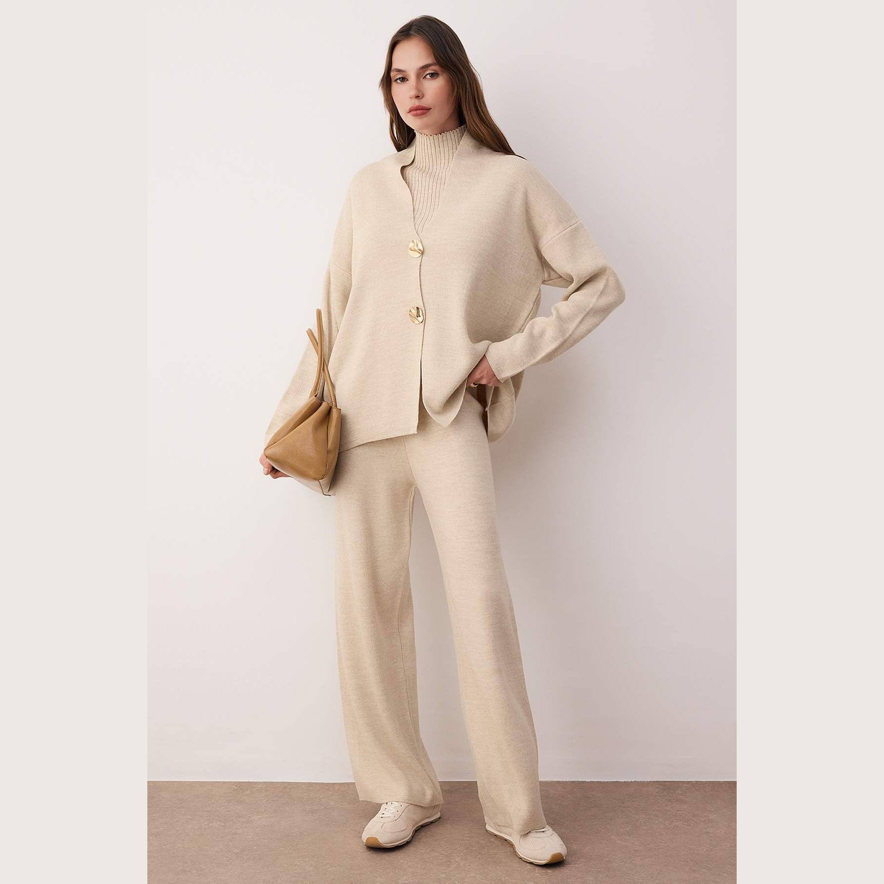طقم ثلاثي أنيق بلون بيج موحد من مجموعة Trendyolmilla – لأناقة شتوية دافئة ومحتشمة بلمسة فاخرة وعملية، يتكون من كنزة طويلة بأكمام كاملة، بلوزة داخلية ناعمة، وبنطال مستقيم بخصر مرتفع، مصنوع من خامة تريكو متوسطة السماكة بتركيبة 100% أكريليك، ما يجعله مثاليًا للإطلالات اليومية والمناسبات العملية في الأجواء الباردة.