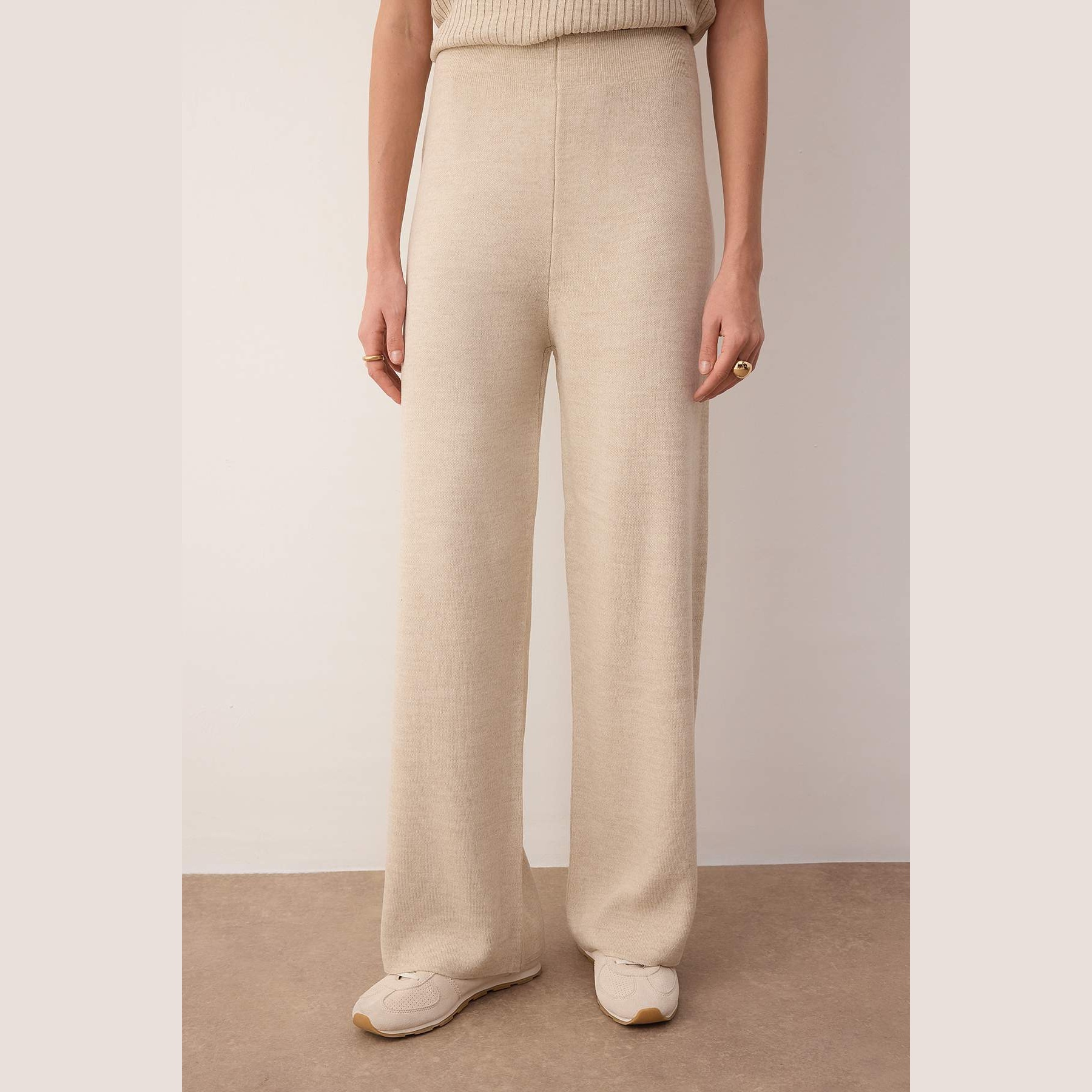 طقم نسائي مكون من كنزة، بلوزة، وبنطال – بيج مزين بإكسسوارات (قماش تريكو، تصميم محتشم)