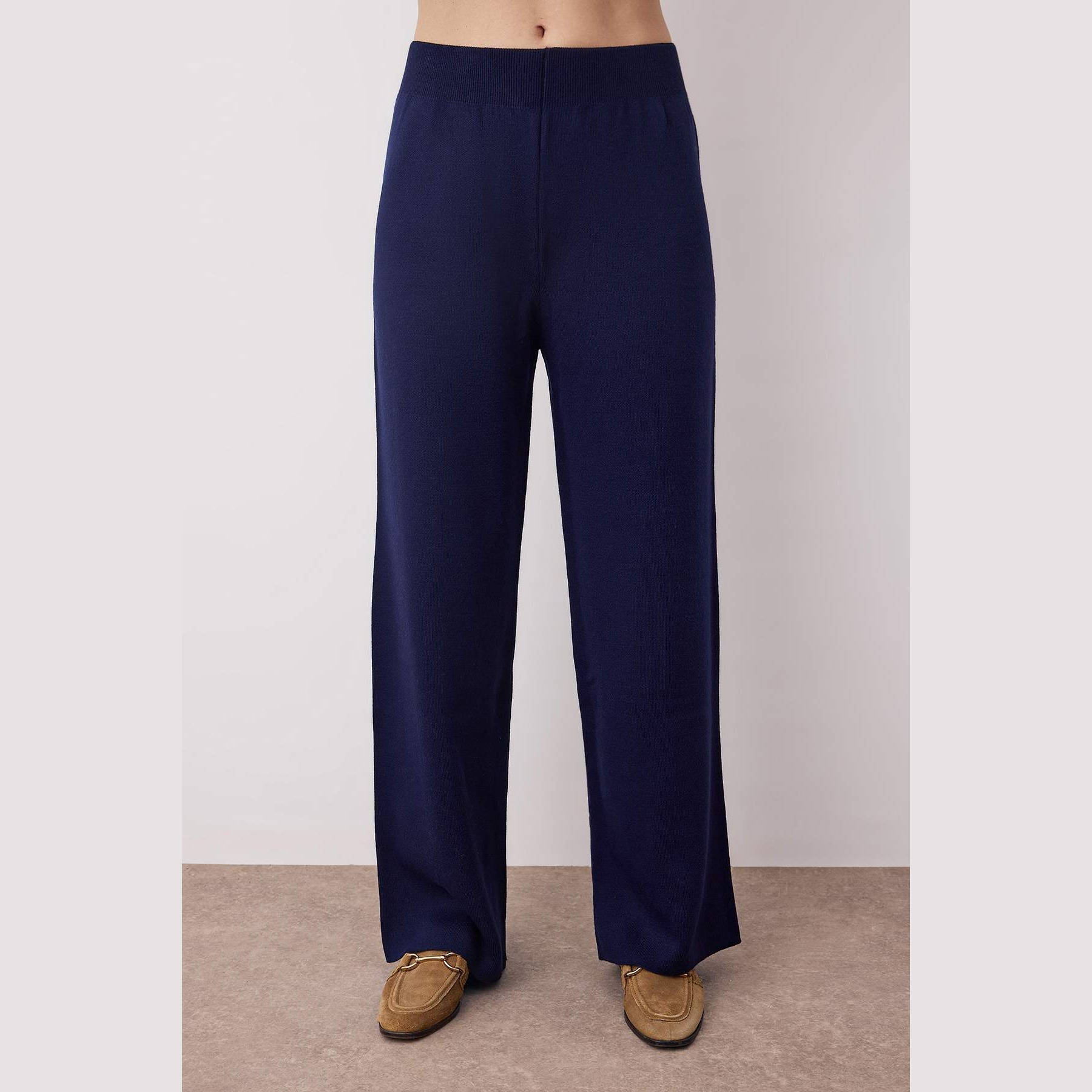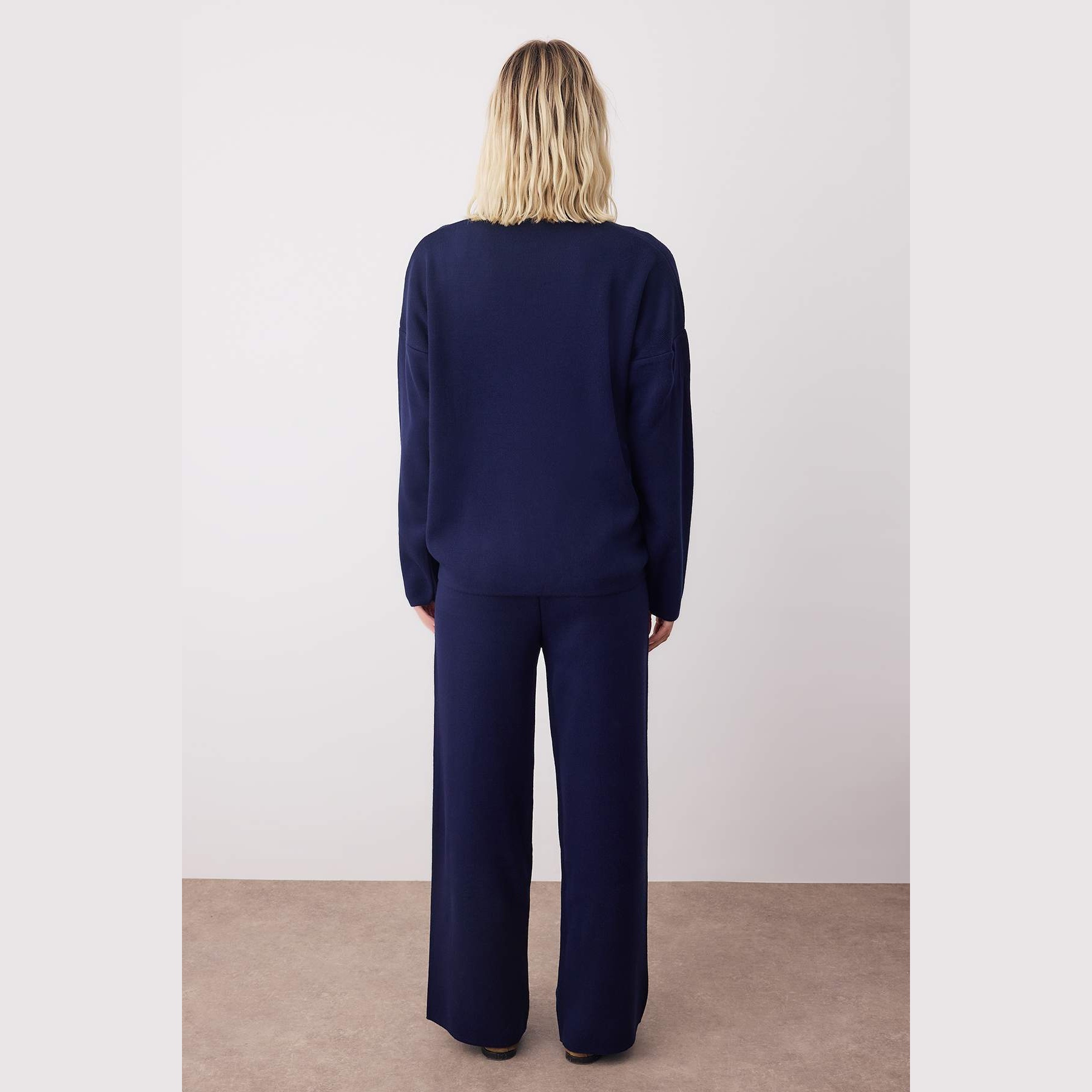 طقم نسائي مكون من كنزة، بلوزة، وبنطال – كحلي مزين بإكسسوارات (قماش تريكو، تصميم محتشم)