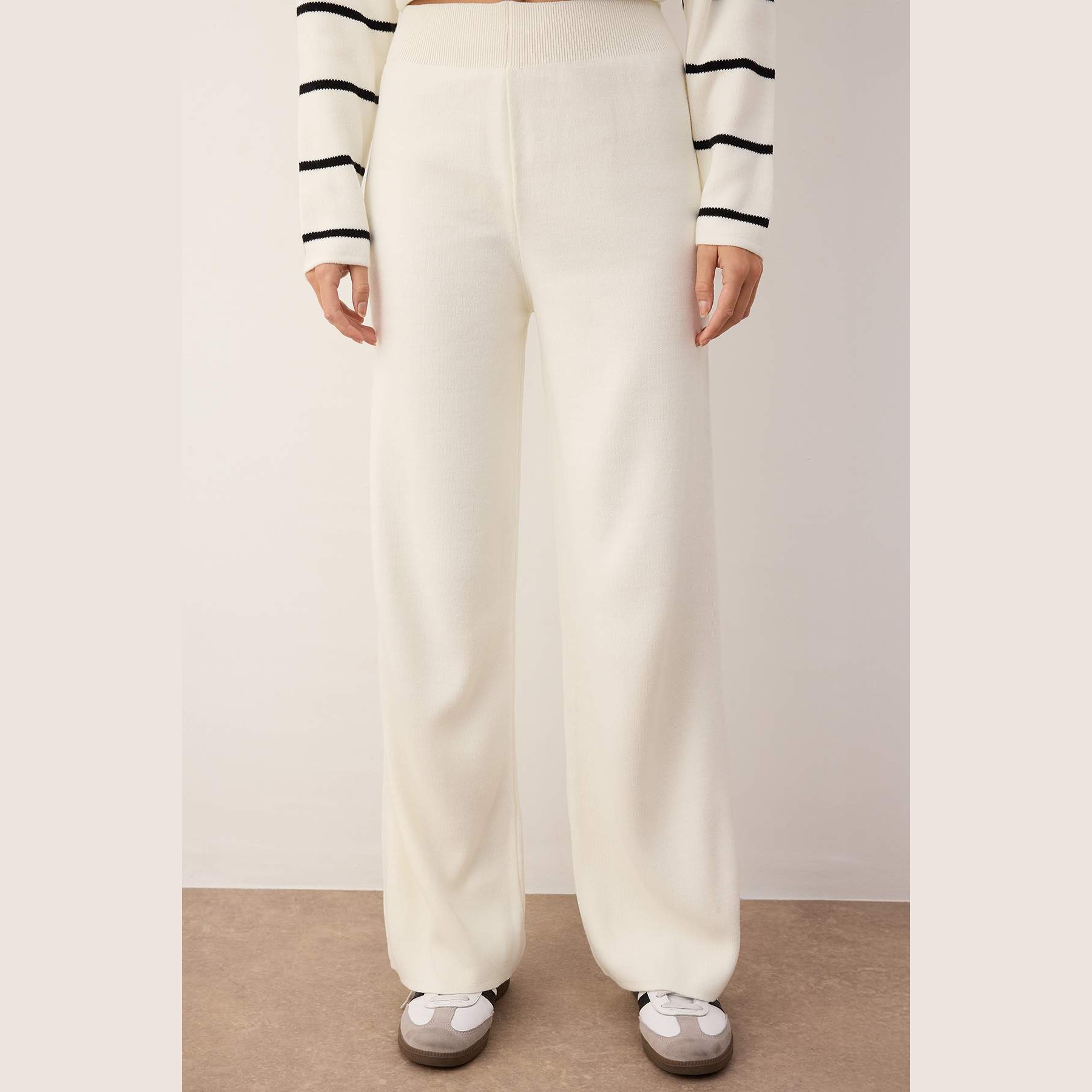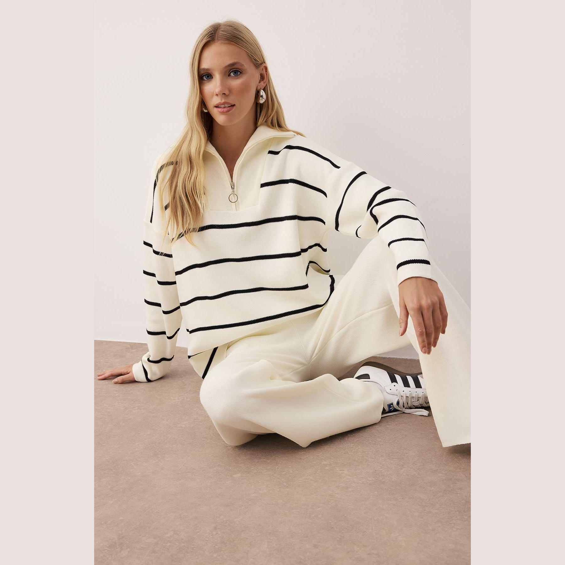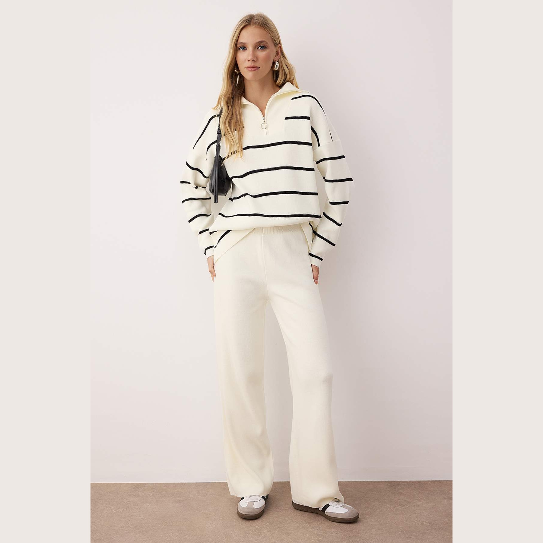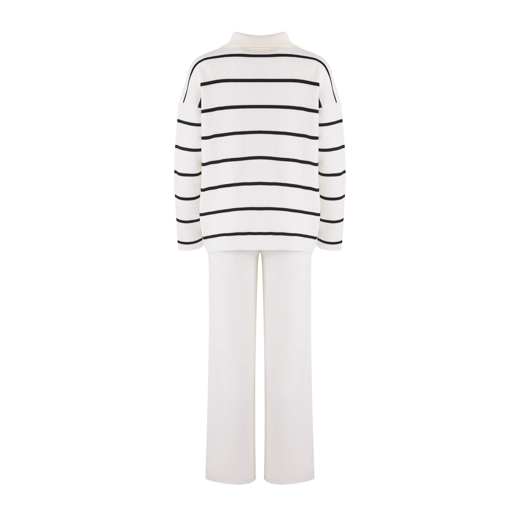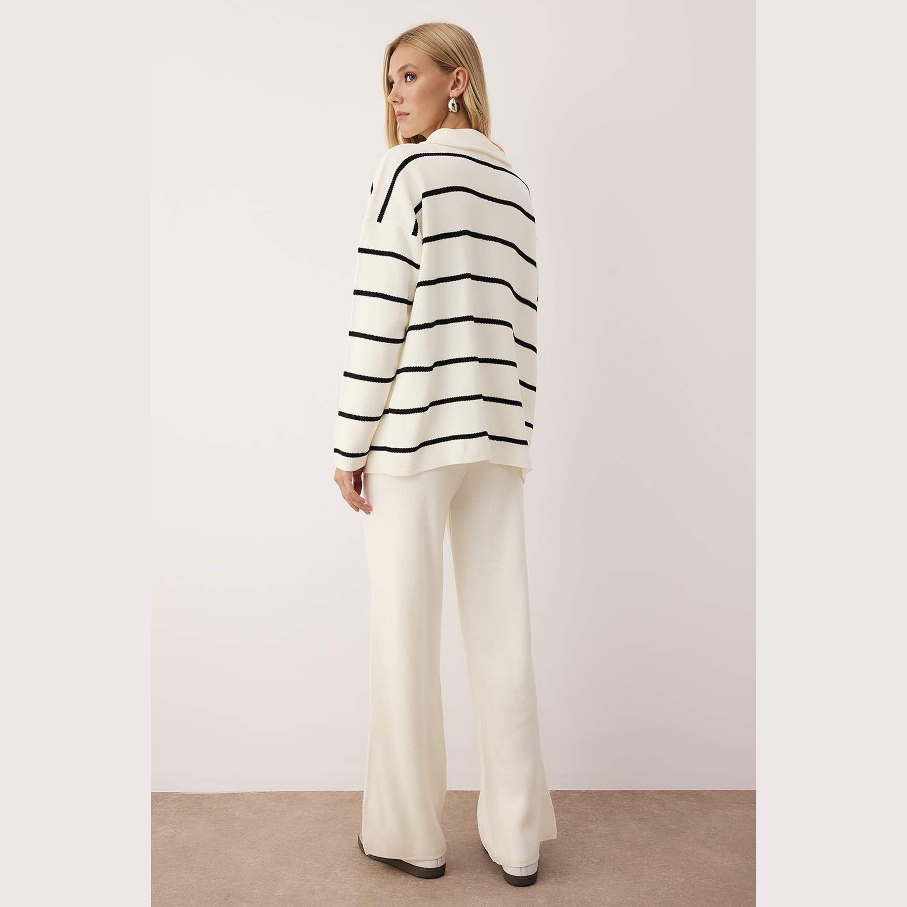 طقم أنيق بلون إكرو موحد من مجموعة Trendyolmilla – لأناقة شتوية مريحة وعصرية بلمسة كاجوال عملية، يتكون من كنزة طويلة بسحاب أمامي وياقة مرتفعة (ديك ياكا) مع بنطال واسع بخصر مرتفع وقصة فضفاضة (Oversize)، مصنوع من خامة تريكو متوسطة السماكة بتركيبة 100% أكريليك، ما يجعله مثاليًا للأيام الباردة والإطلالات اليومية.