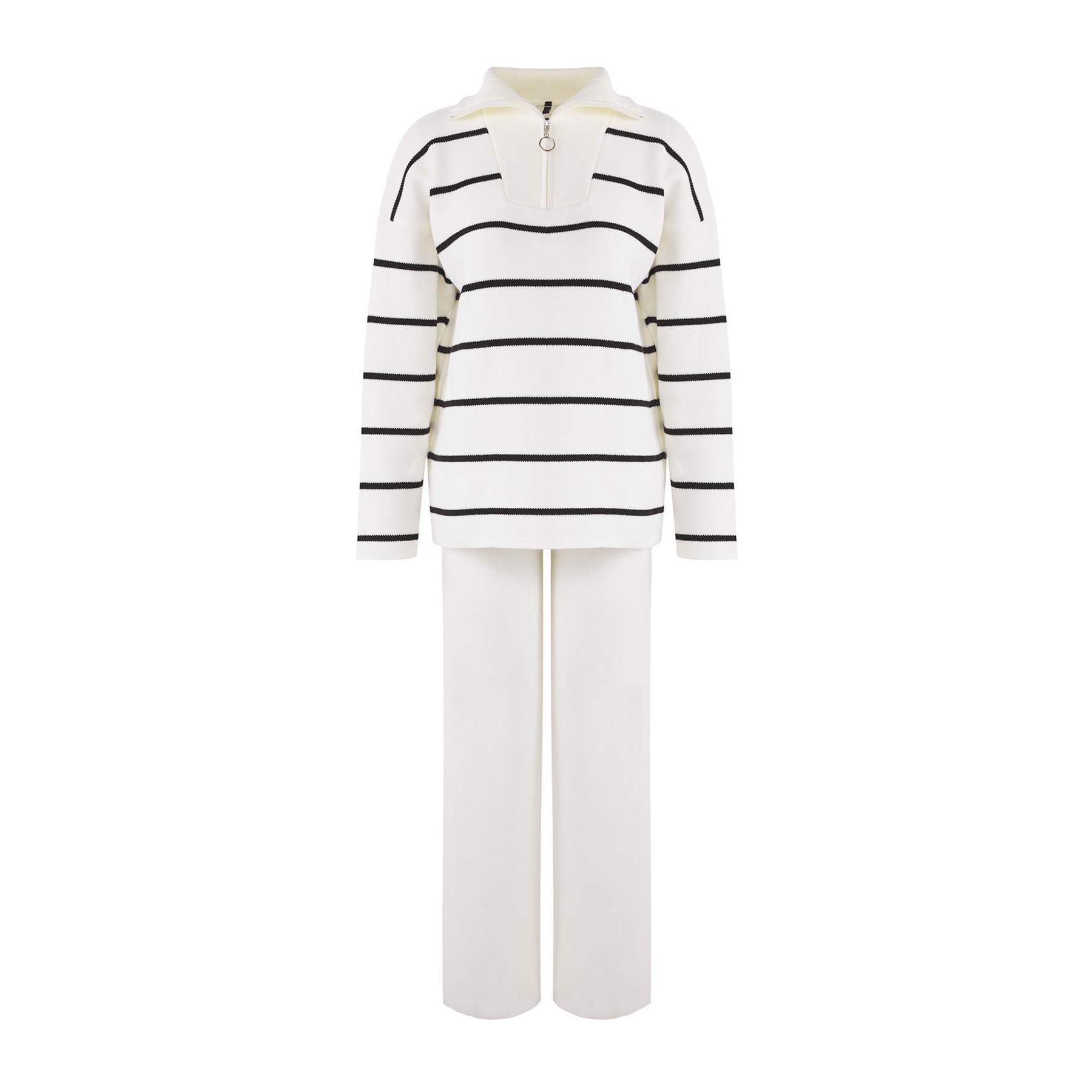 طقم نسائي مكون من كنزة وبنطال – إكرو بقصة واسعة وسحاب أمامي (قماش تريكو، تصميم عملي)