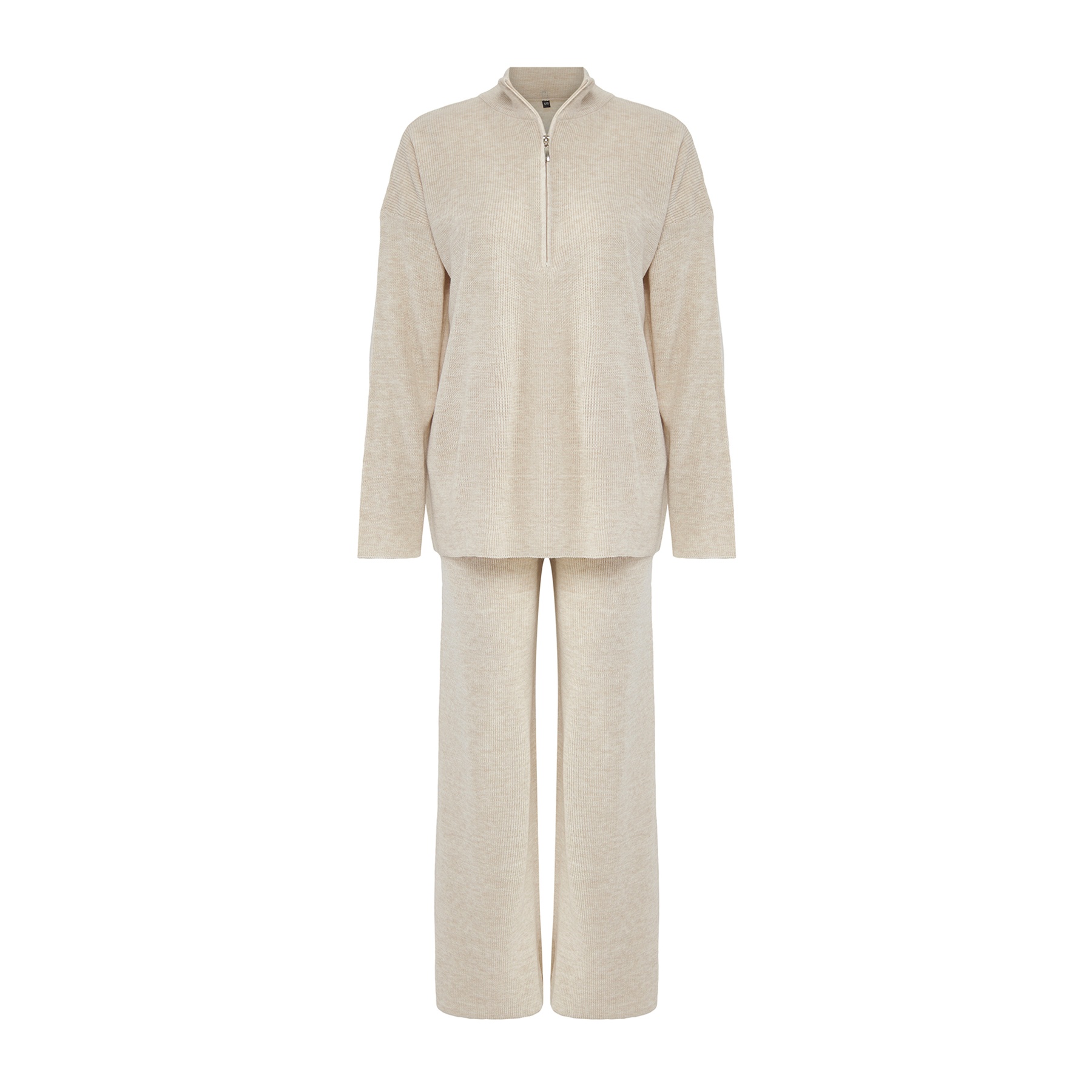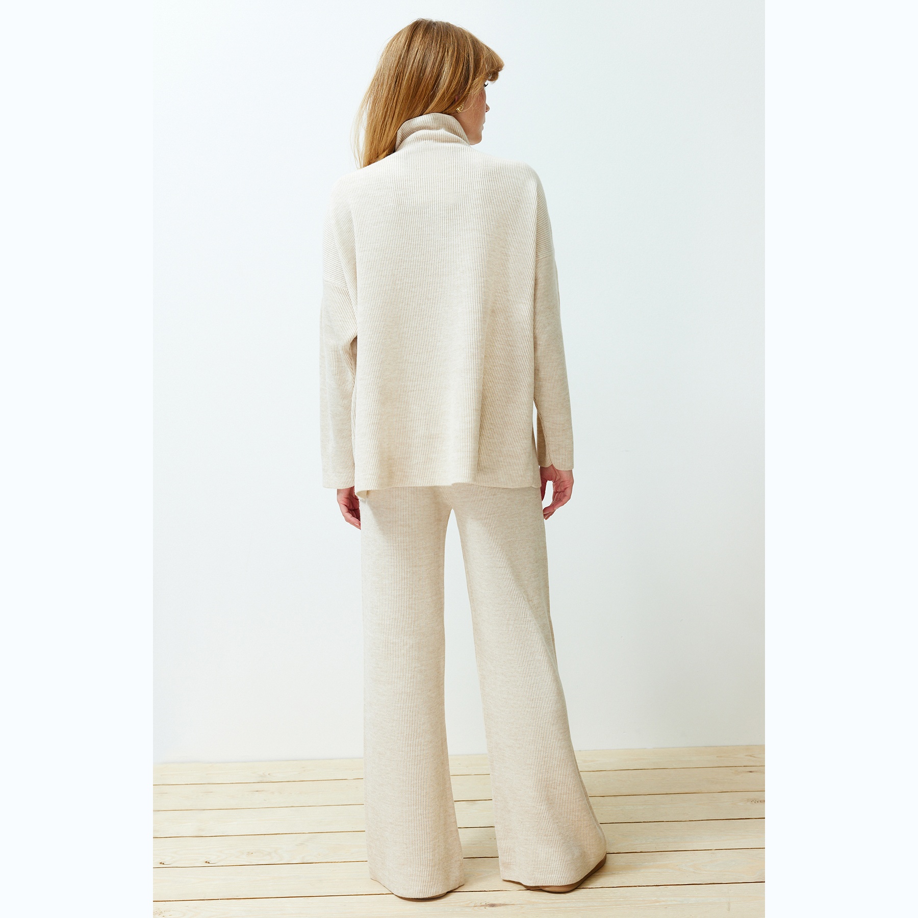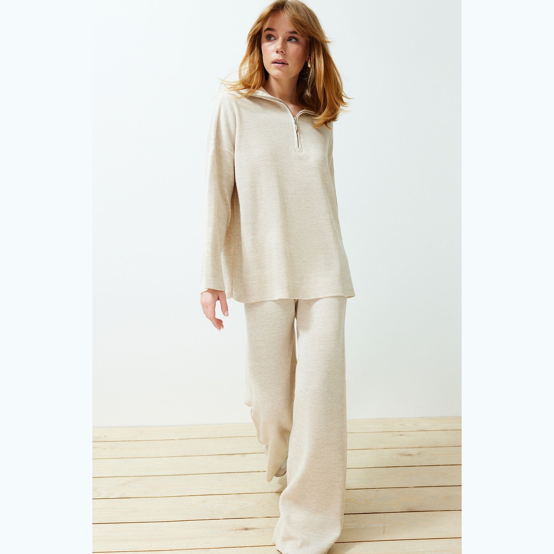 طقم عملي بلون إكرو موحد من مجموعة Trendyolmilla Basic – لأناقة يومية مريحة وعصرية بلمسة شتوية ناعمة، يتكون من كنزة طويلة بسحاب أمامي وياقة مرتفعة (ديك ياكا) مع بنطال واسع بخصر مرتفع وقصة فضفاضة (Regular Fit)، مصنوع من خامة تريكو متوسطة السماكة بتركيبة 100% أكريليك، ما يجعله مثاليًا للأيام الباردة والإطلالات الكاجوال المحتشمة.