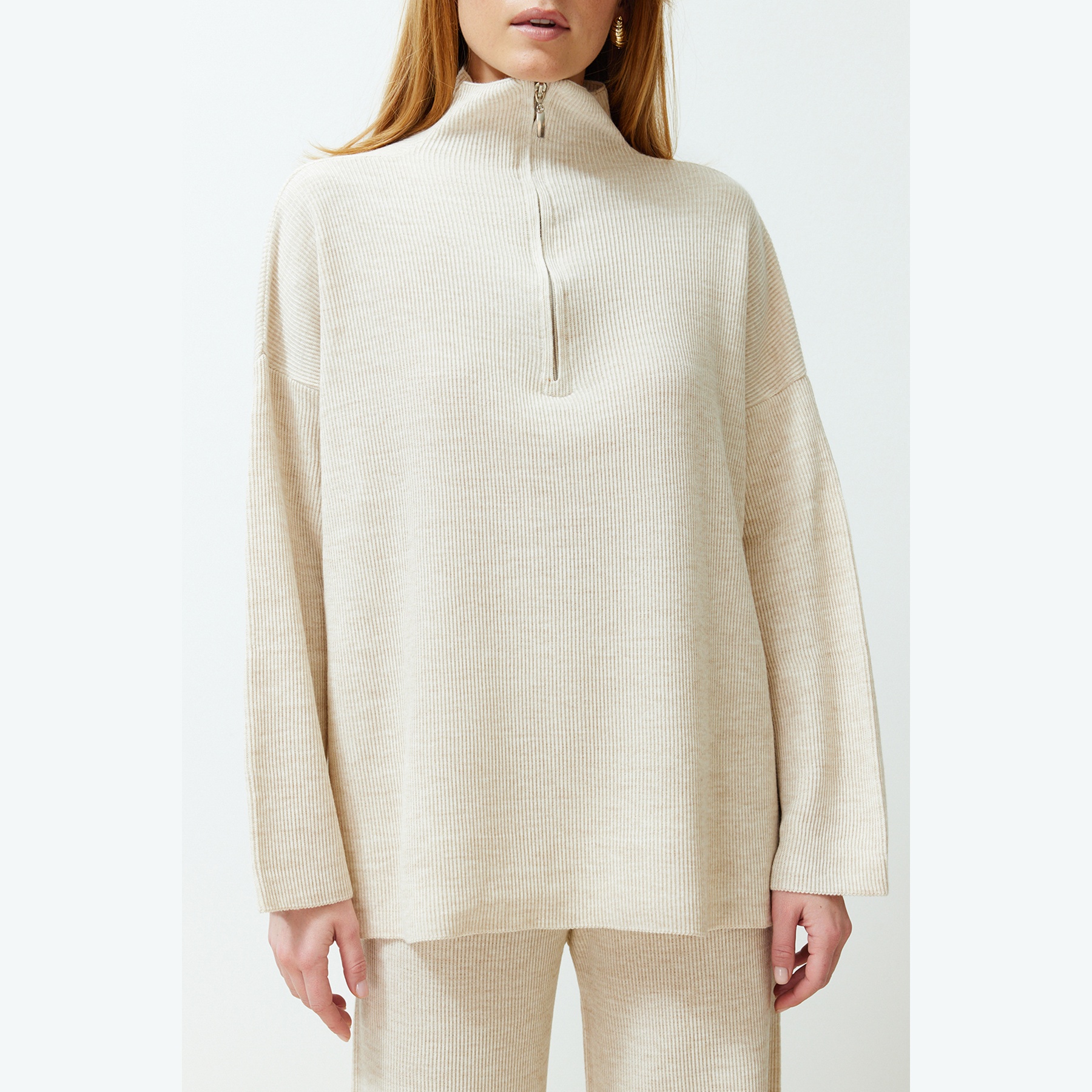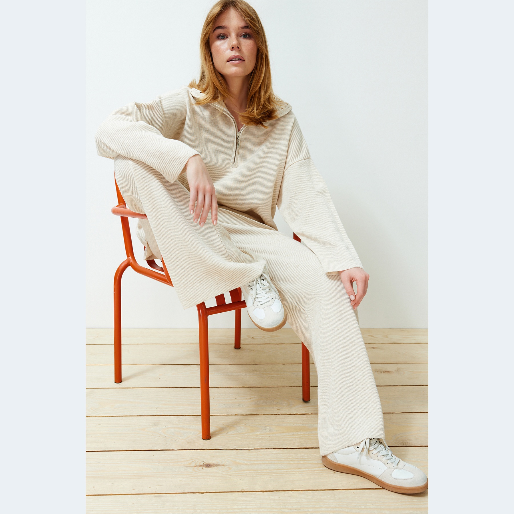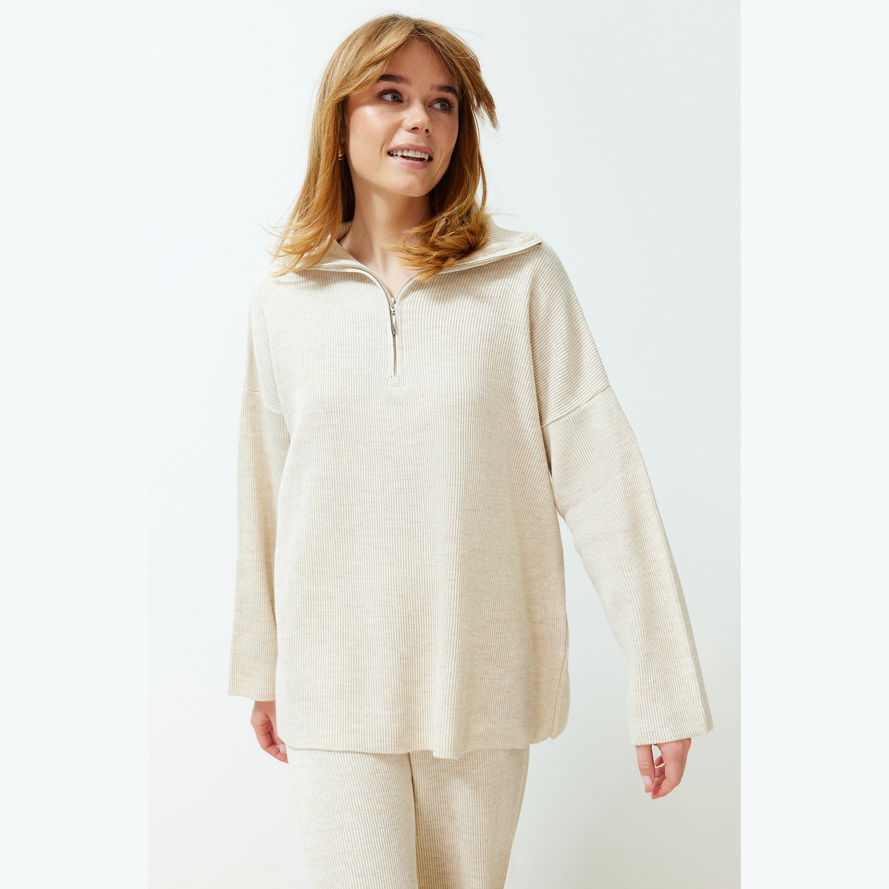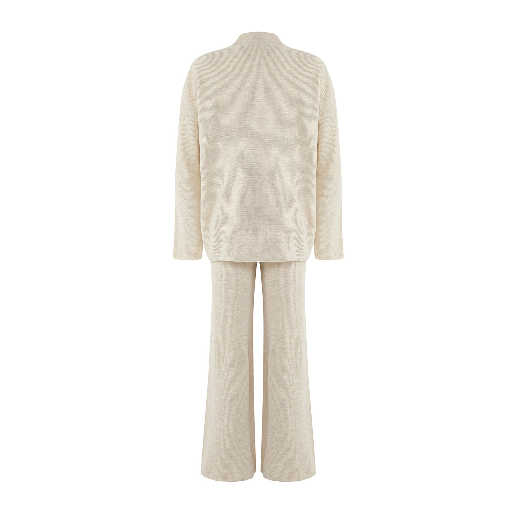 طقم عملي بلون إكرو موحد من مجموعة Trendyolmilla Basic – لأناقة يومية مريحة وعصرية بلمسة شتوية ناعمة، يتكون من كنزة طويلة بسحاب أمامي وياقة مرتفعة (ديك ياكا) مع بنطال واسع بخصر مرتفع وقصة فضفاضة (Regular Fit)، مصنوع من خامة تريكو متوسطة السماكة بتركيبة 100% أكريليك، ما يجعله مثاليًا للأيام الباردة والإطلالات الكاجوال المحتشمة.
