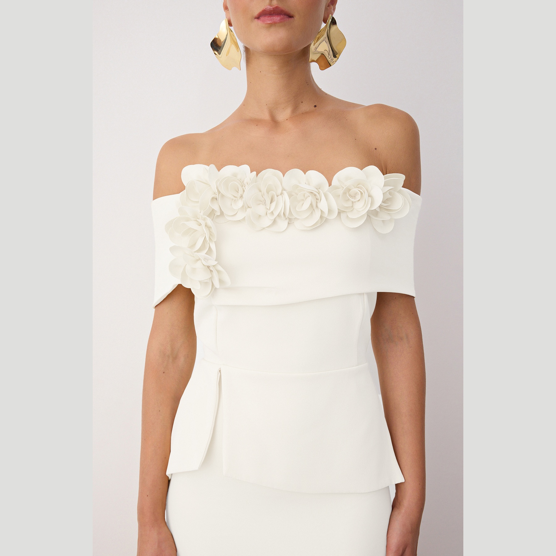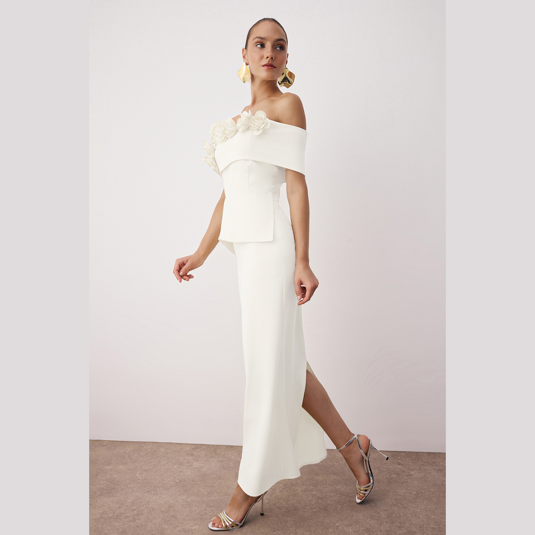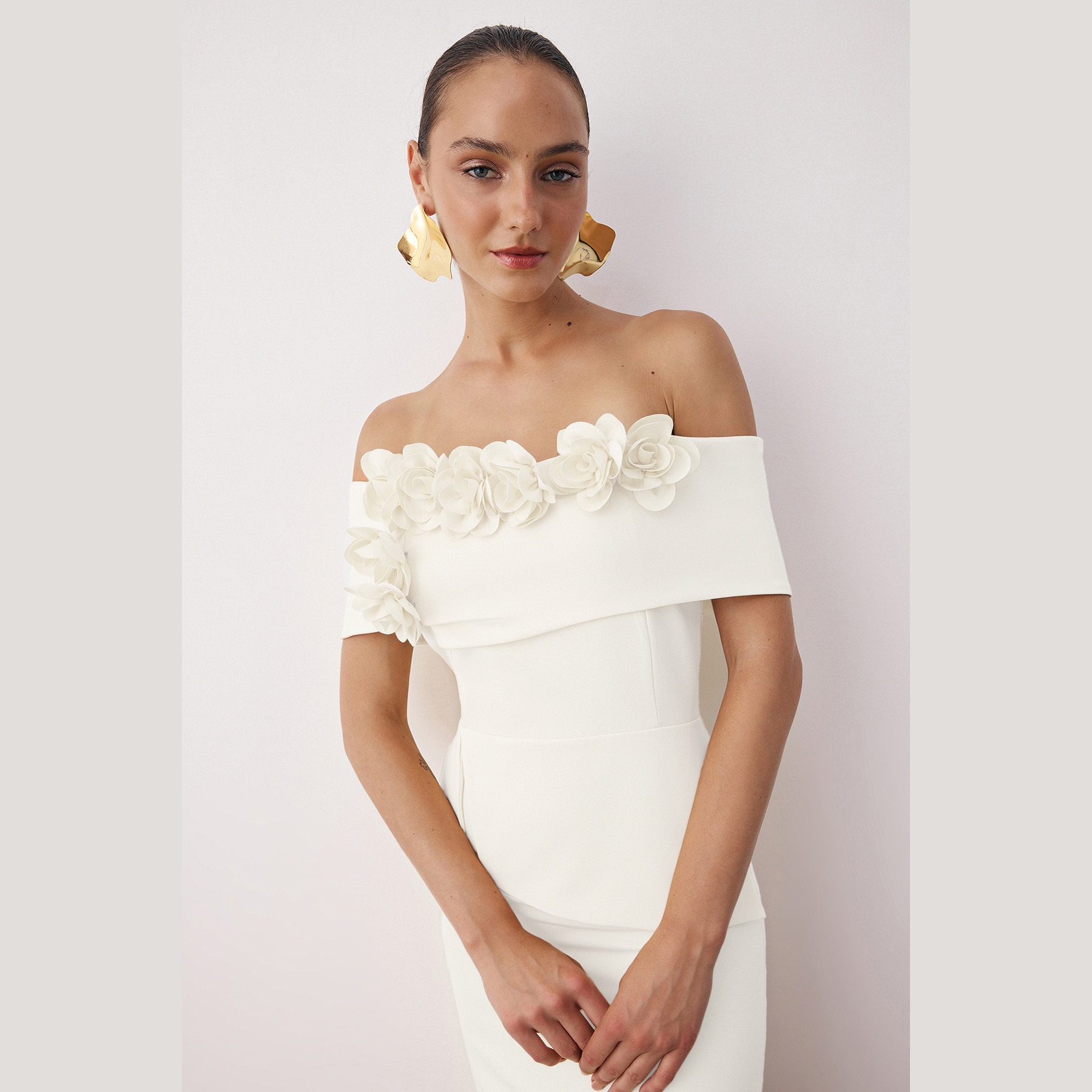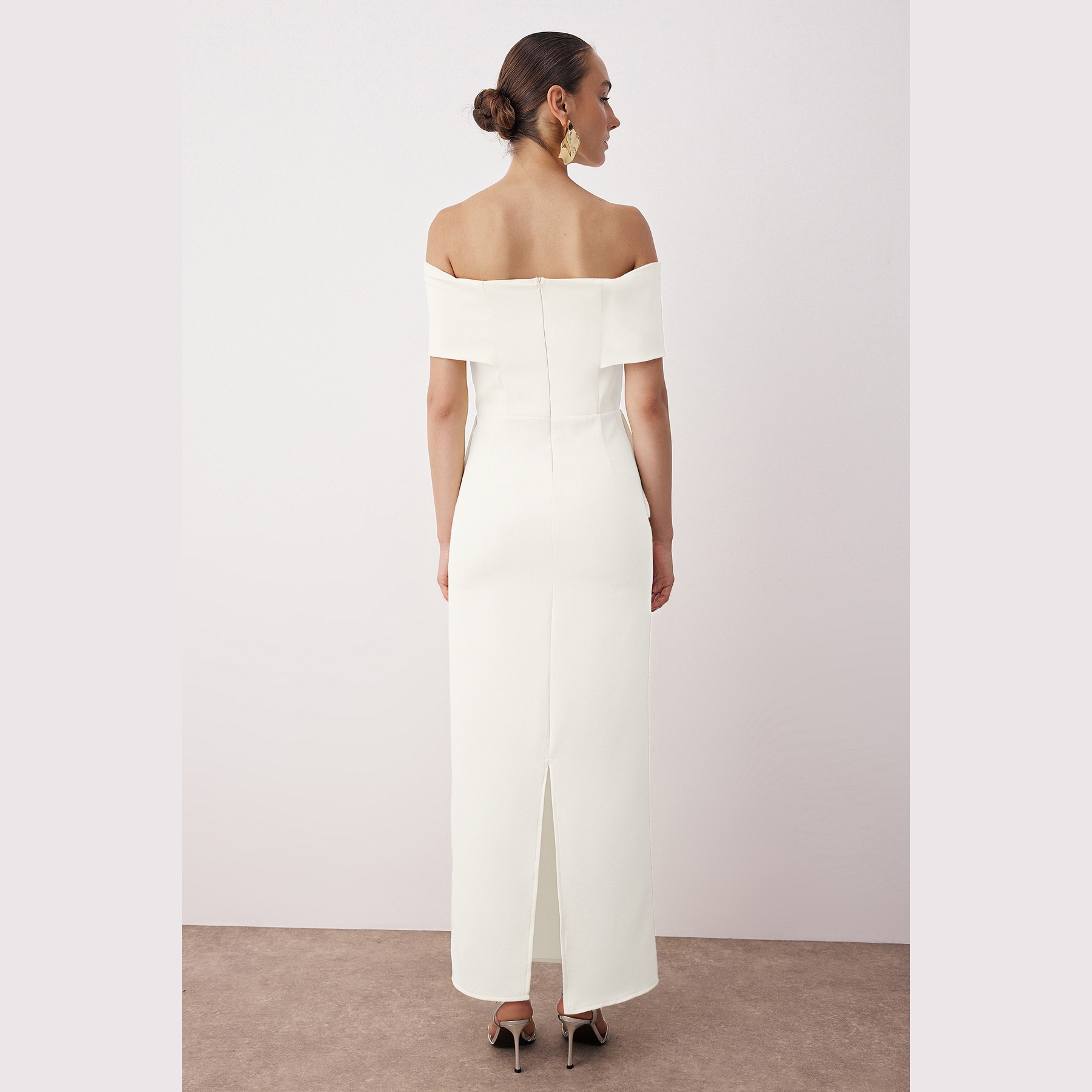 فستان نسائي – أبيض طويل بياقة كارمن من خامة دوكوم Finike (إطلالة ملكية للمناسبات الخاصة)