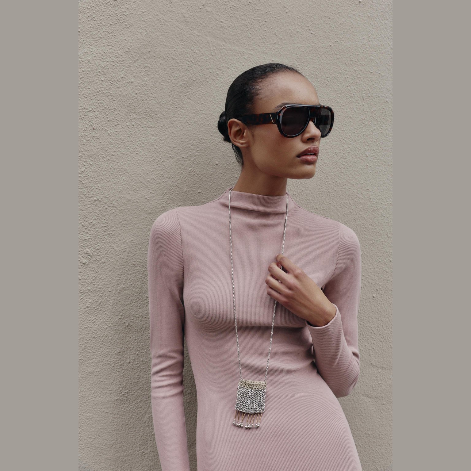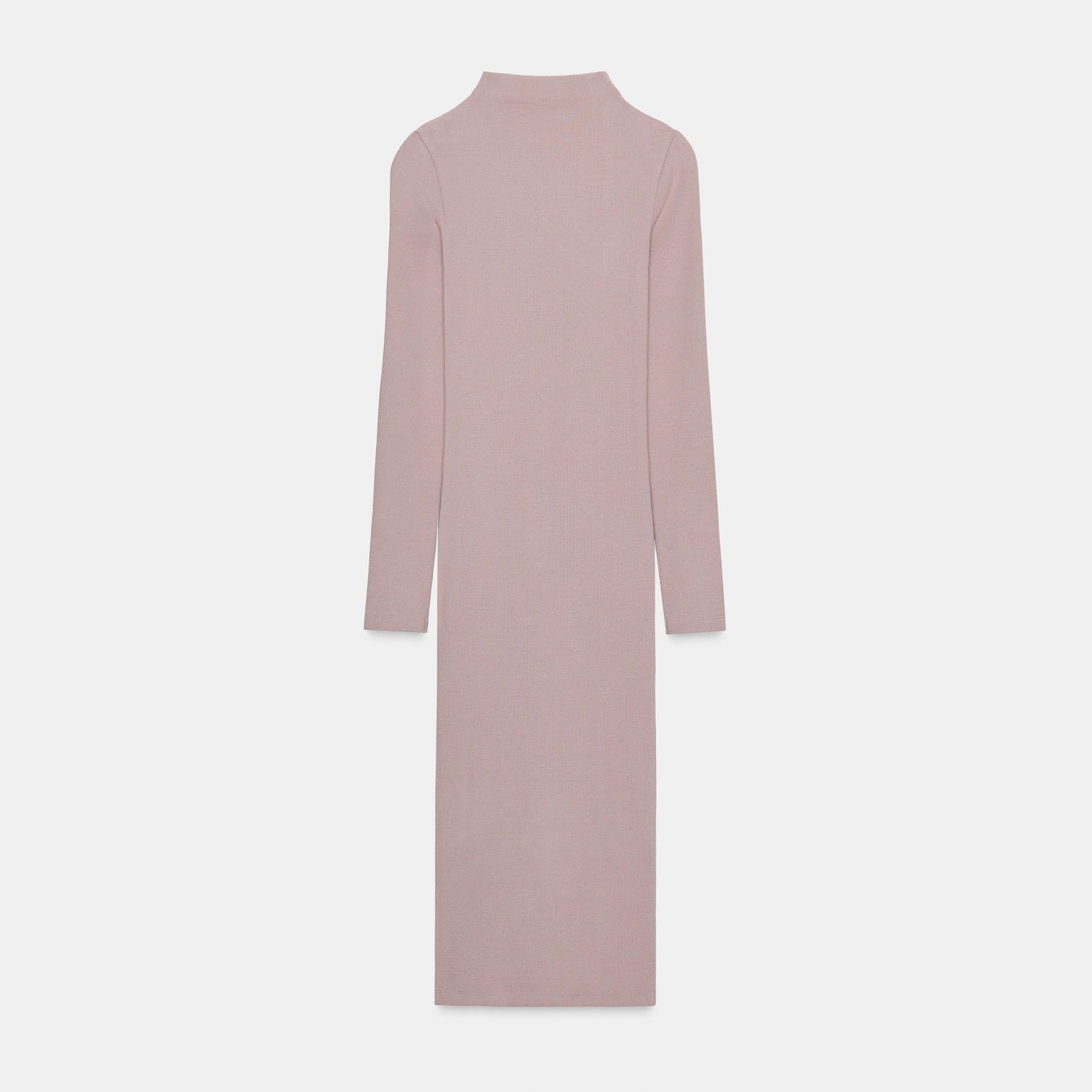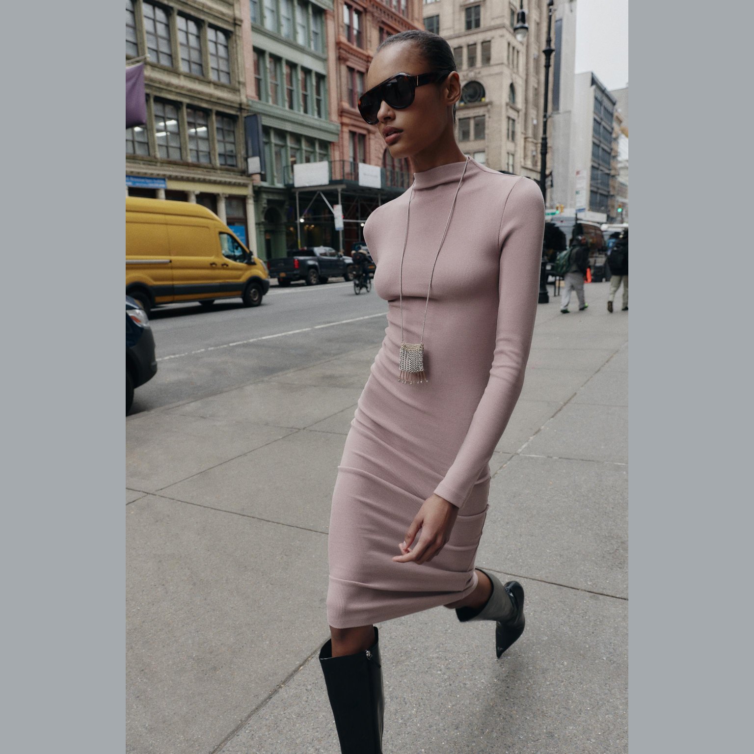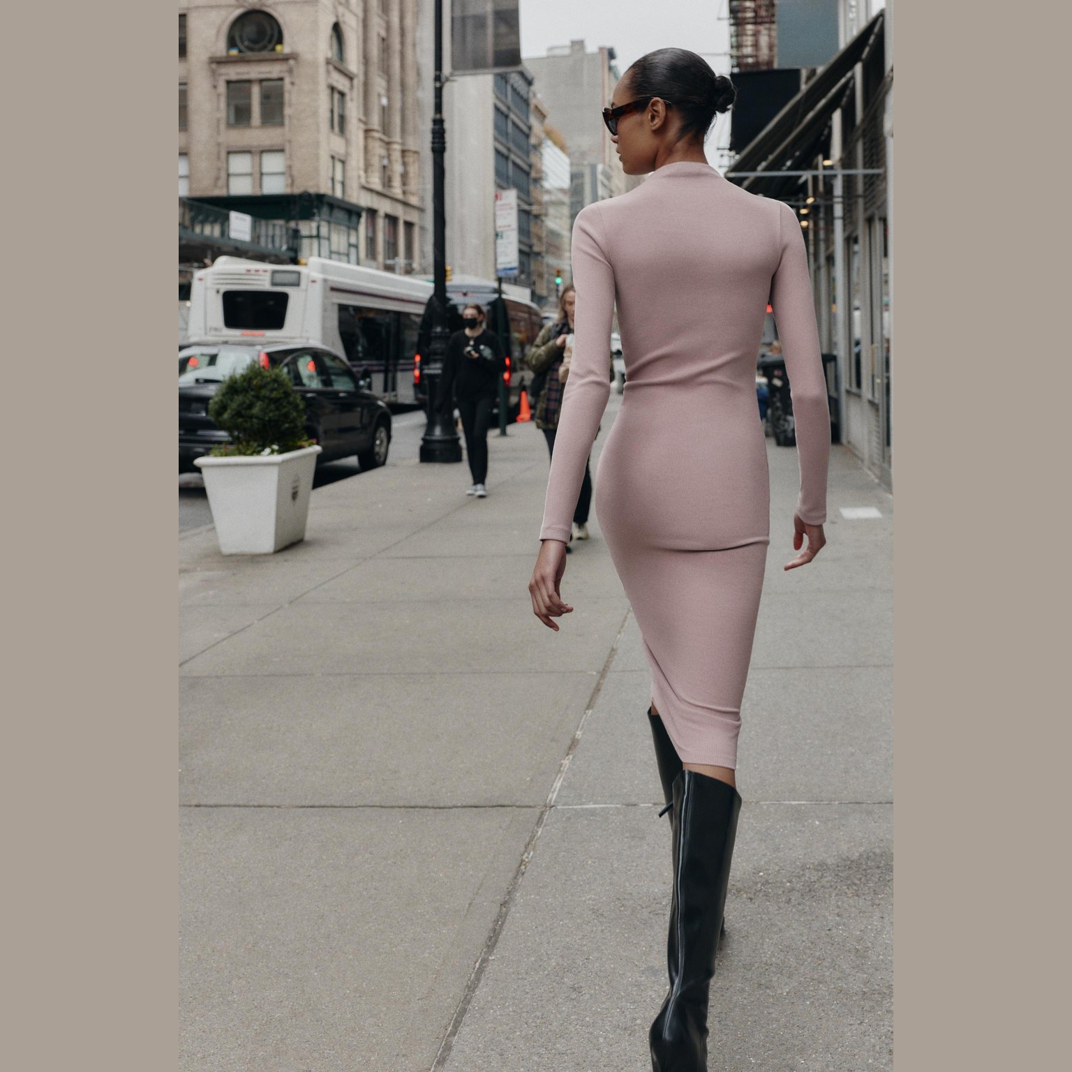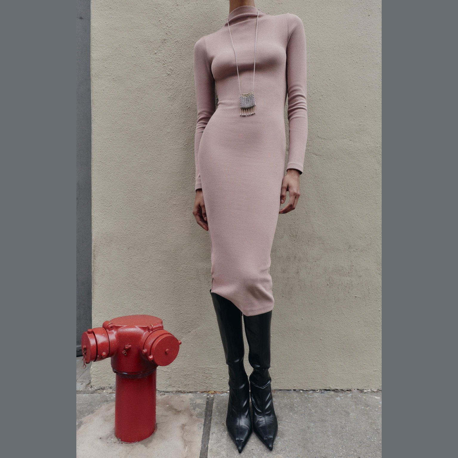 فستان ميدي محبوك بقماش مضلع – لون طبيعي (زهري باهت) – Dusty Pink (Ribbed Midi Dress) فستان أنيق بلون زهري باهت طبيعي، مصنوع من خامة محبوكة بخليط قطن وإيلاستان يمنح راحة ومرونة، بتصميم بياقة عالية وأكمام طويلة. يتميز بقماش مضلع ناعم وقصة مستقيمة بطول ميدي، مما يمنح إطلالة أنثوية عصرية. قطعة مثالية للتنسيقات اليومية الكاجوال الأنيقة أو كإطلالة أساسية في المناسبات المسائية.