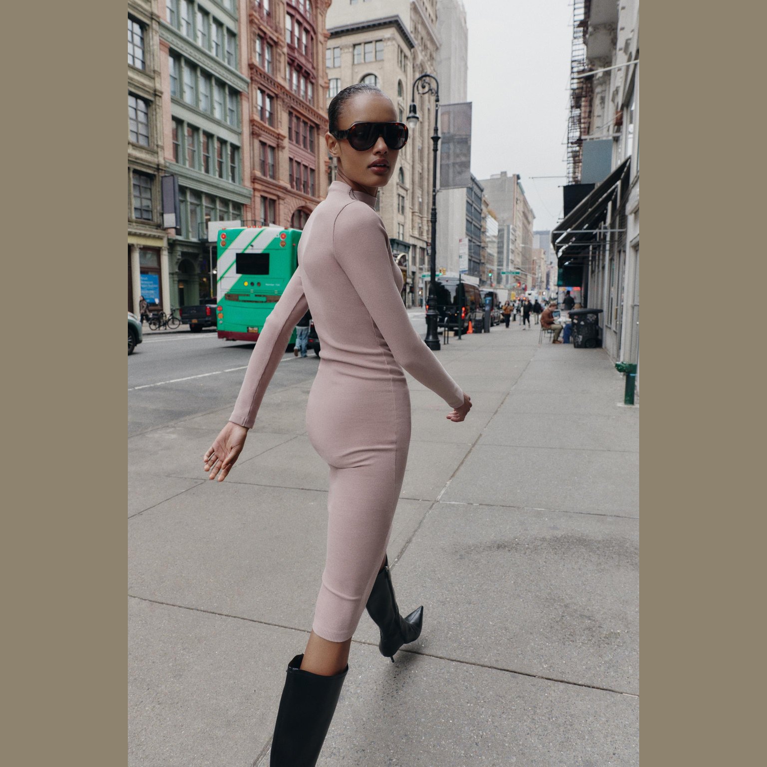 - التصميم: فستان ميدي محبوك بقماش مضلع (Ribbed Midi Dress)