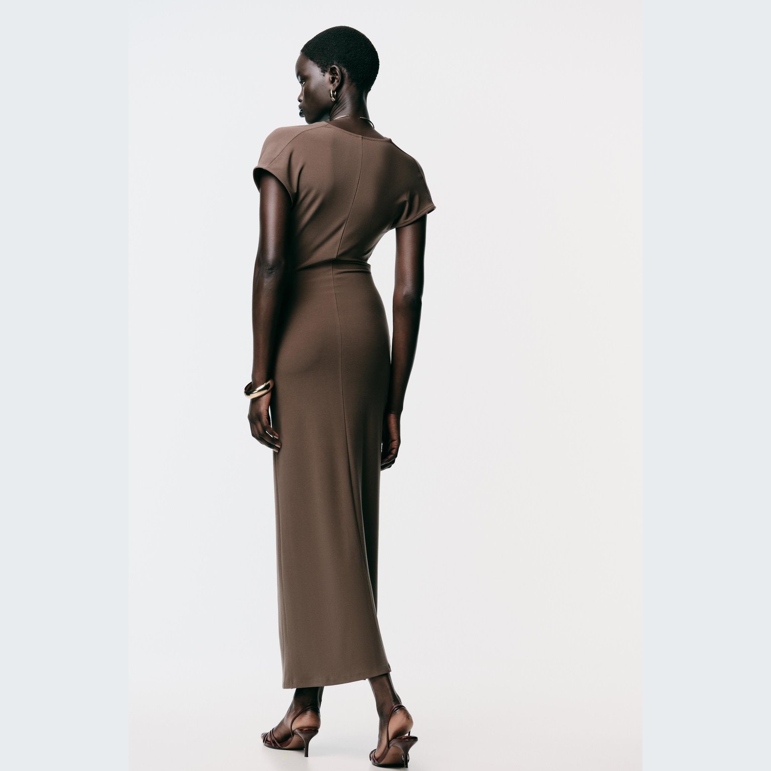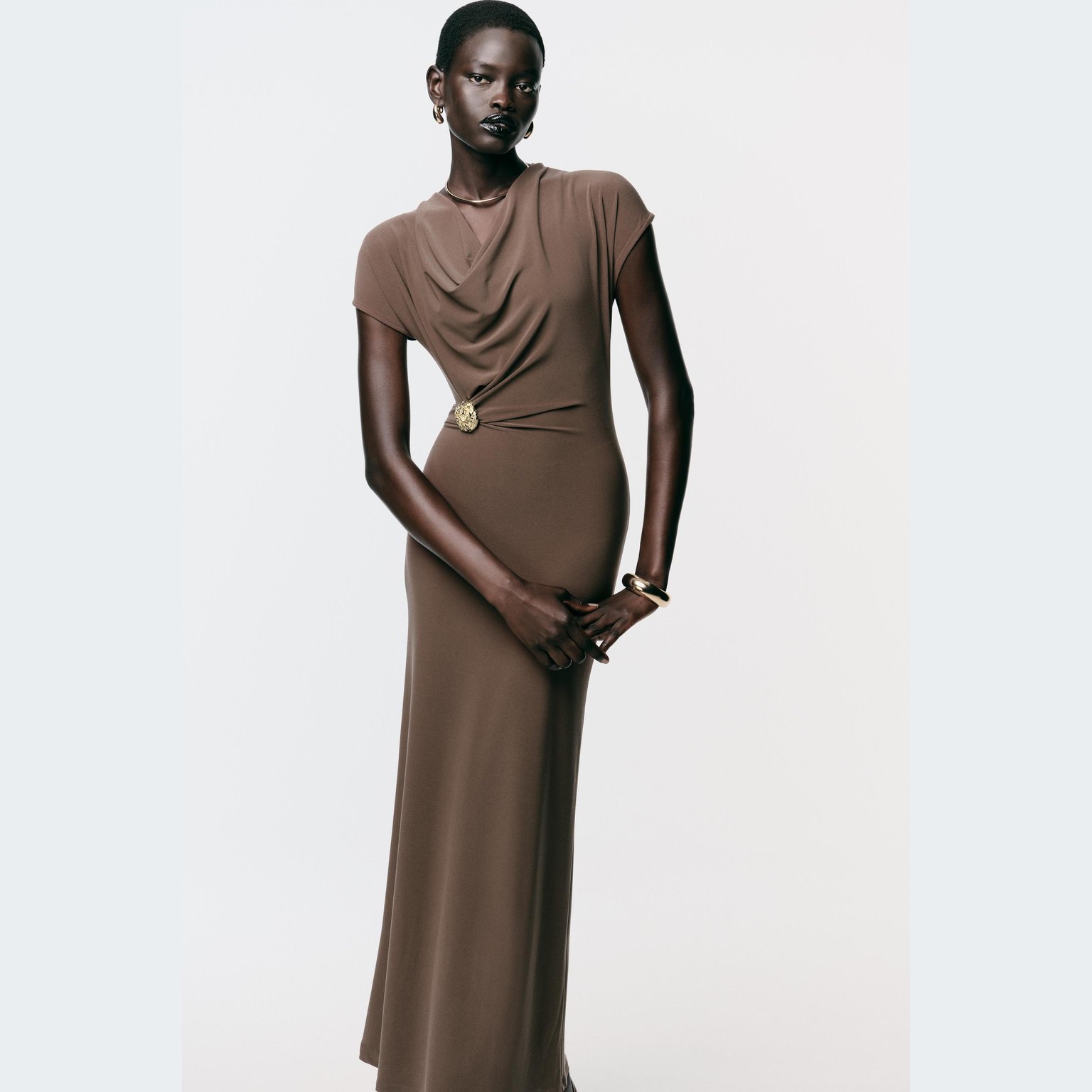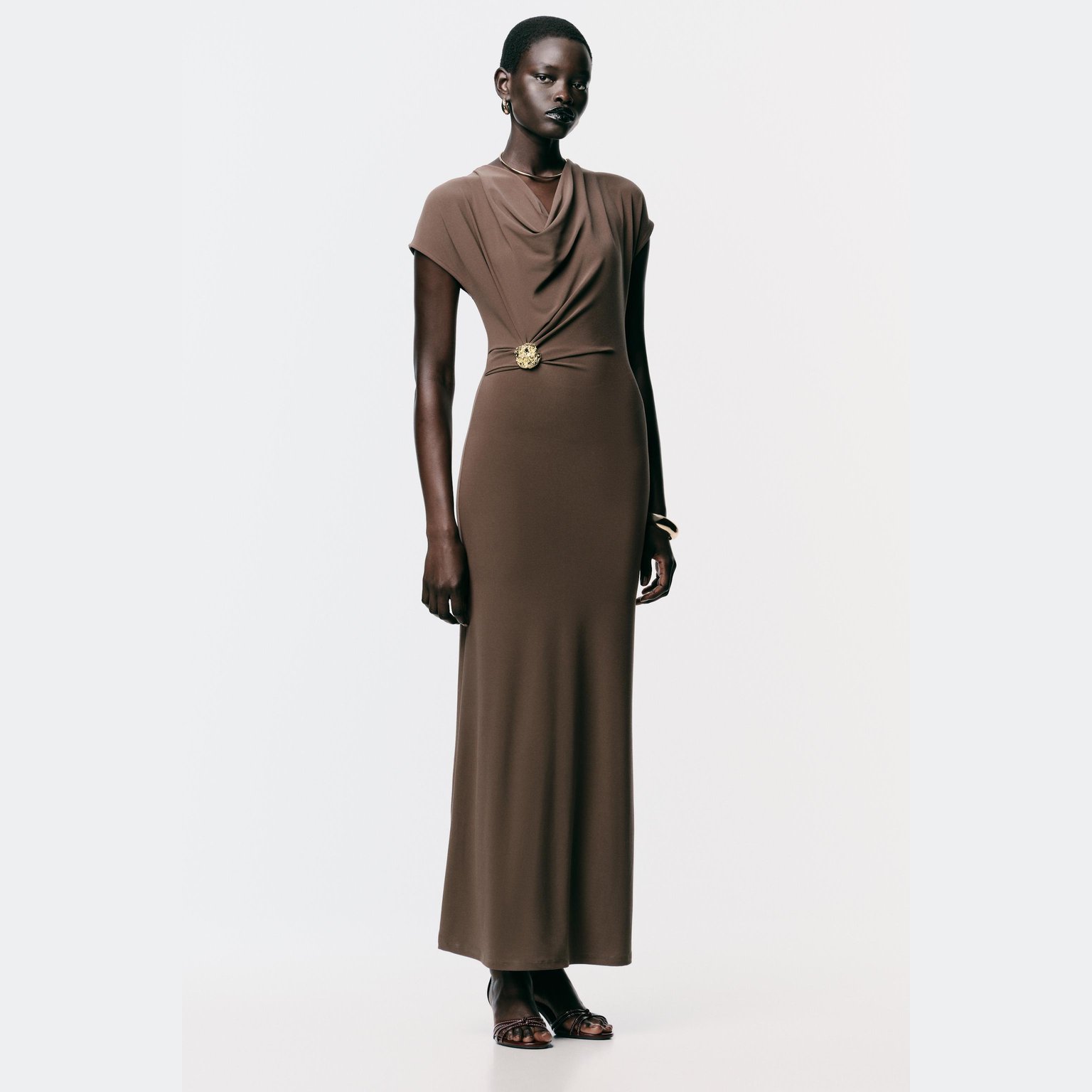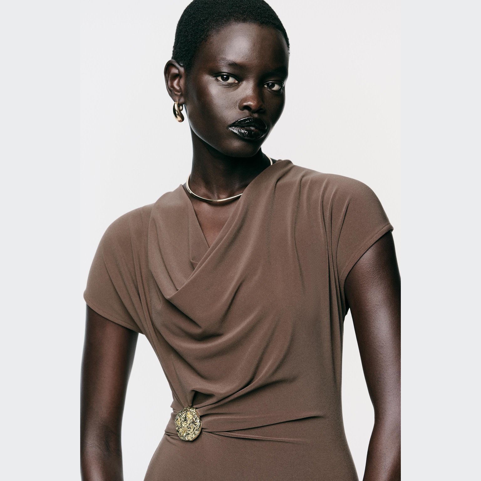 فستان درابيه مع تفاصيل معدنية – لون طبيعي (بني) – Brown (Draped Dress with Hardware) فستان أنيق بلون بني طبيعي، مصنوع من خامة محبوكة بخليط بوليستر وإيلاستان يمنح مرونة وانسيابية، بتصميم بياقة متدفقة وأكمام ساقطة. يتميز بتفاصيل درابيه أمامية مع قطعة معدنية بارزة تضيف لمسة عصرية أنثوية، وحافة مستقيمة بطول قصير. قطعة مثالية للتنسيقات المسائية الأنيقة أو المناسبات الخاصة.