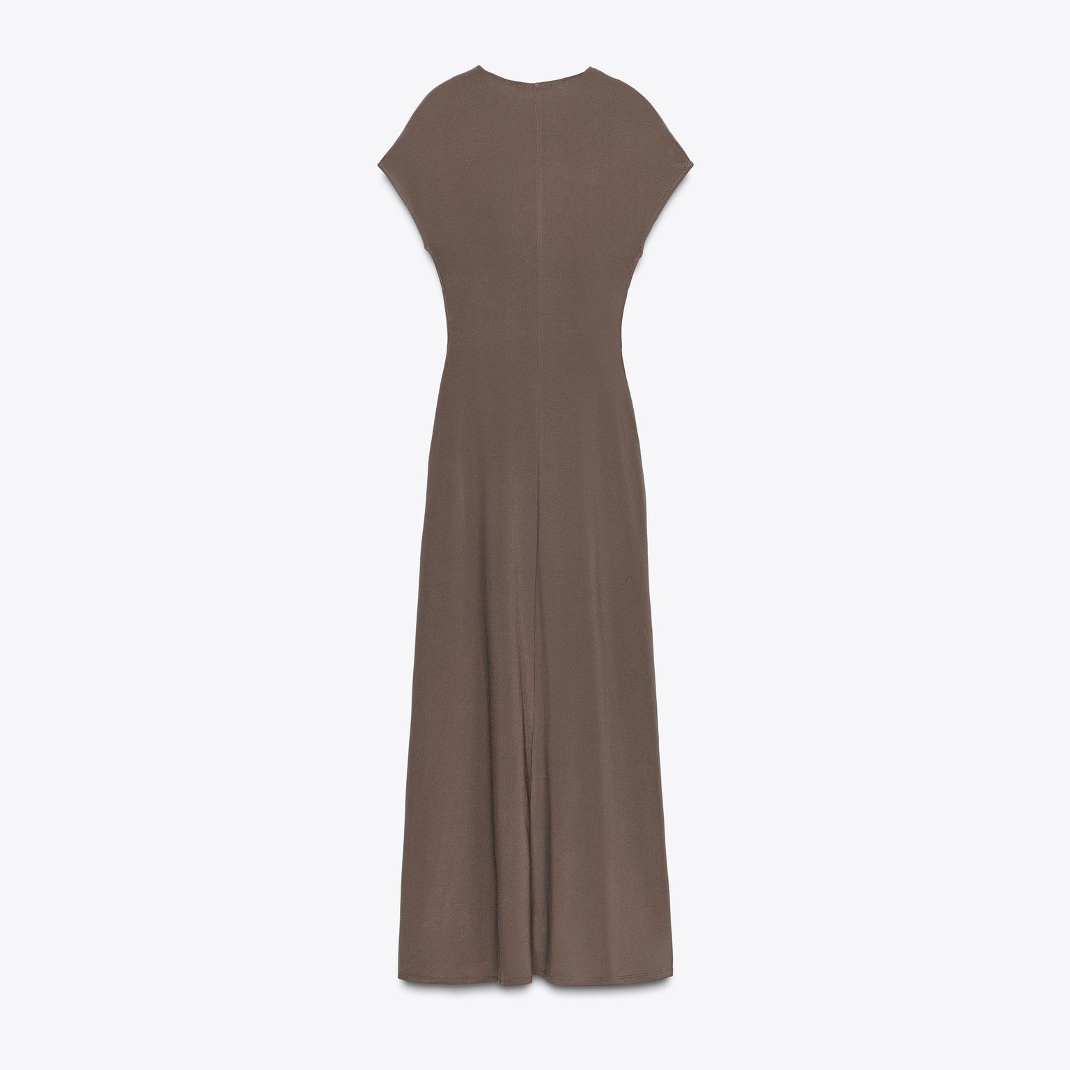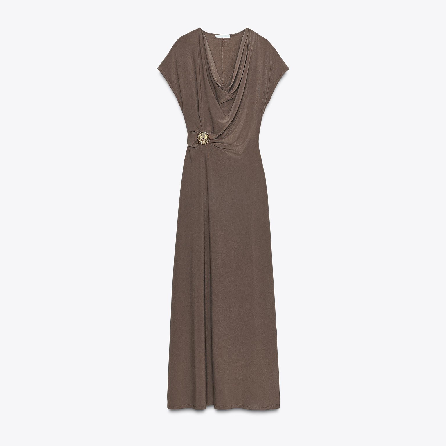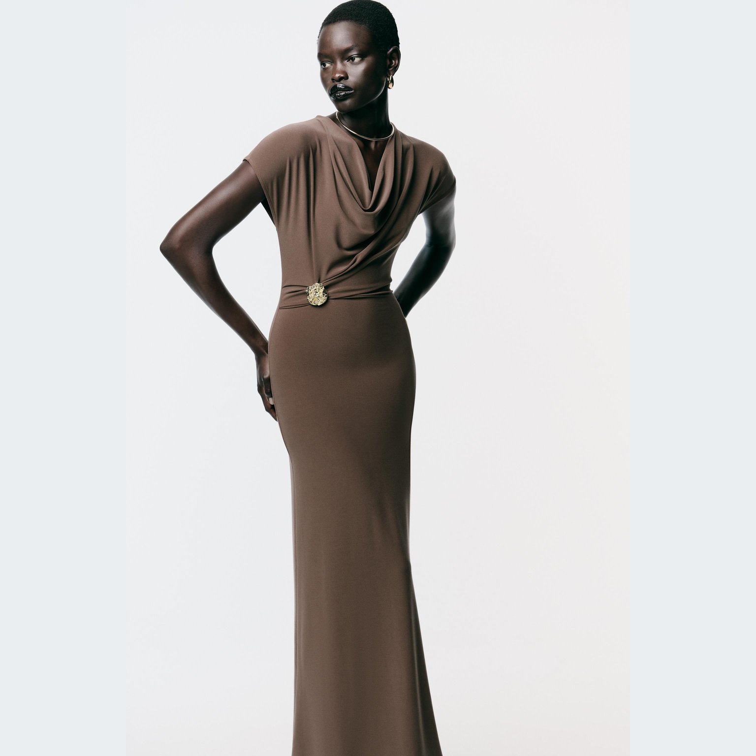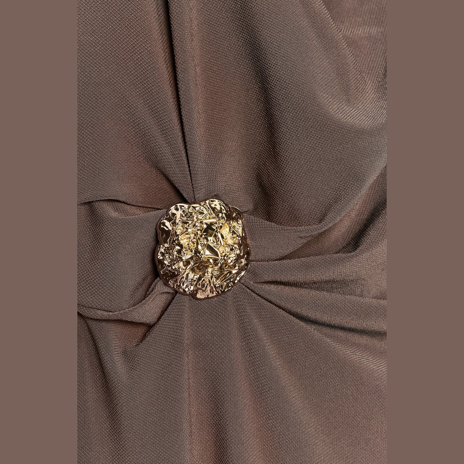 فستان درابيه مع تفاصيل معدنية – لون طبيعي (بني) – Brown (Draped Dress with Hardware) فستان أنيق بلون بني طبيعي، مصنوع من خامة محبوكة بخليط بوليستر وإيلاستان يمنح مرونة وانسيابية، بتصميم بياقة متدفقة وأكمام ساقطة. يتميز بتفاصيل درابيه أمامية مع قطعة معدنية بارزة تضيف لمسة عصرية أنثوية، وحافة مستقيمة بطول قصير. قطعة مثالية للتنسيقات المسائية الأنيقة أو المناسبات الخاصة.