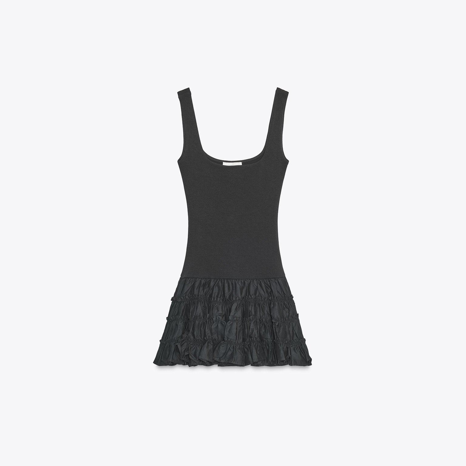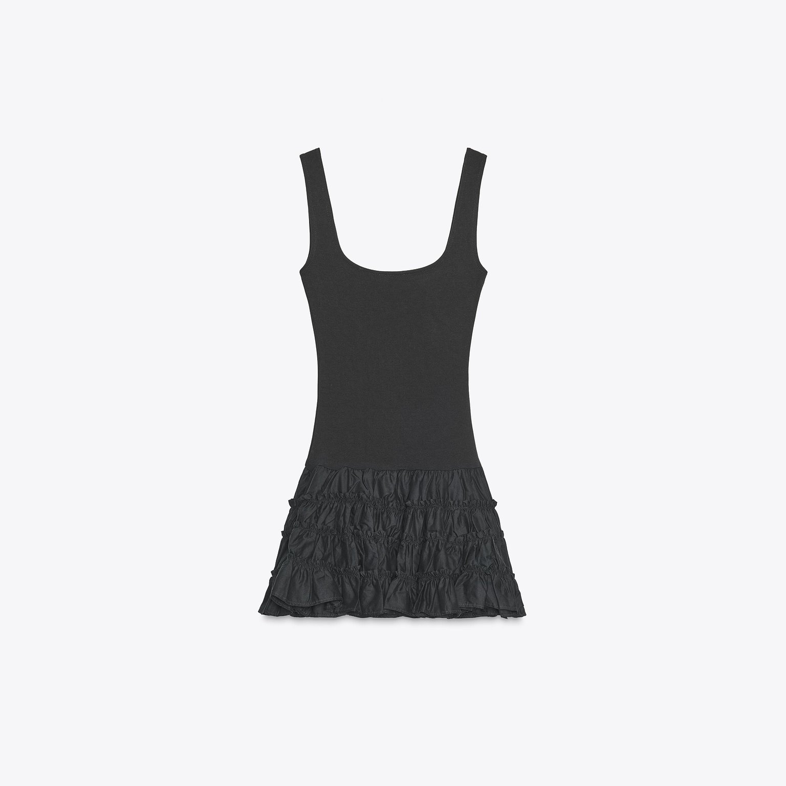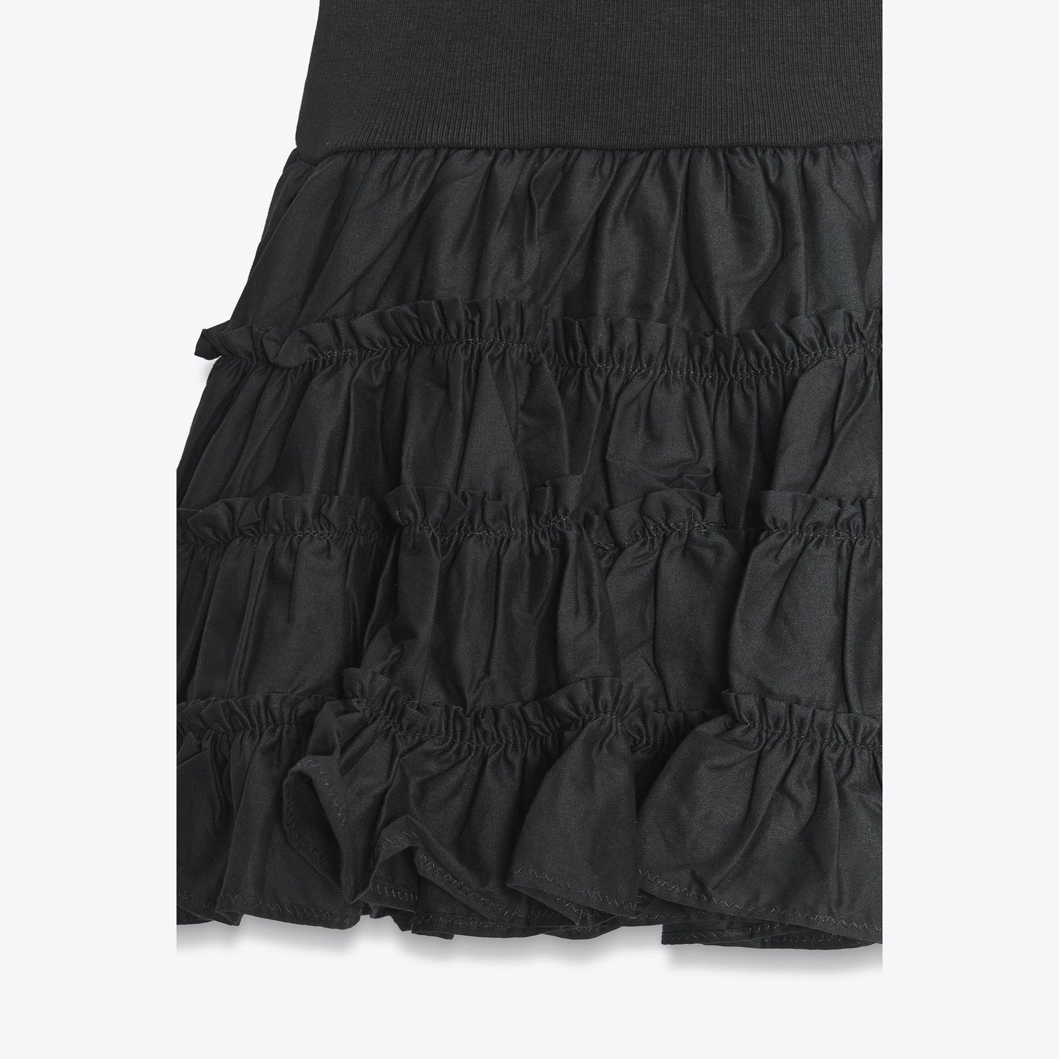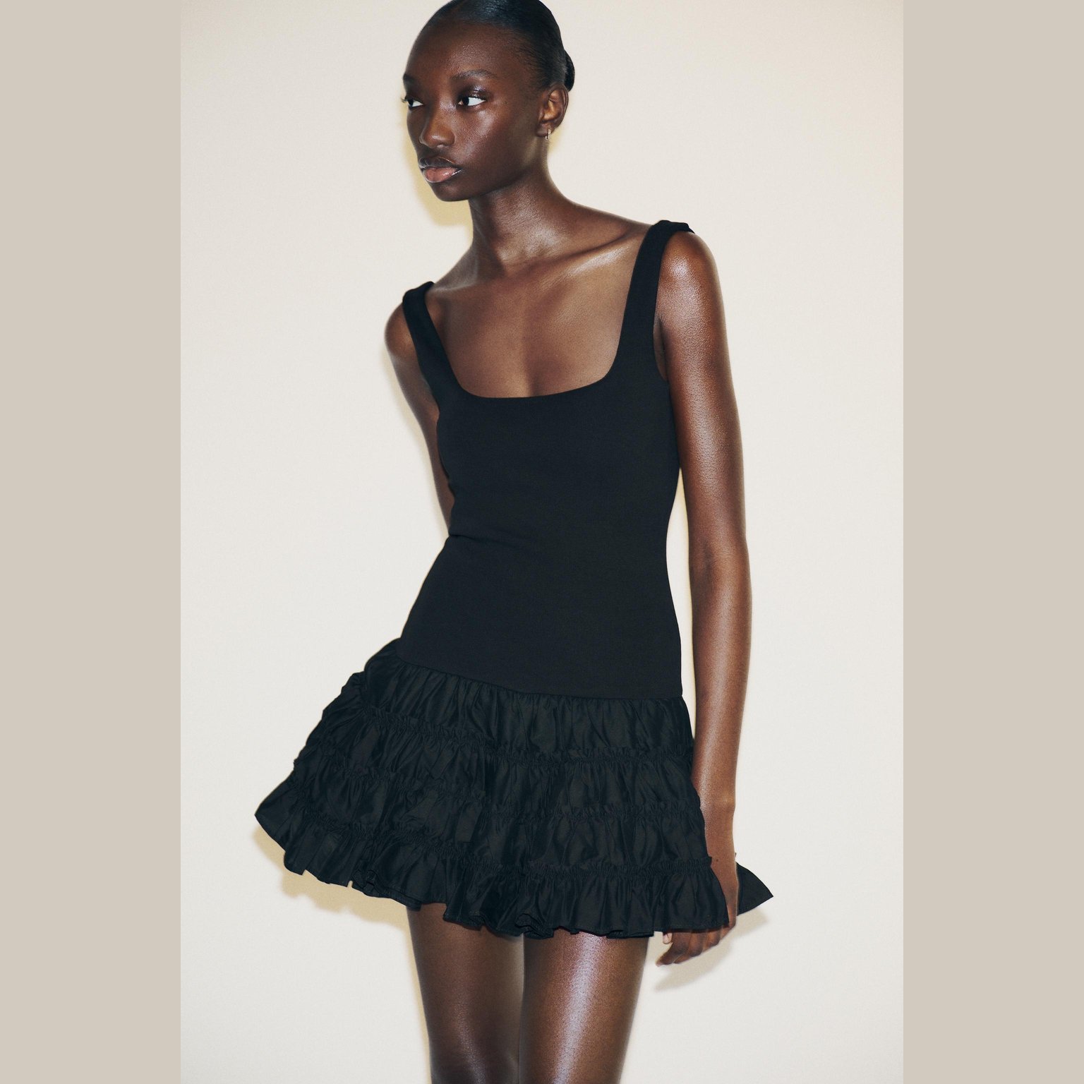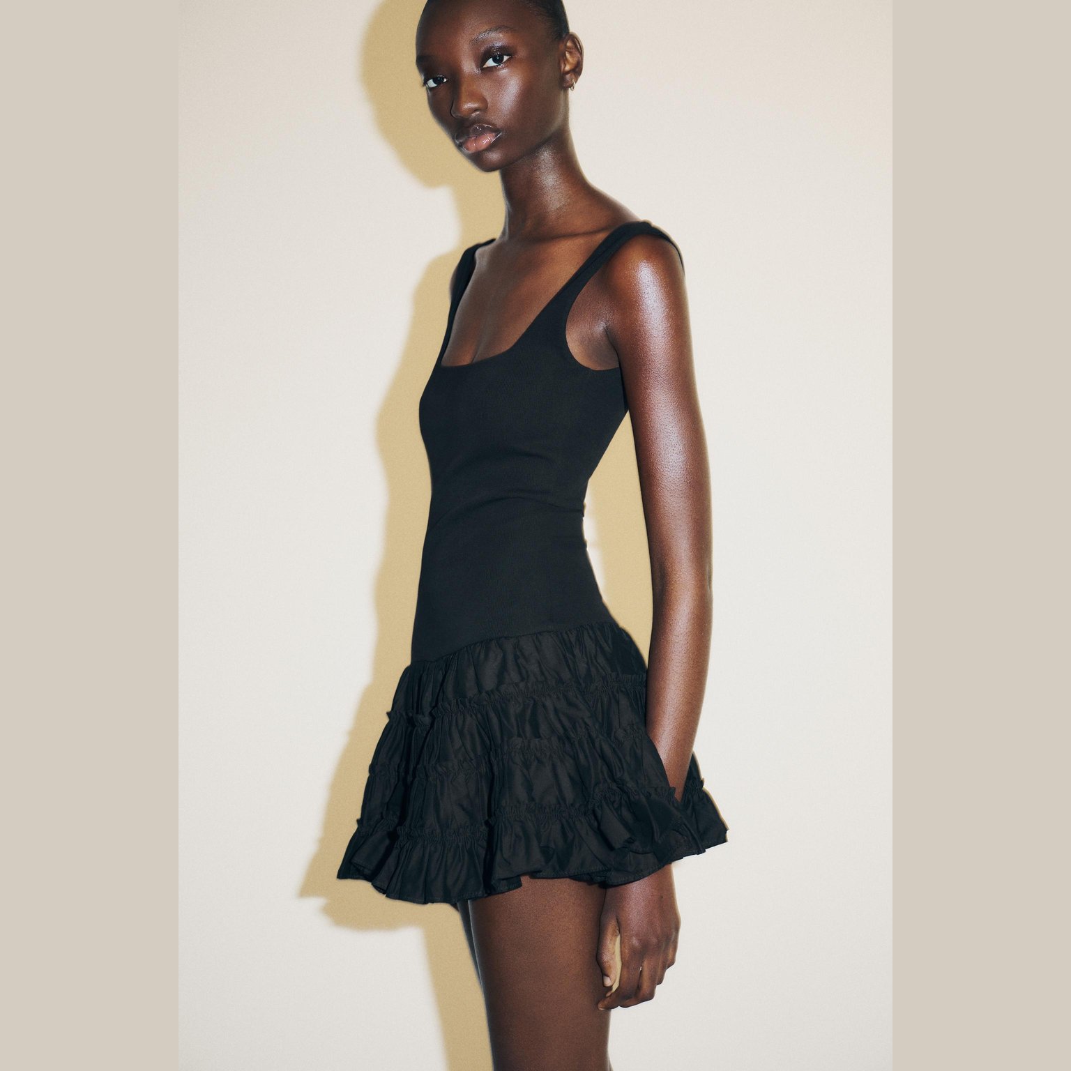 فستان قصير محبوك بكشكش واسع – لون طبيعي (أسود) – Black (Voluminous Combined Dress) فستان أنيق بلون أسود طبيعي، مصنوع من خامة محبوكة عملية بخليط قطن وإيلاستان يمنح راحة ومرونة، مع تفاصيل كشكش واسعة من قماش قطني متباين تضيف لمسة أنثوية عصرية. يتميز بياقة مربعة مع حمالات رفيعة وحافة مزينة بكشكش متطابق. قطعة مثالية للتنسيقات اليومية الكاجوال الأنيقة أو كإطلالة مسائية راقية.