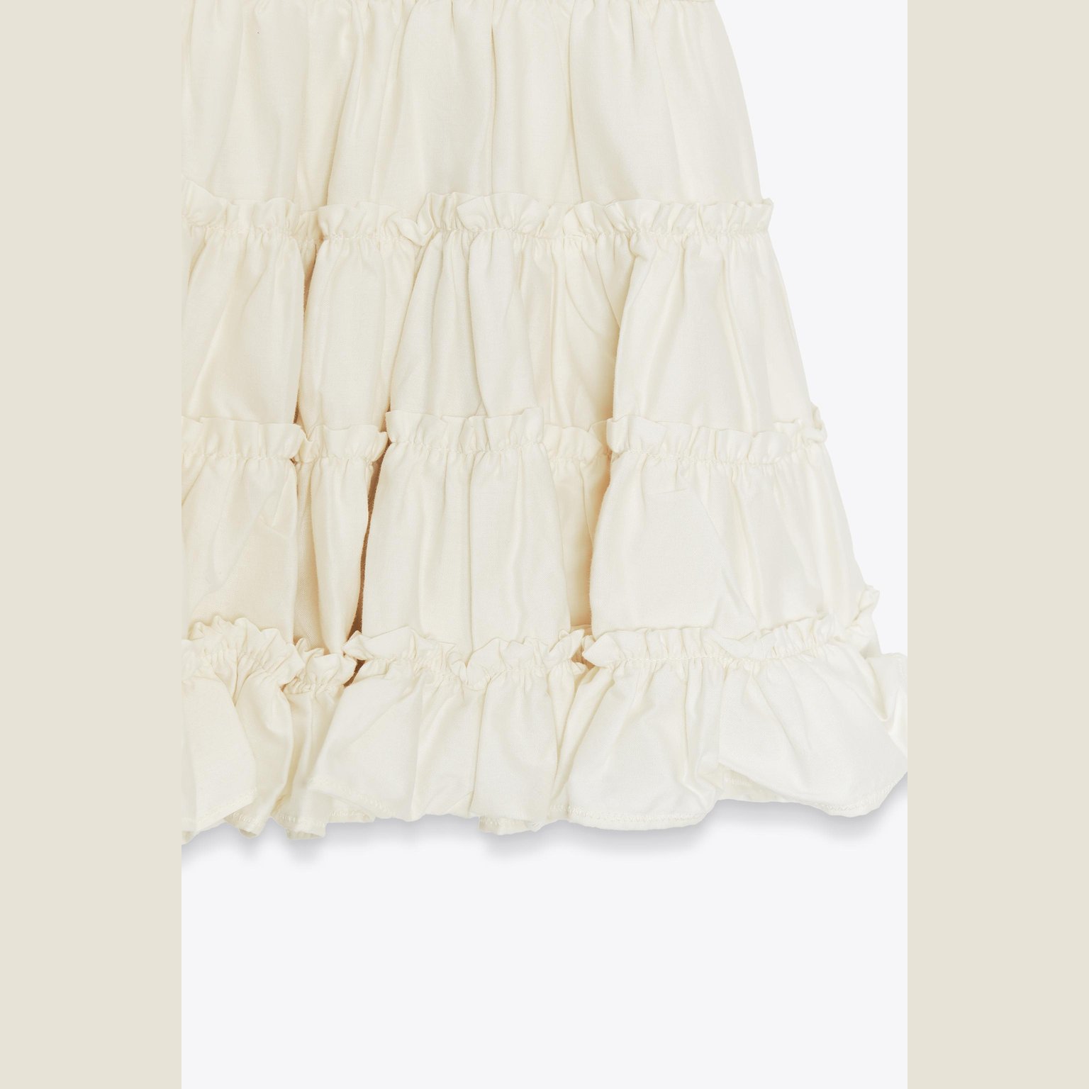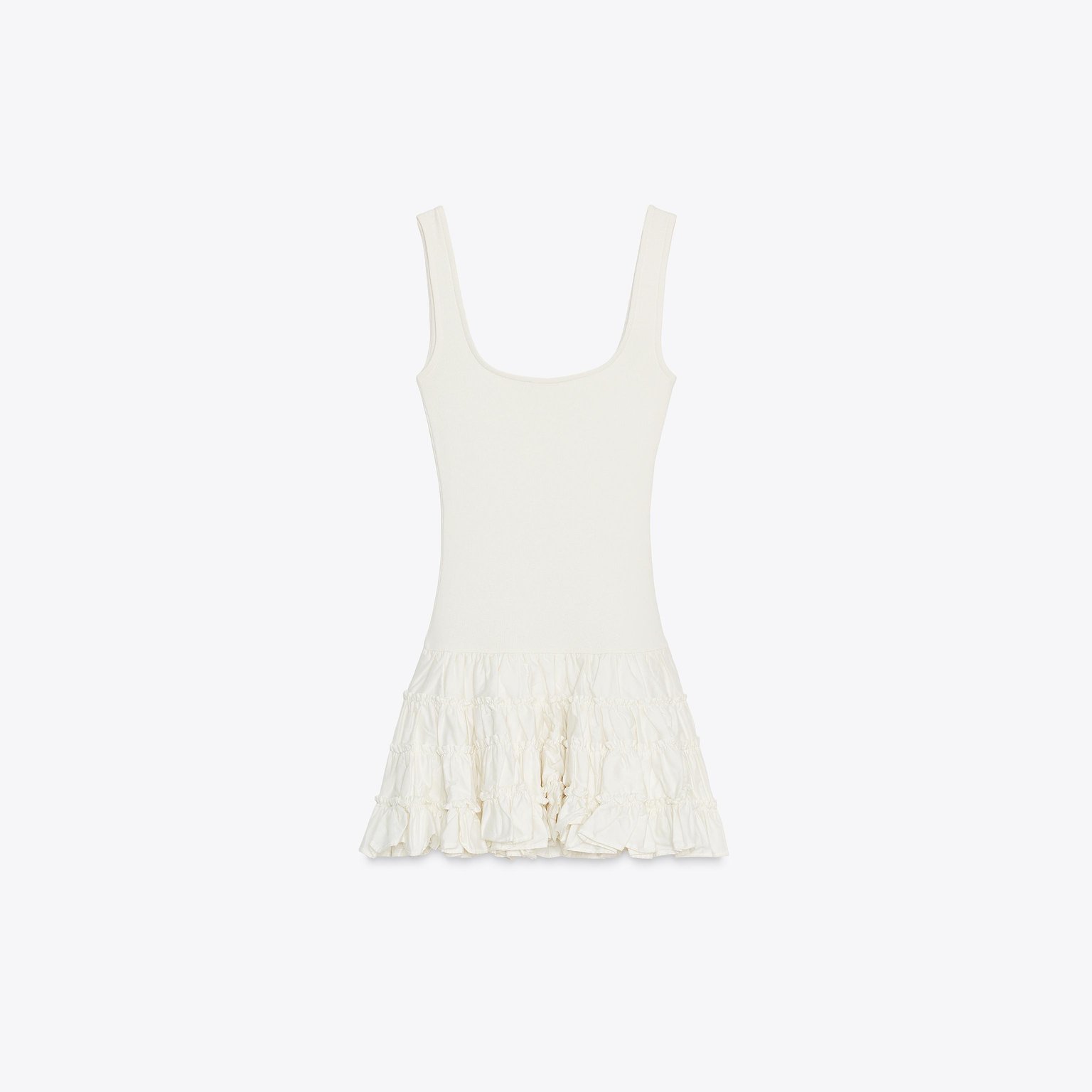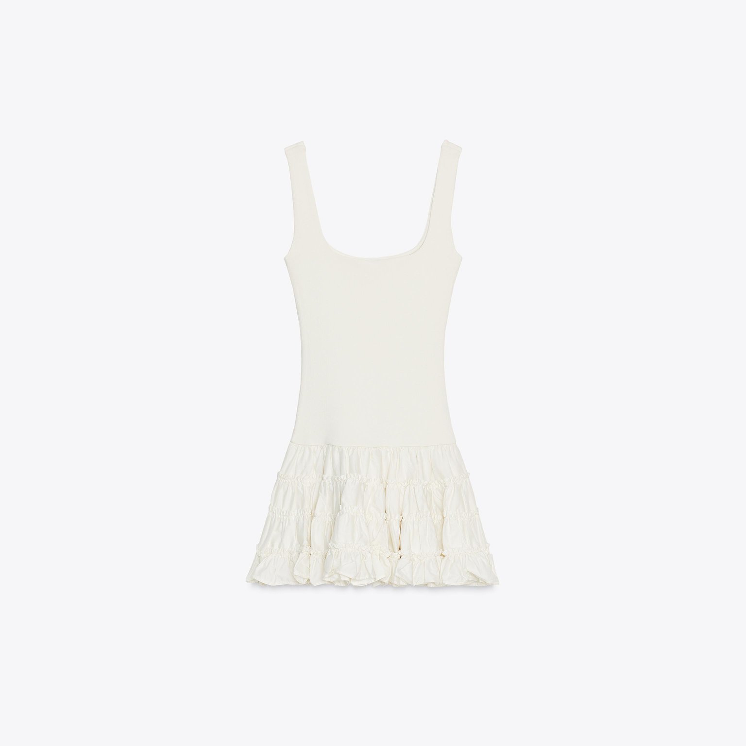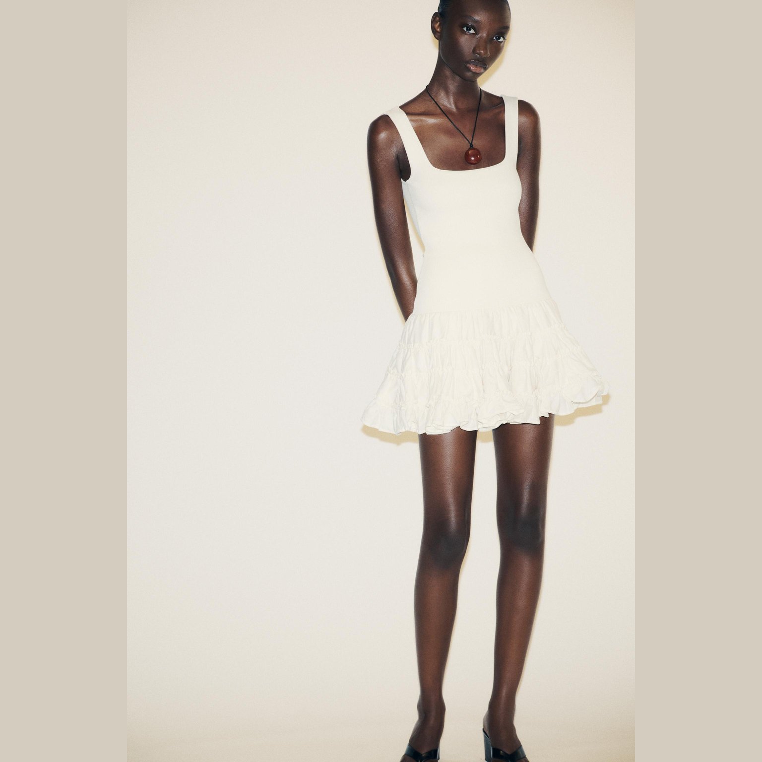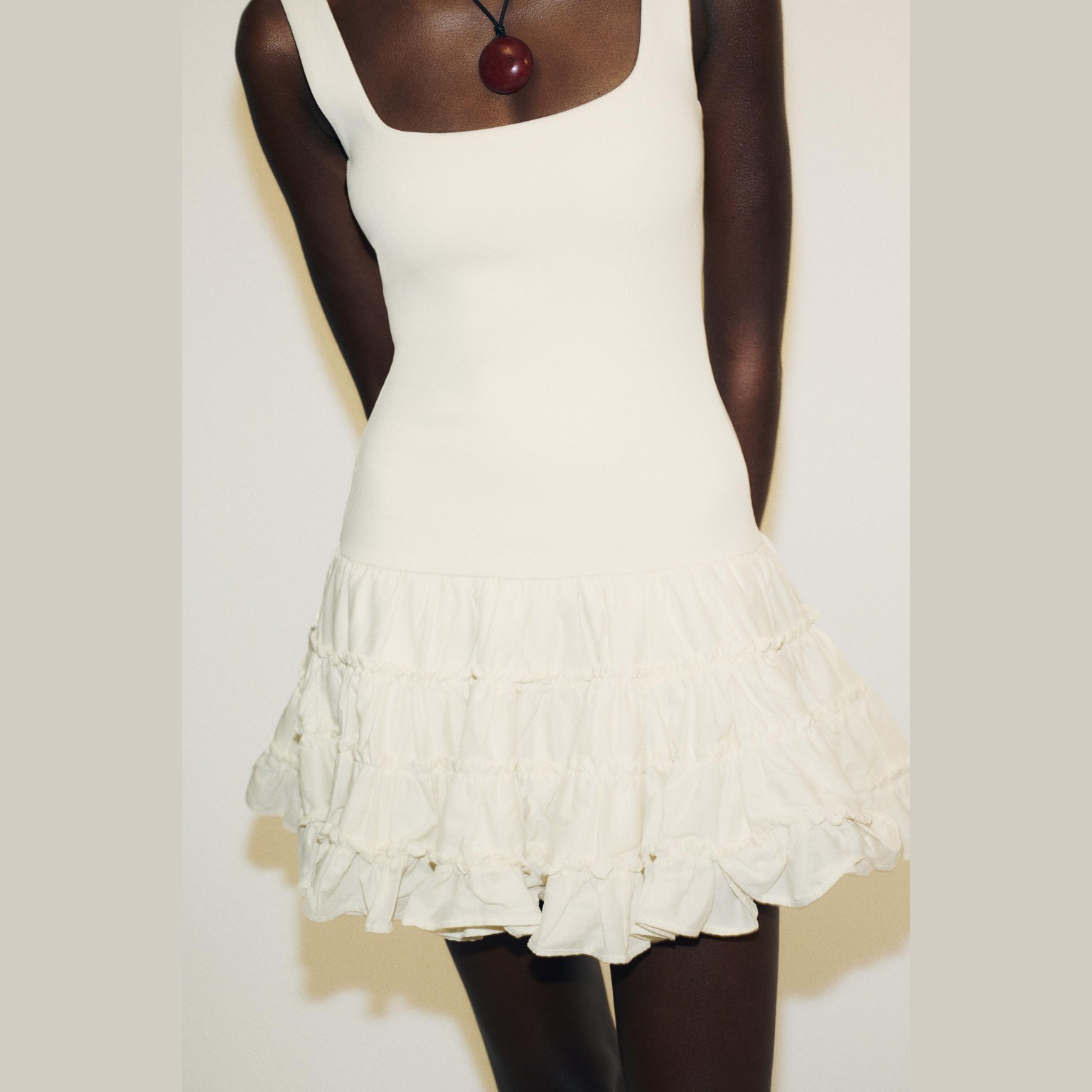 فستان قصير محبوك بكشكش واسع – لون طبيعي (أوف وايت) – Ecru (Voluminous Combined Dress) فستان أنيق بلون أوف وايت طبيعي، مصنوع من خامة محبوكة عملية بخليط قطن وإيلاستان يمنح راحة ومرونة، مع تفاصيل كشكش واسعة من قماش قطني متباين تضيف لمسة أنثوية عصرية. يتميز بياقة مربعة مع حمالات رفيعة وحافة مزينة بكشكش متطابق. قطعة مثالية للتنسيقات اليومية الكاجوال الأنيقة أو كإطلالة مسائية راقية.