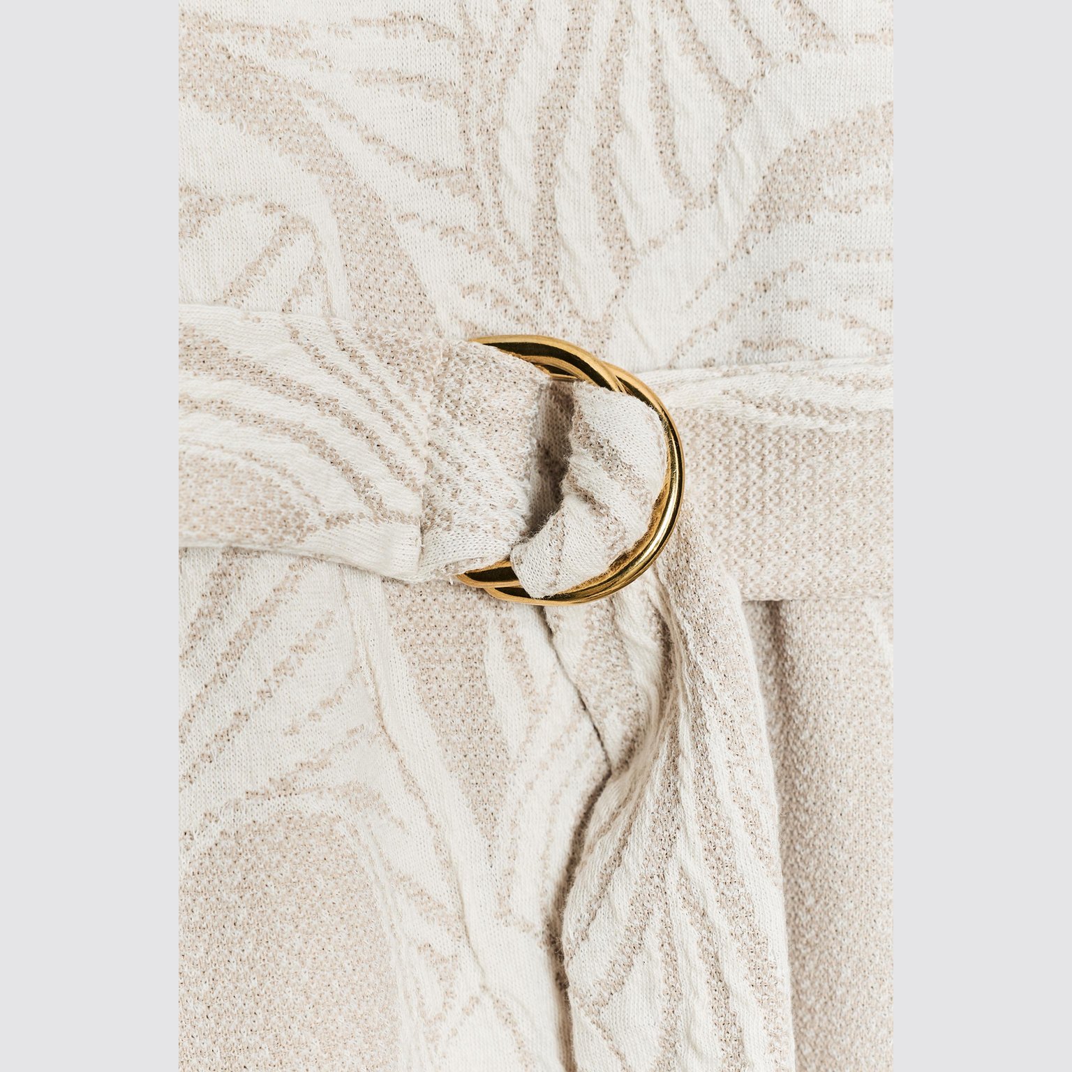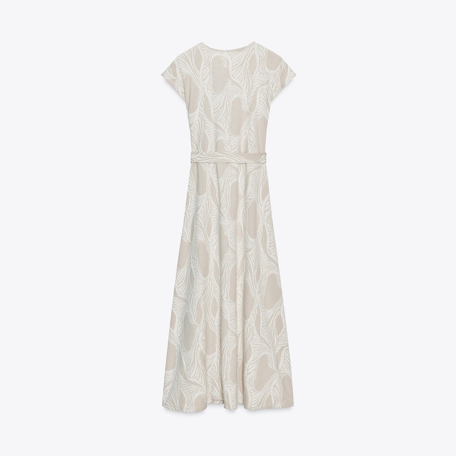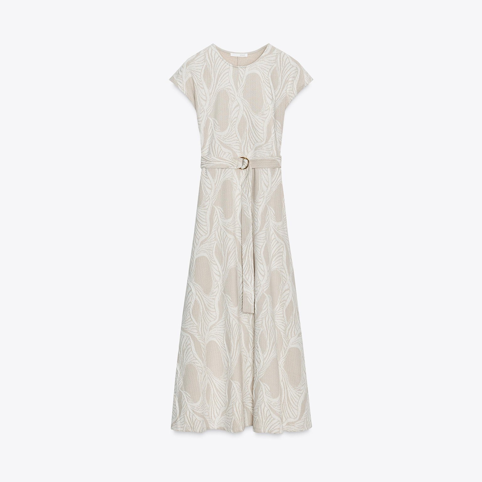 فستان جاكار مع حزام – لون طبيعي (أوف وايت بيج) – Ecru/Beige (Jacquard Dress with Belt) فستان أنيق بلون أوف وايت بيج طبيعي، مصنوع من خامة جاكار بخليط بوليستر وقطن وإيلاستان يمنح راحة ومرونة، بتصميم ميدي مع ياقة مستديرة وأكمام ساقطة. يتميز بحزام مطابق من نفس الخامة مع إبزيم معدني، وحافة مستقيمة تمنح إطلالة أنثوية عصرية. قطعة مثالية للتنسيقات اليومية الكاجوال الأنيقة أو كإطلالة مكتبية راقية.