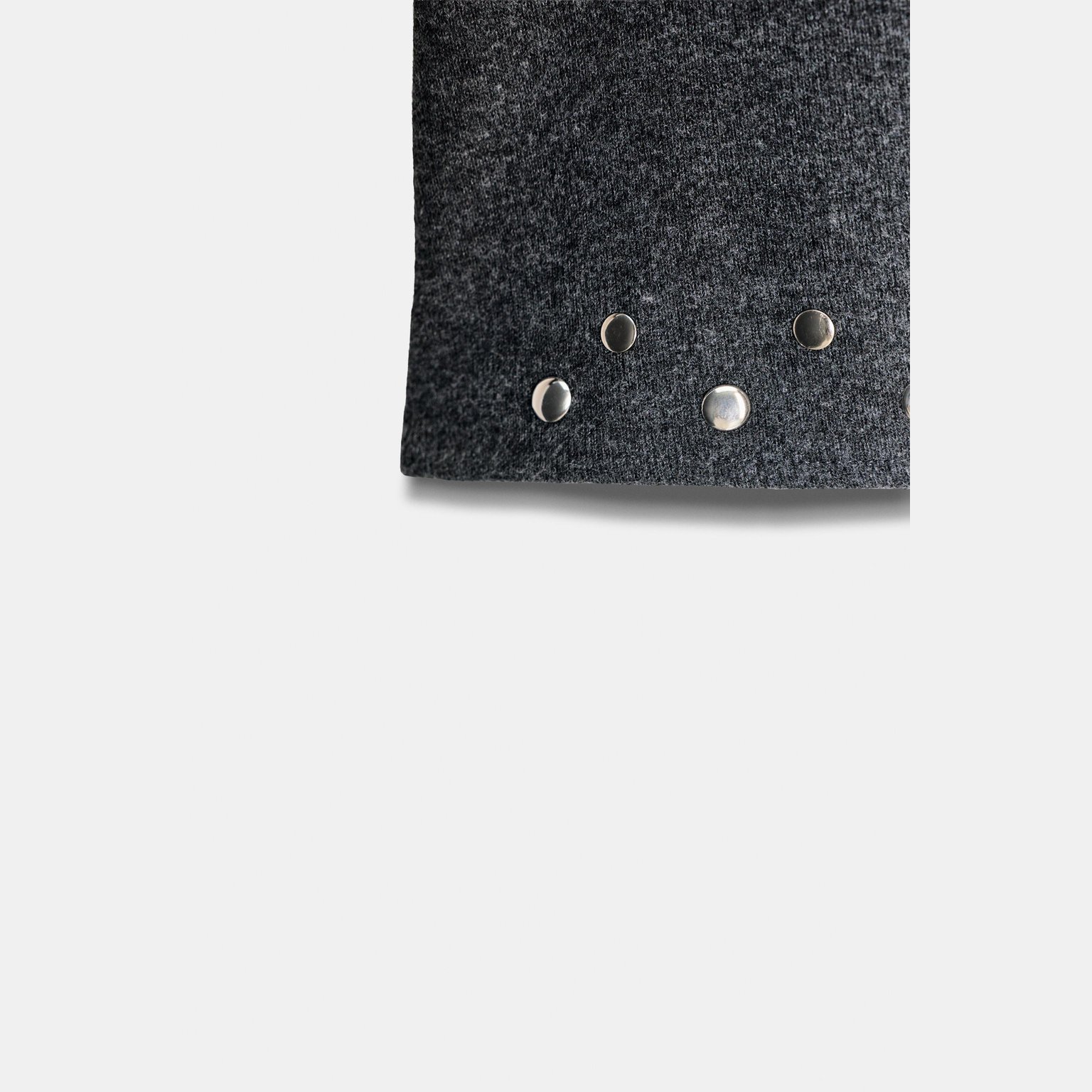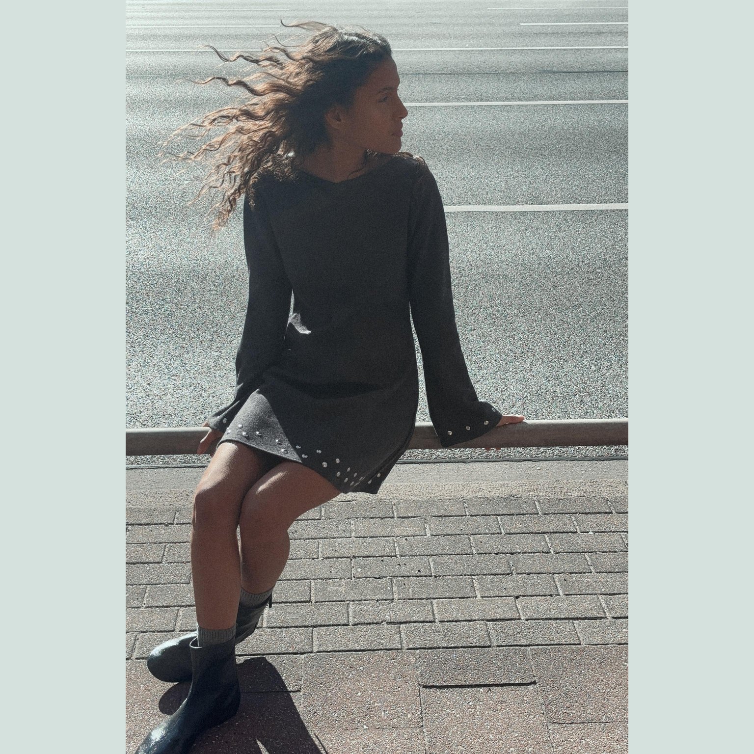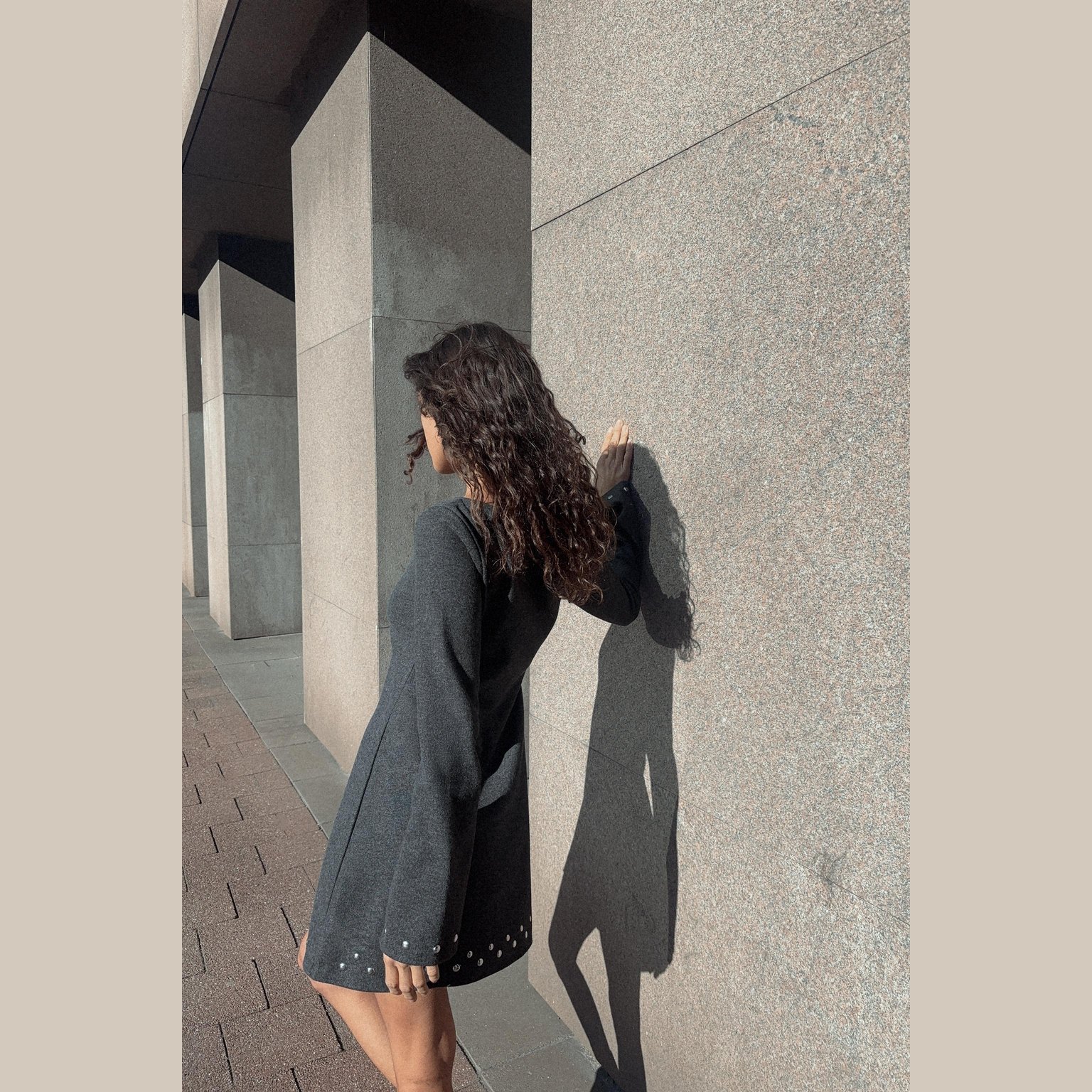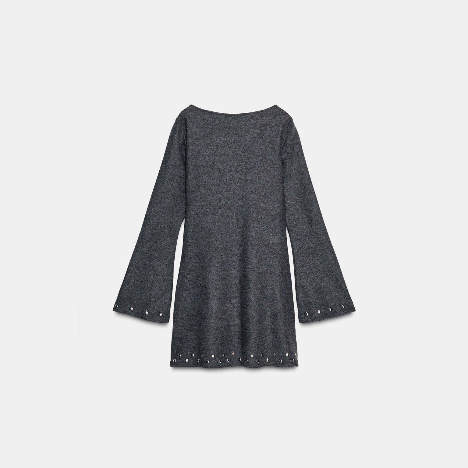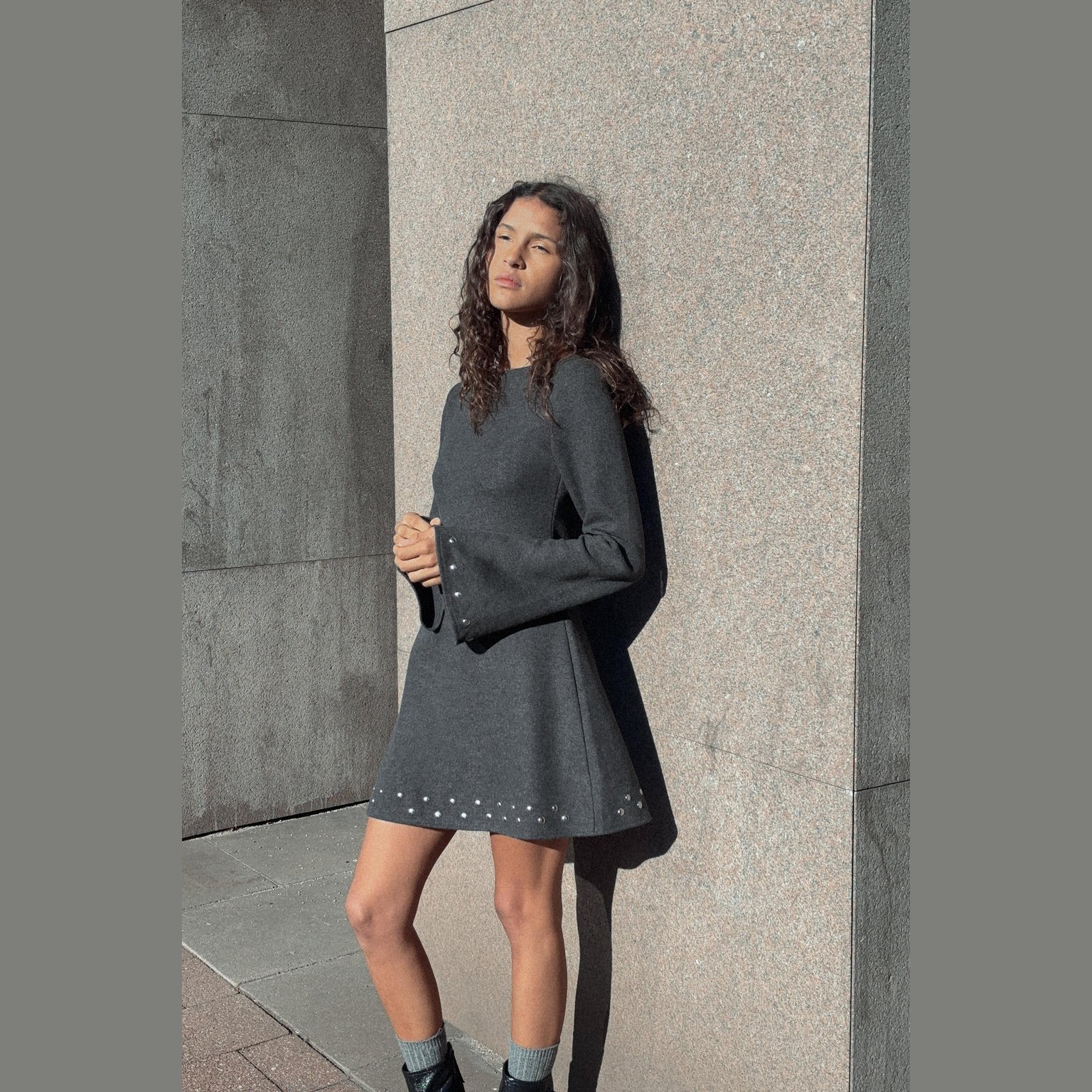 فستان قصير ناعم مزين بحليات معدنية – لون طبيعي (رمادي فحمي) – Anthracite Grey (Soft Short Studded Dress) فستان أنيق بلون رمادي فحمي طبيعي، مصنوع من خامة محبوكة بخليط بوليستر وقطن يمنح راحة وملمسًا ناعمًا، بتصميم ياقة قارب وأكمام طويلة. يتميز بحليات معدنية صغيرة موزعة على القماش وحافة واسعة تمنح حركة أنثوية عصرية. قطعة مثالية للتنسيقات اليومية الكاجوال الأنيقة أو كإطلالة مكتبية راقية.