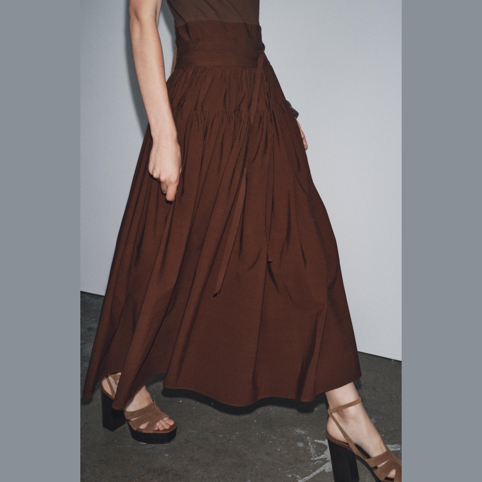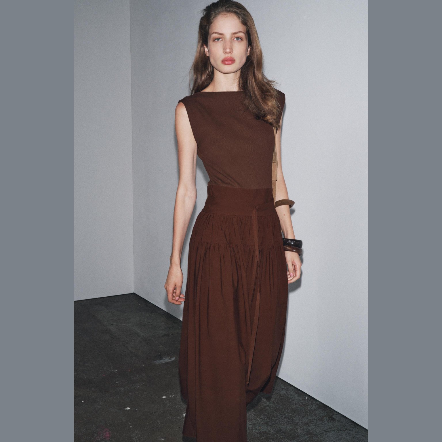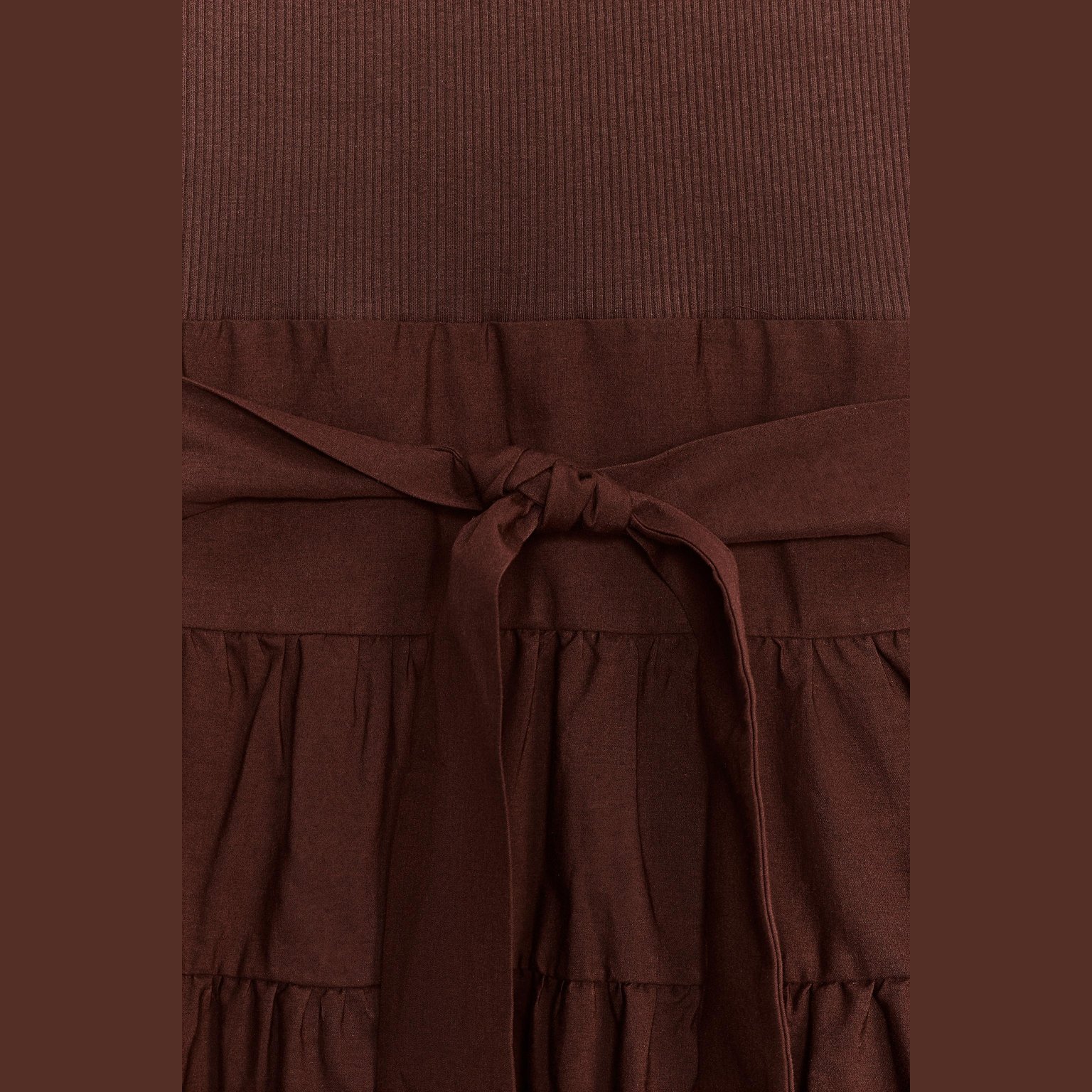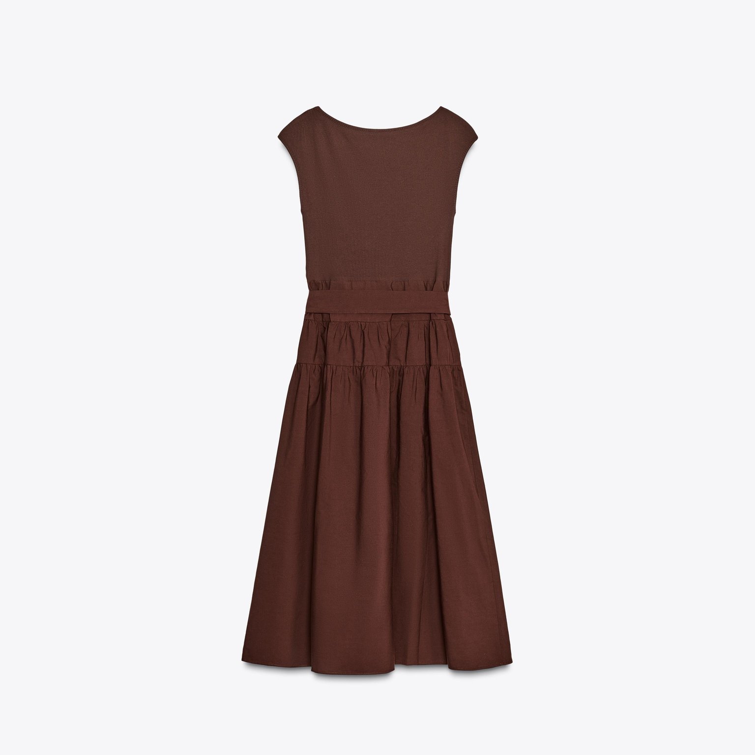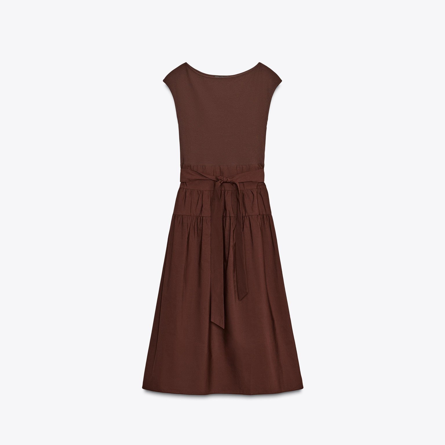 فستان ميدي محبوك بتفاصيل متباينة – لون طبيعي (بني) – Brown (Contrast Gathered Dress) فستان أنيق بلون بني طبيعي، مصنوع من خامة محبوكة بخليط قطن وإيلاستان يمنح راحة ومرونة، بتصميم ياقة قارب بلا أكمام. يتميز بتفاصيل قماش متباين مع ربطة أمامية بنفس الخامة، وسحاب جانبي مخفي للإغلاق. قصة ميدي مستقيمة تمنح إطلالة أنثوية عصرية مثالية للتنسيقات اليومية الكاجوال الأنيقة أو كإطلالة مكتبية راقية.