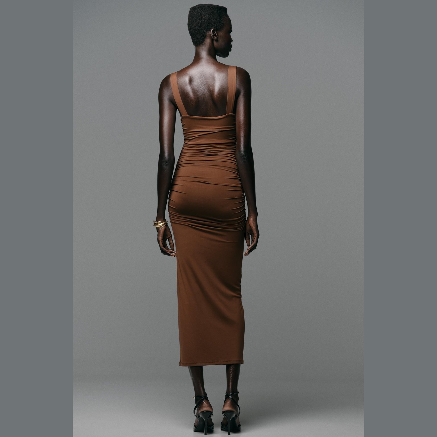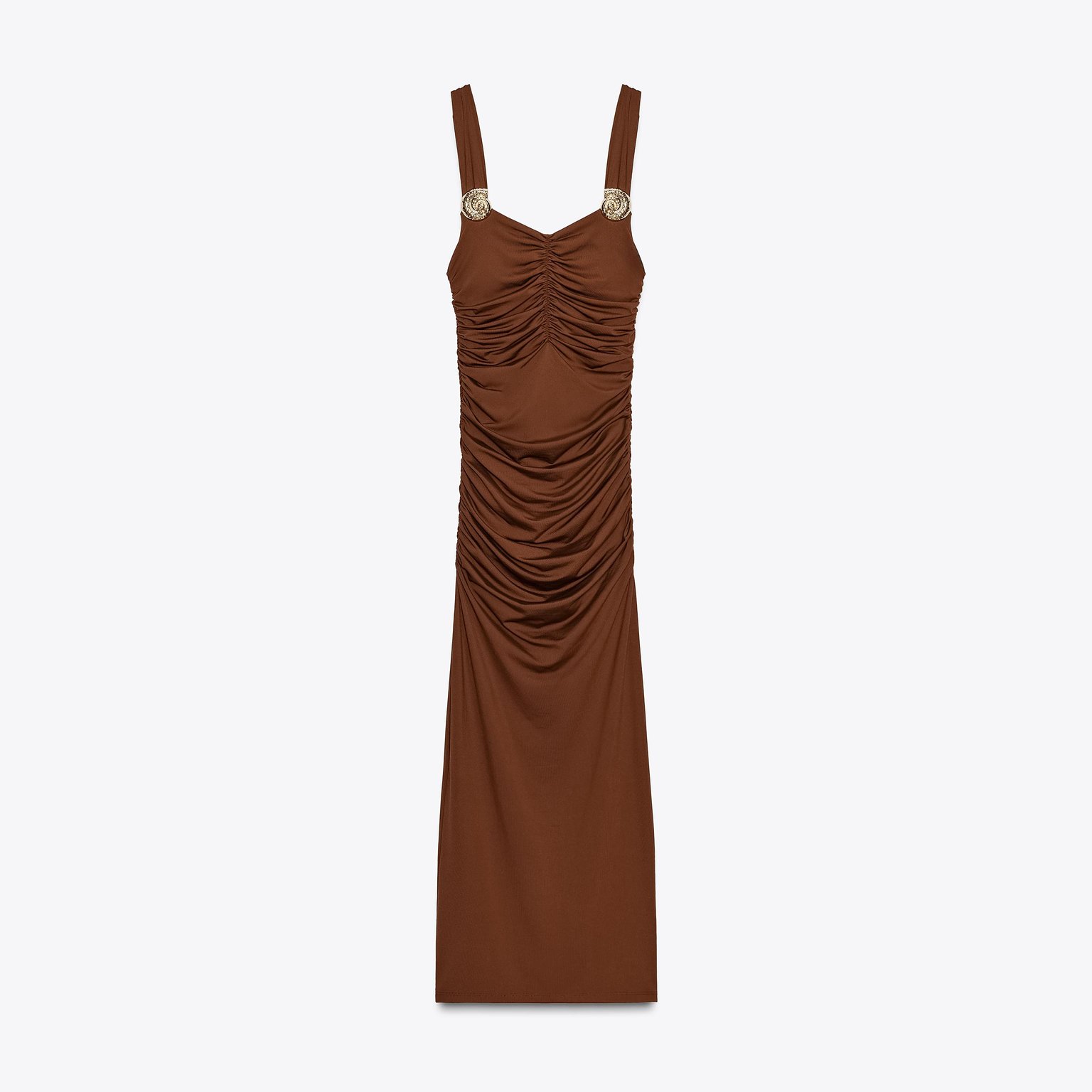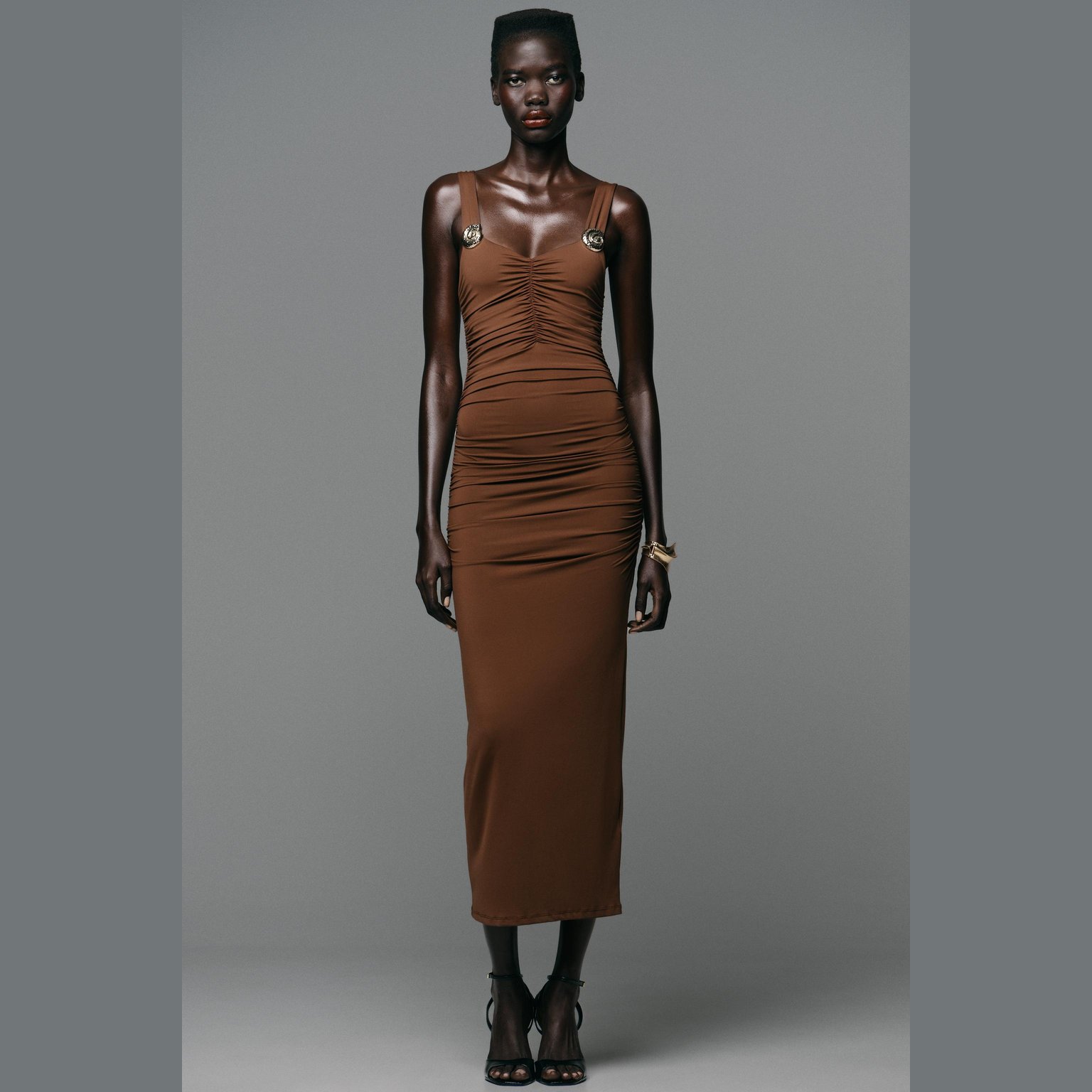 فستان ميدي محبوك مع تفاصيل معدنية – لون طبيعي (بني) – Brown (Shell Polyamide Dress) فستان أنيق بلون بني طبيعي، مصنوع من خامة محبوكة بخليط بولي أميد وإيلاستان يمنح مرونة وانسيابية، بتصميم بياقة مستقيمة مع حمالات رفيعة. يتميز بتفاصيل معدنية على شكل صدفة وزخرفة جانبية بكسرات تضيف لمسة أنثوية عصرية. قطعة مثالية للتنسيقات المسائية الأنيقة أو المناسبات الخاصة.
