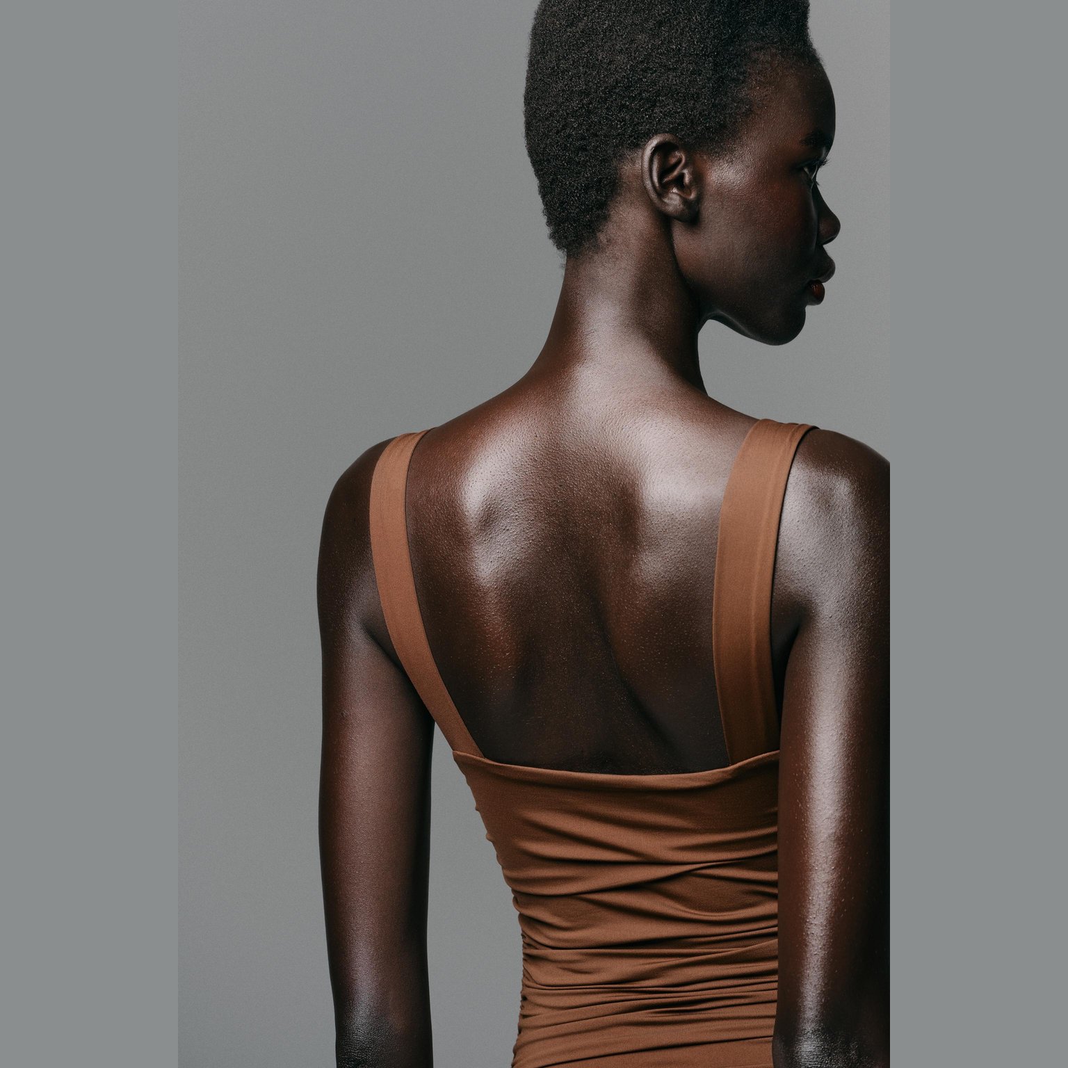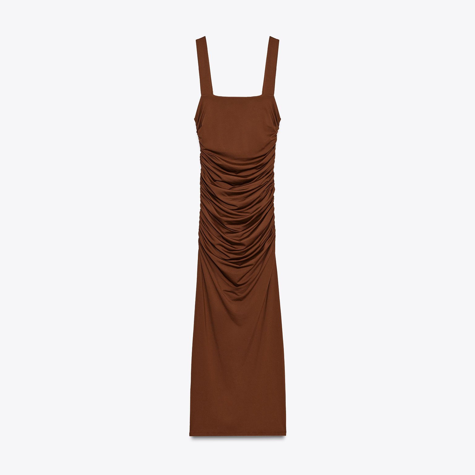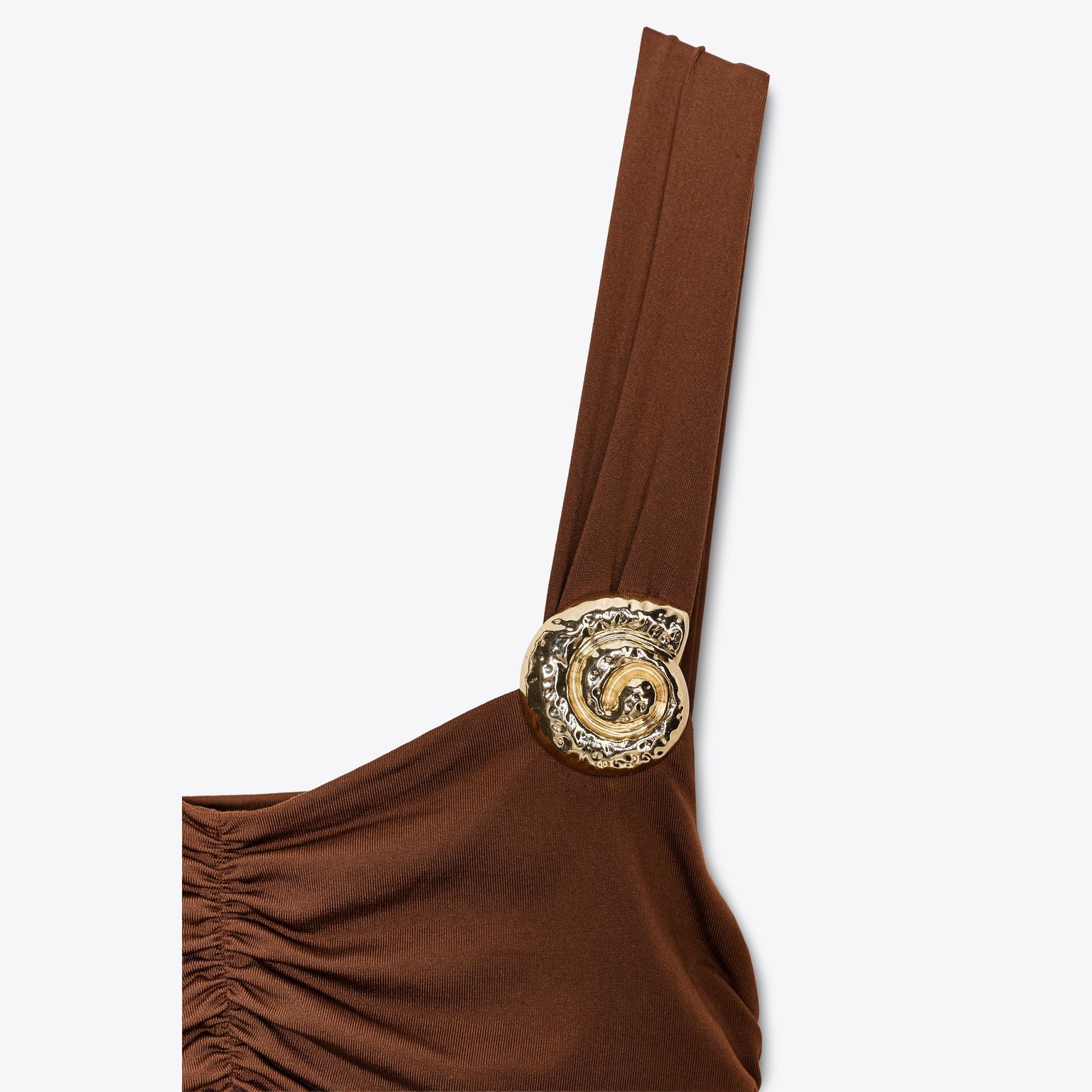 فستان ميدي محبوك مع تفاصيل معدنية – لون طبيعي (بني) – Brown (Shell Polyamide Dress) فستان أنيق بلون بني طبيعي، مصنوع من خامة محبوكة بخليط بولي أميد وإيلاستان يمنح مرونة وانسيابية، بتصميم بياقة مستقيمة مع حمالات رفيعة. يتميز بتفاصيل معدنية على شكل صدفة وزخرفة جانبية بكسرات تضيف لمسة أنثوية عصرية. قطعة مثالية للتنسيقات المسائية الأنيقة أو المناسبات الخاصة.