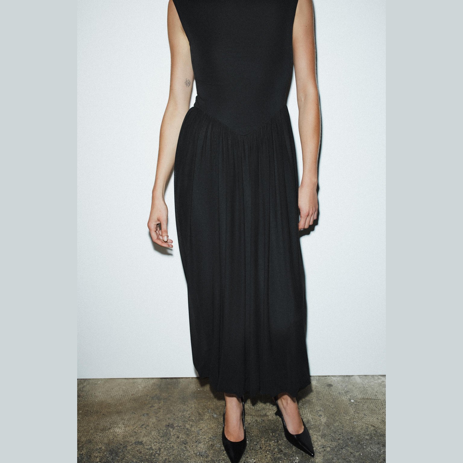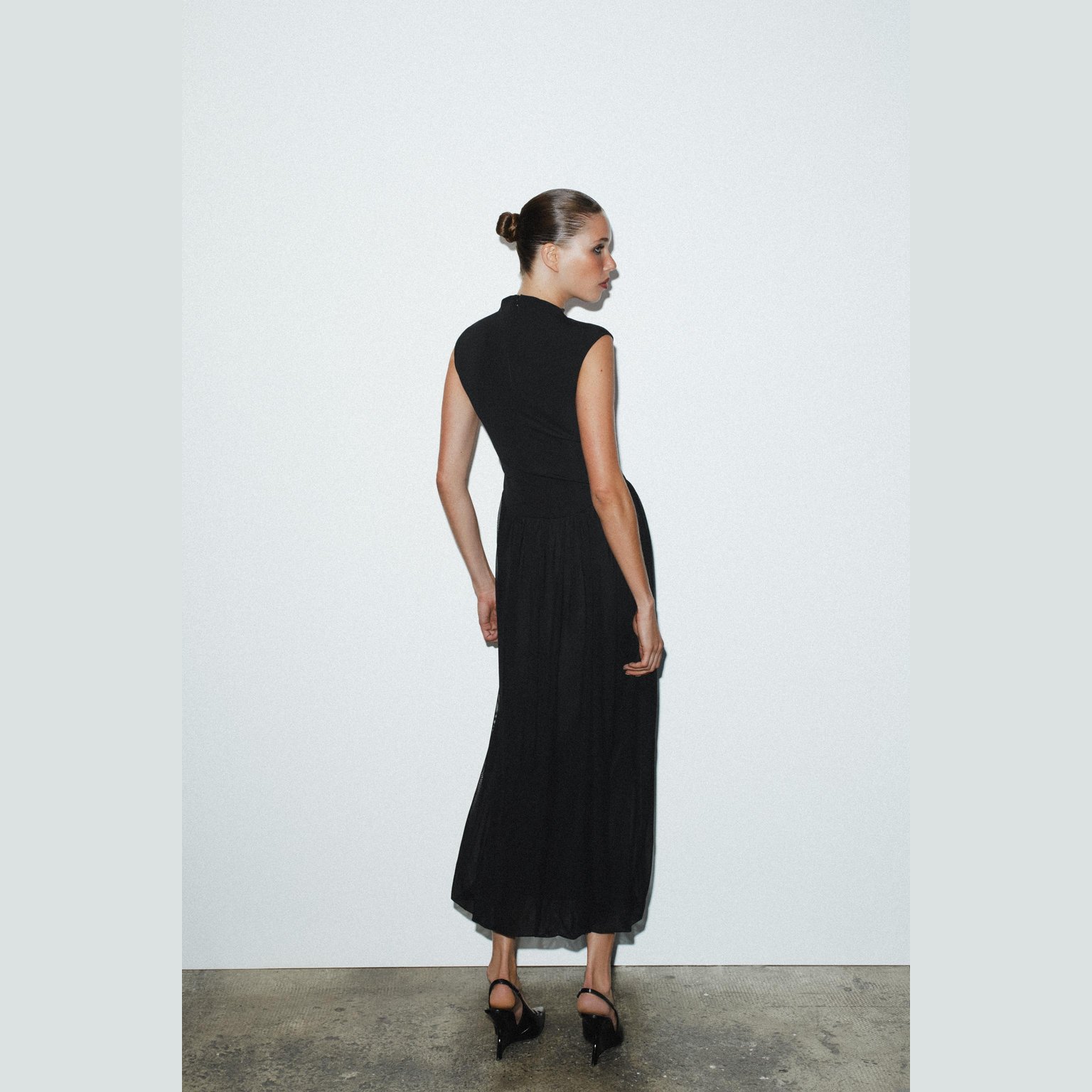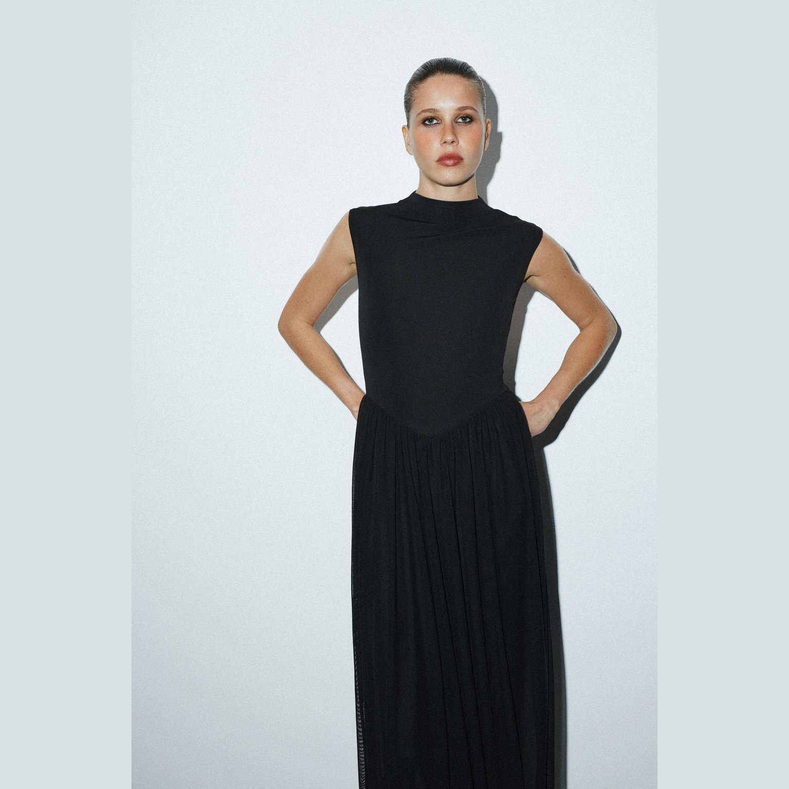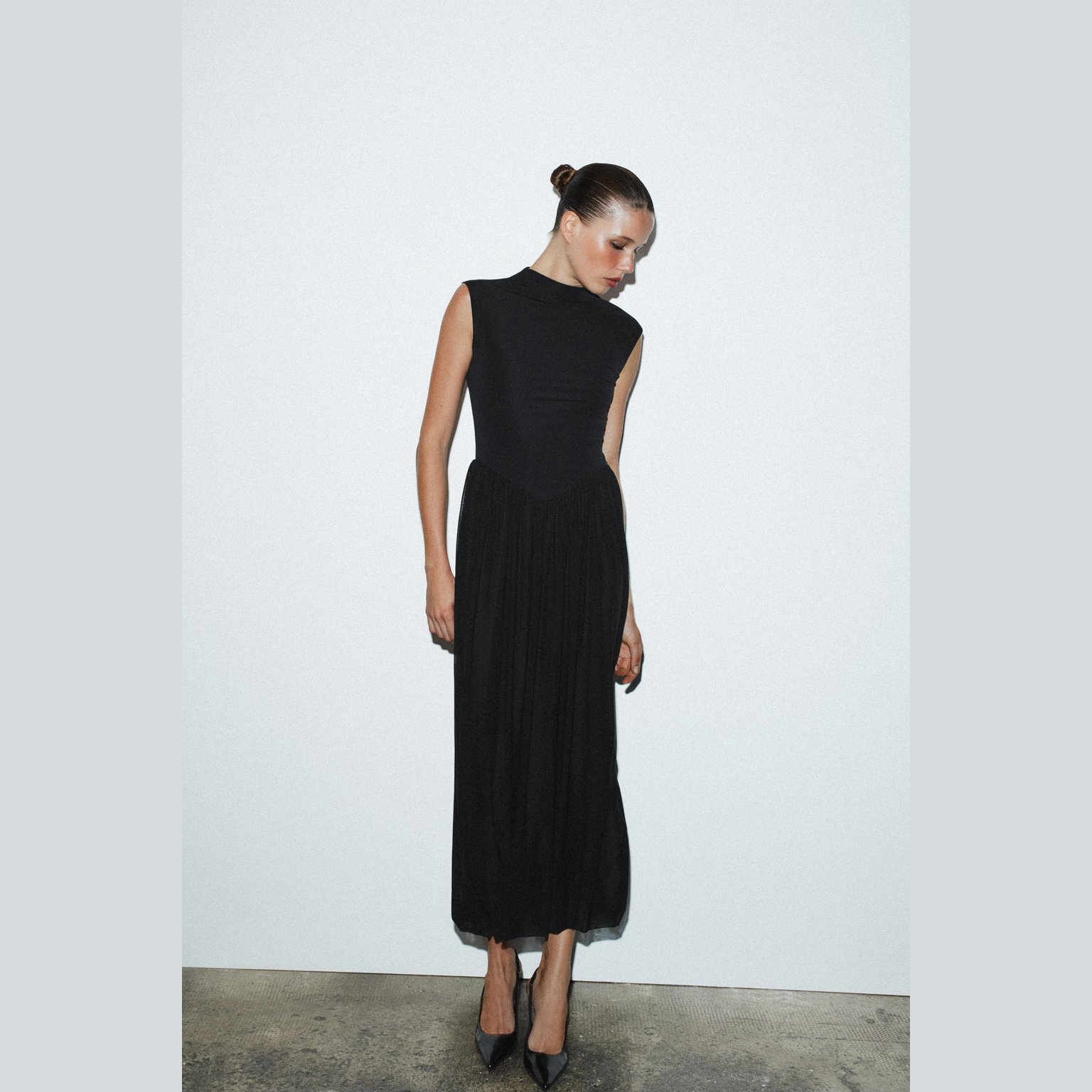 فستان طويل محبوك بتفاصيل تول متباينة – لون طبيعي (أسود) – Black (Long Contrast Tulle Dress) فستان أنيق بلون أسود طبيعي، مصنوع من خامة محبوكة بخليط بوليستر وإيلاستان يمنح مرونة وانسيابية. يتميز بياقة عالية بلا أكمام، مع تفاصيل تول متباينة تضيف لمسة أنثوية عصرية، وإغلاق خلفي بسحاب مخفي. قصة طويلة مستقيمة تمنح إطلالة راقية مثالية للمناسبات المسائية الأنيقة أو الحفلات الخاصة.