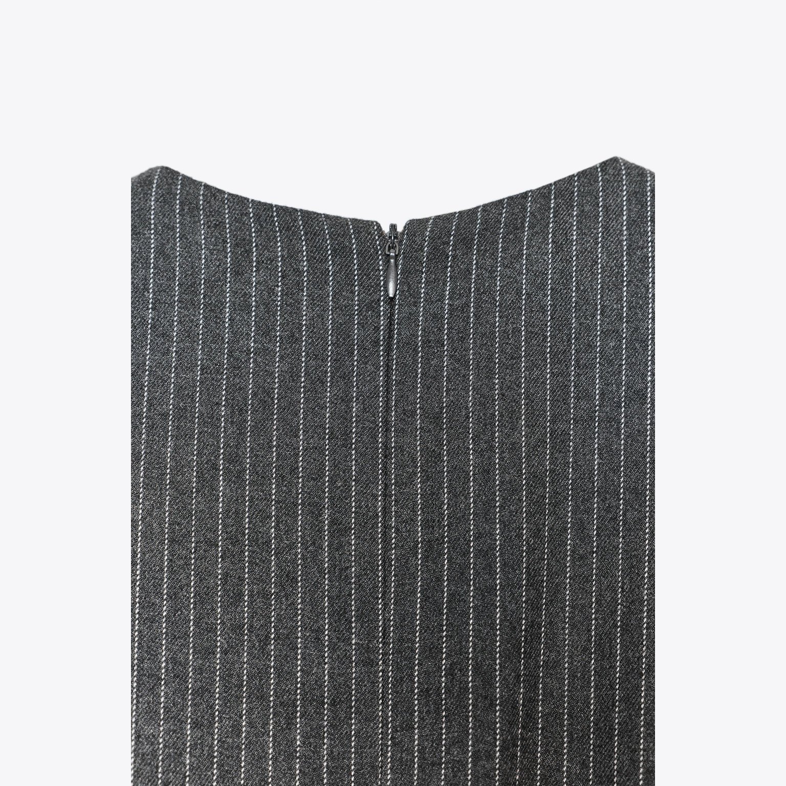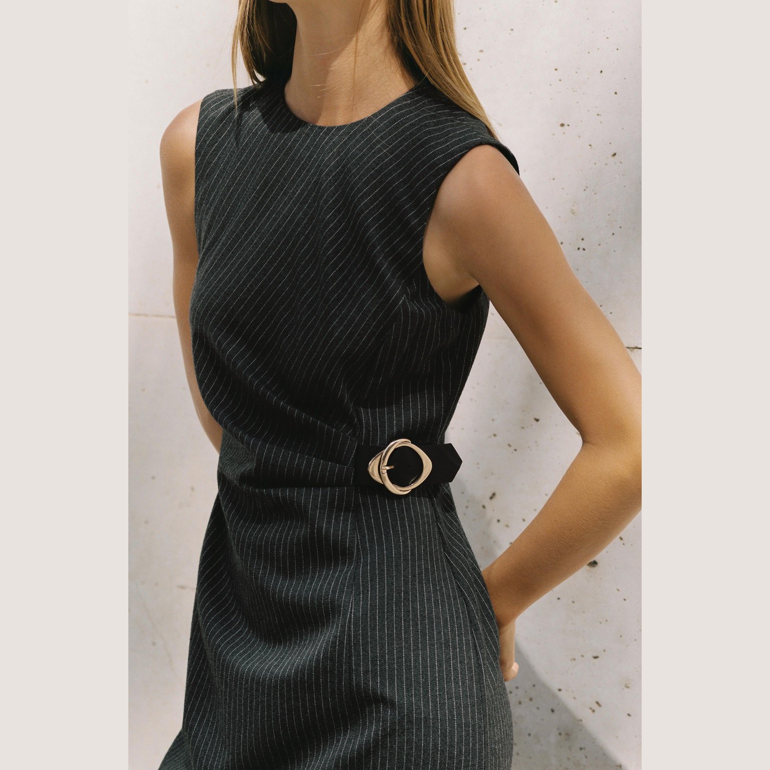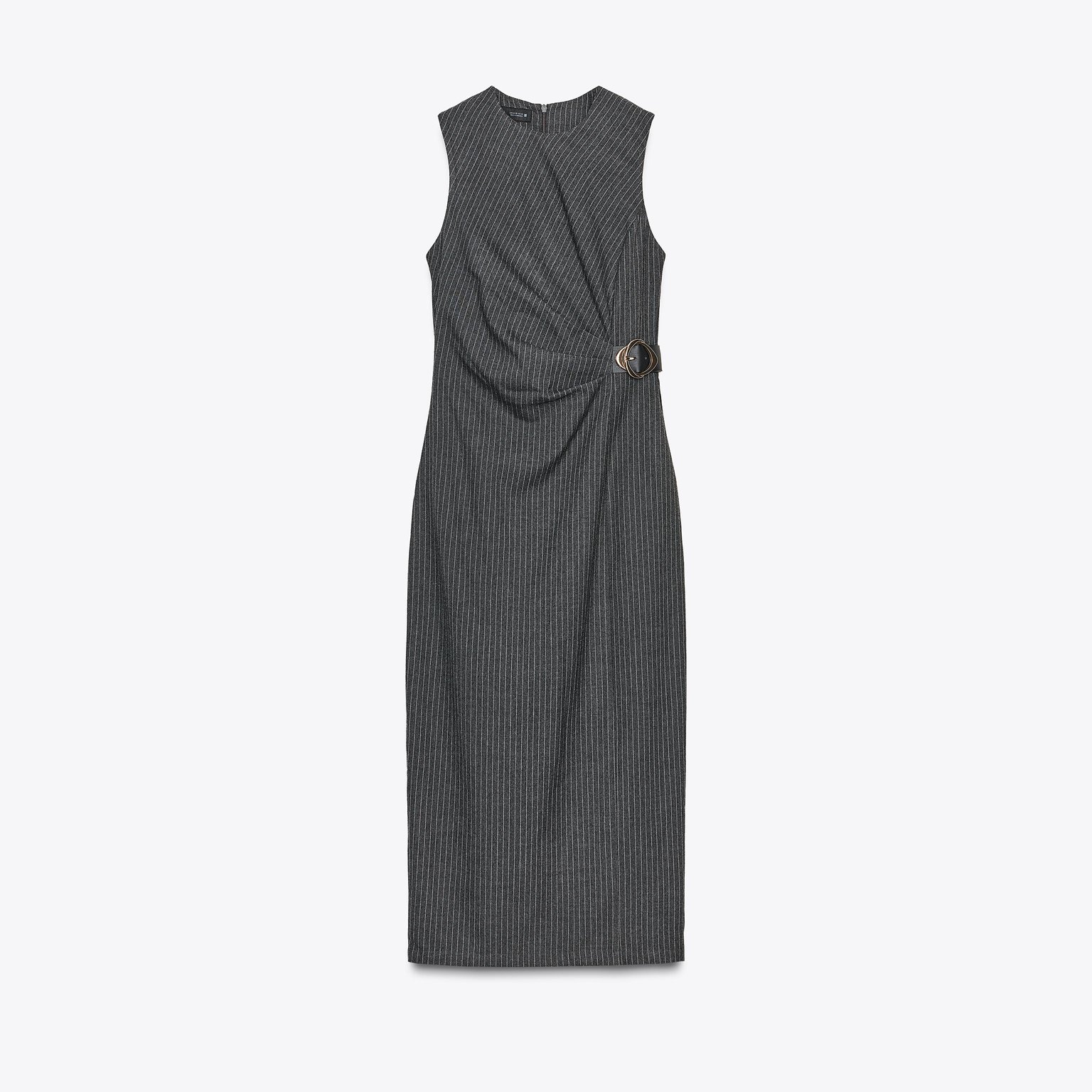 فستان ميدي مخطط مع إبزيم – لون طبيعي (رمادي) – Grey (Striped Midi Dress with Buckle) فستان أنيق بلون رمادي طبيعي، مصنوع من خامة محبوكة بخليط بوليستر وفيكسوز يمنح ملمسًا ناعمًا وانسيابية عملية. يتميز بياقة مستديرة بلا أكمام، مع إبزيم أمامي عند الخصر يضيف لمسة عصرية أنثوية، وحافة مستقيمة بطول ميدي مع شق خلفي. الإغلاق بسحاب مخفي في الخلف. قطعة مثالية للتنسيقات اليومية الكاجوال الأنيقة أو كإطلالة مكتبية راقية.