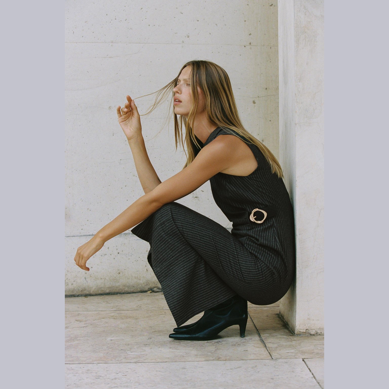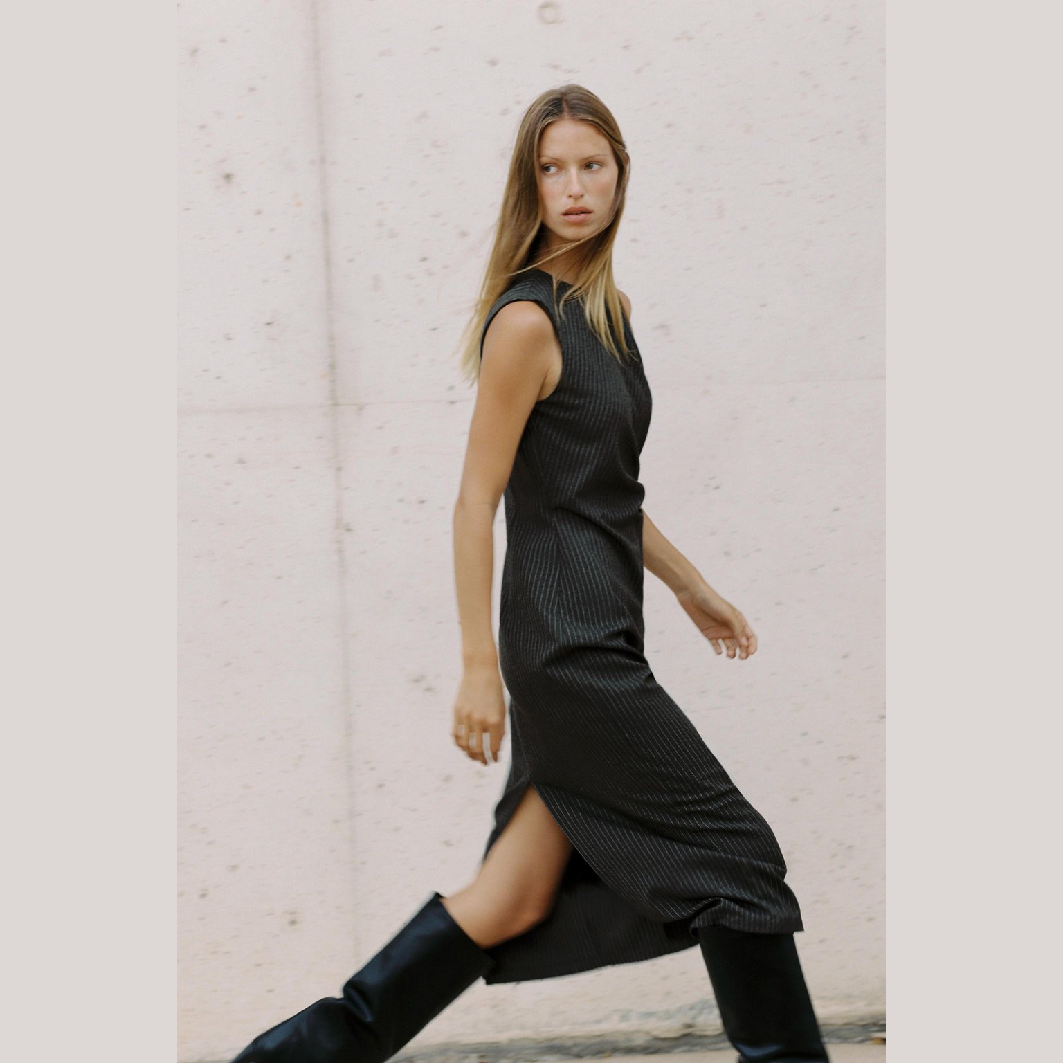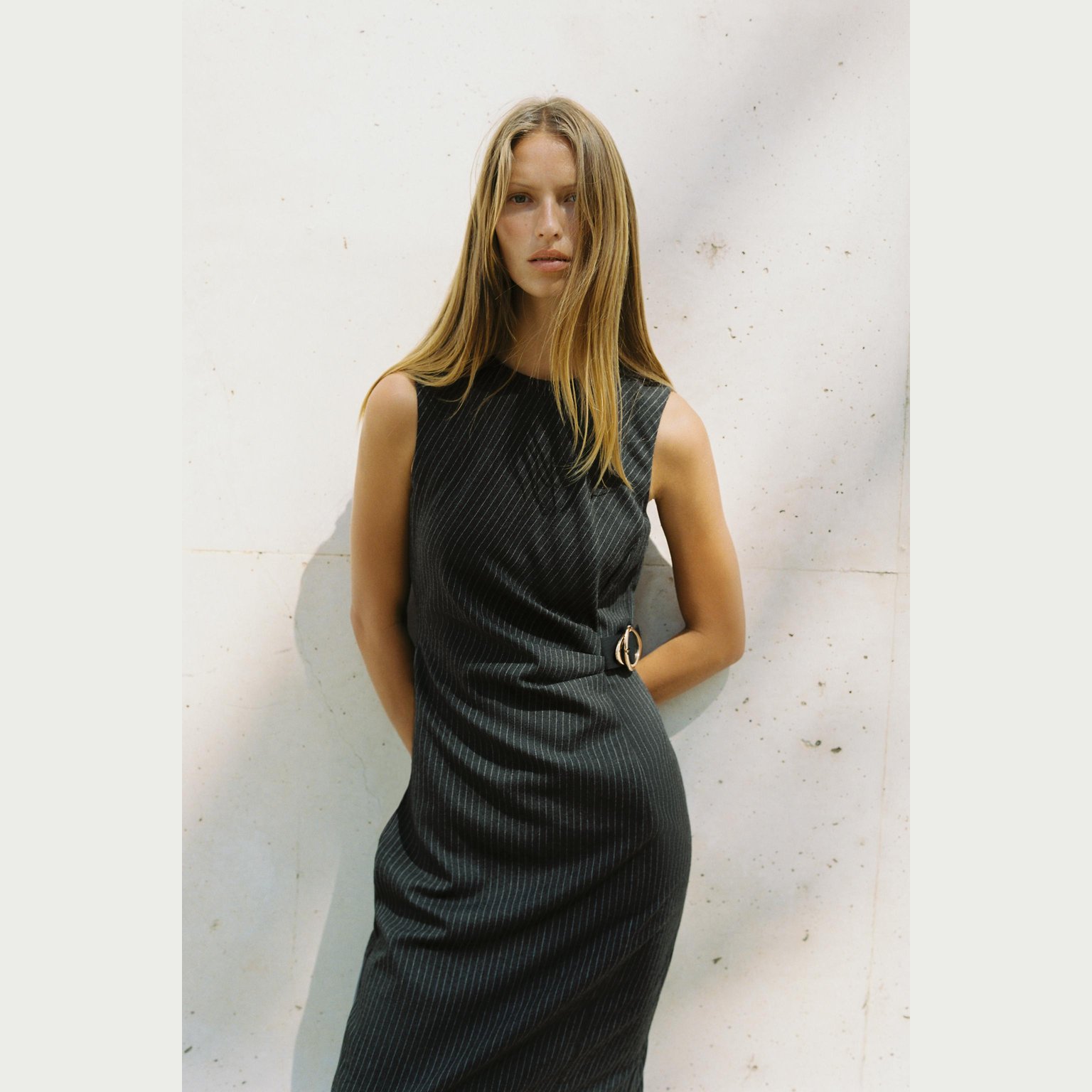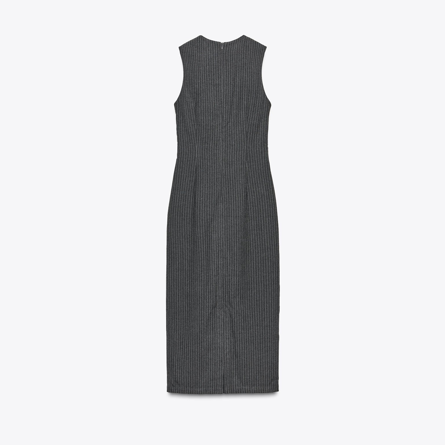 فستان ميدي مخطط مع إبزيم – لون طبيعي (رمادي) – Grey (Striped Midi Dress with Buckle) فستان أنيق بلون رمادي طبيعي، مصنوع من خامة محبوكة بخليط بوليستر وفيكسوز يمنح ملمسًا ناعمًا وانسيابية عملية. يتميز بياقة مستديرة بلا أكمام، مع إبزيم أمامي عند الخصر يضيف لمسة عصرية أنثوية، وحافة مستقيمة بطول ميدي مع شق خلفي. الإغلاق بسحاب مخفي في الخلف. قطعة مثالية للتنسيقات اليومية الكاجوال الأنيقة أو كإطلالة مكتبية راقية.