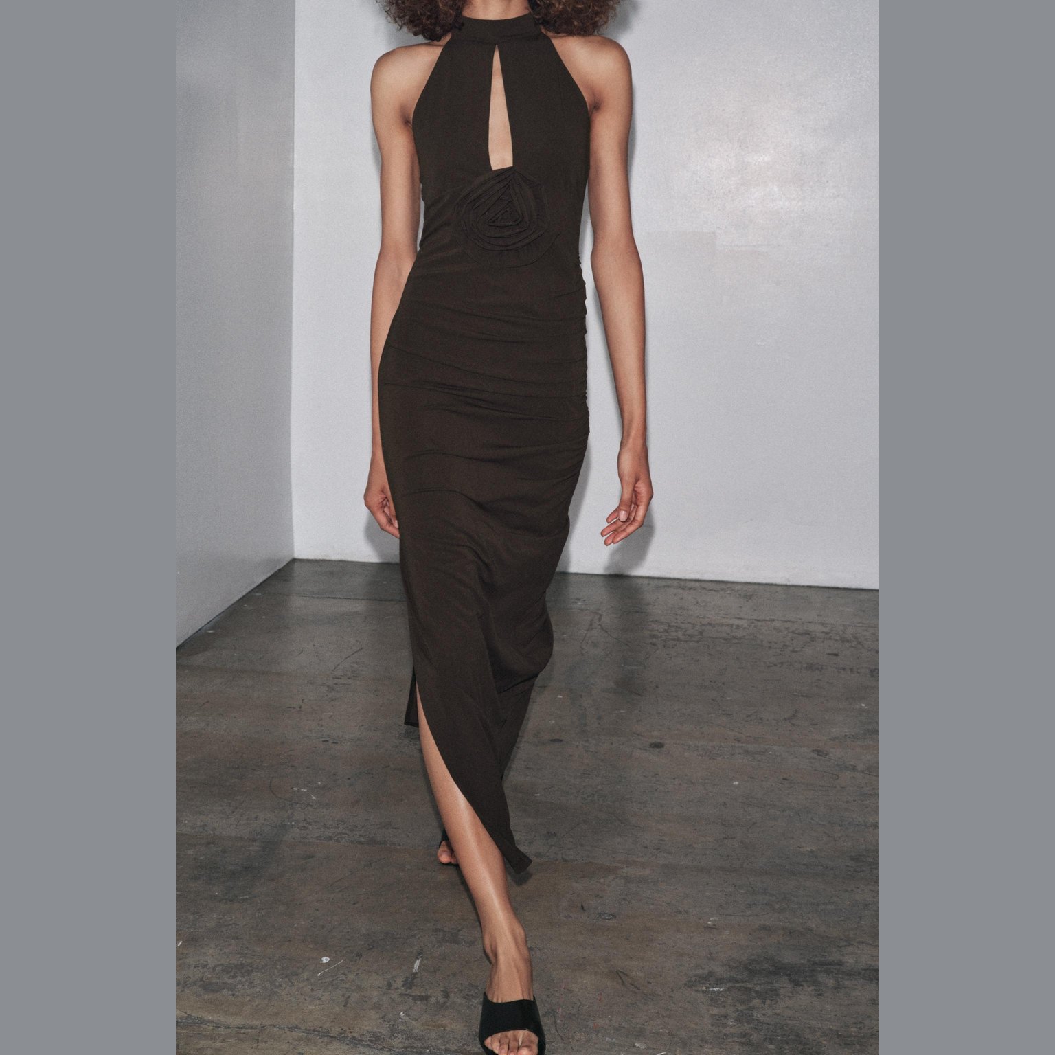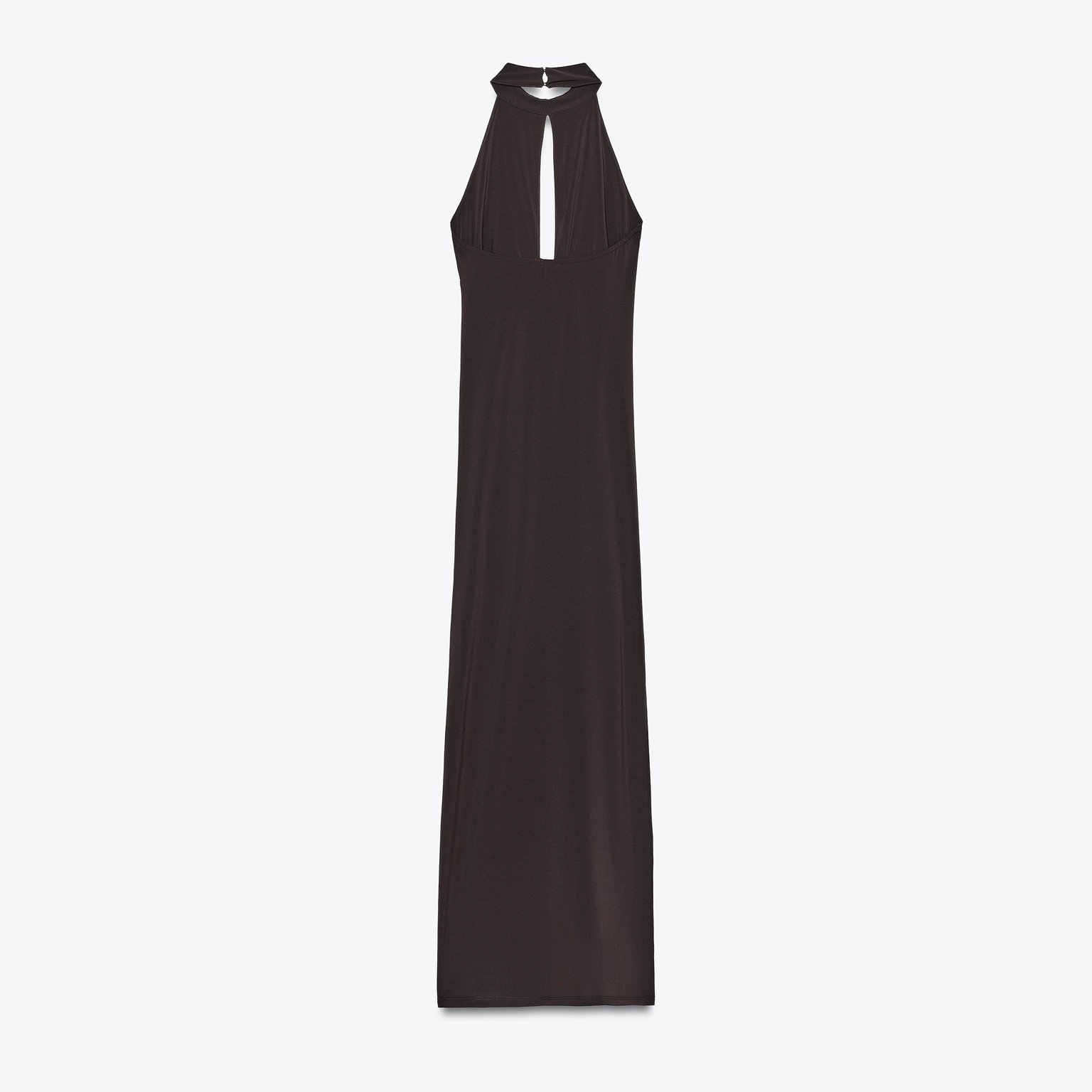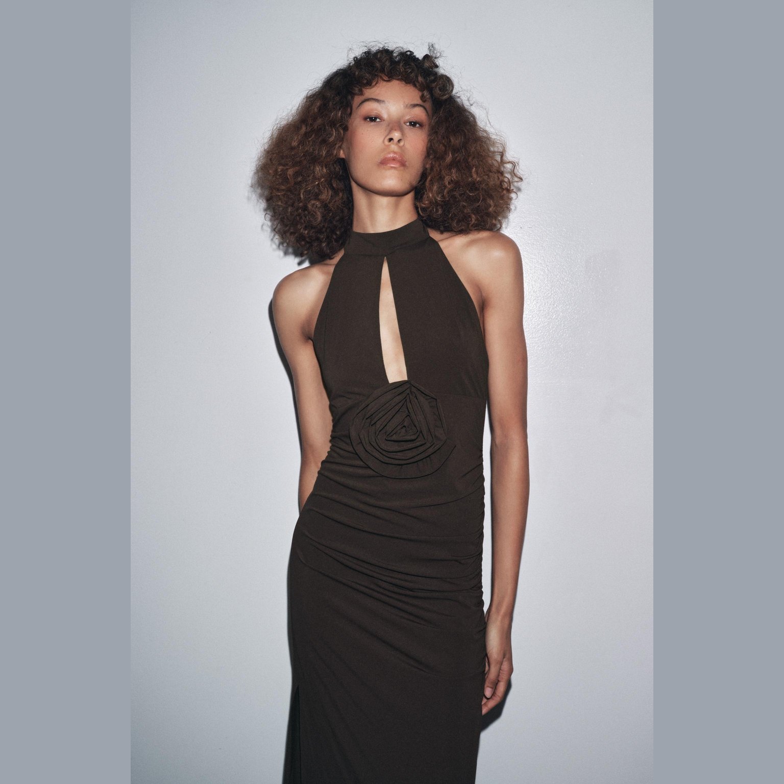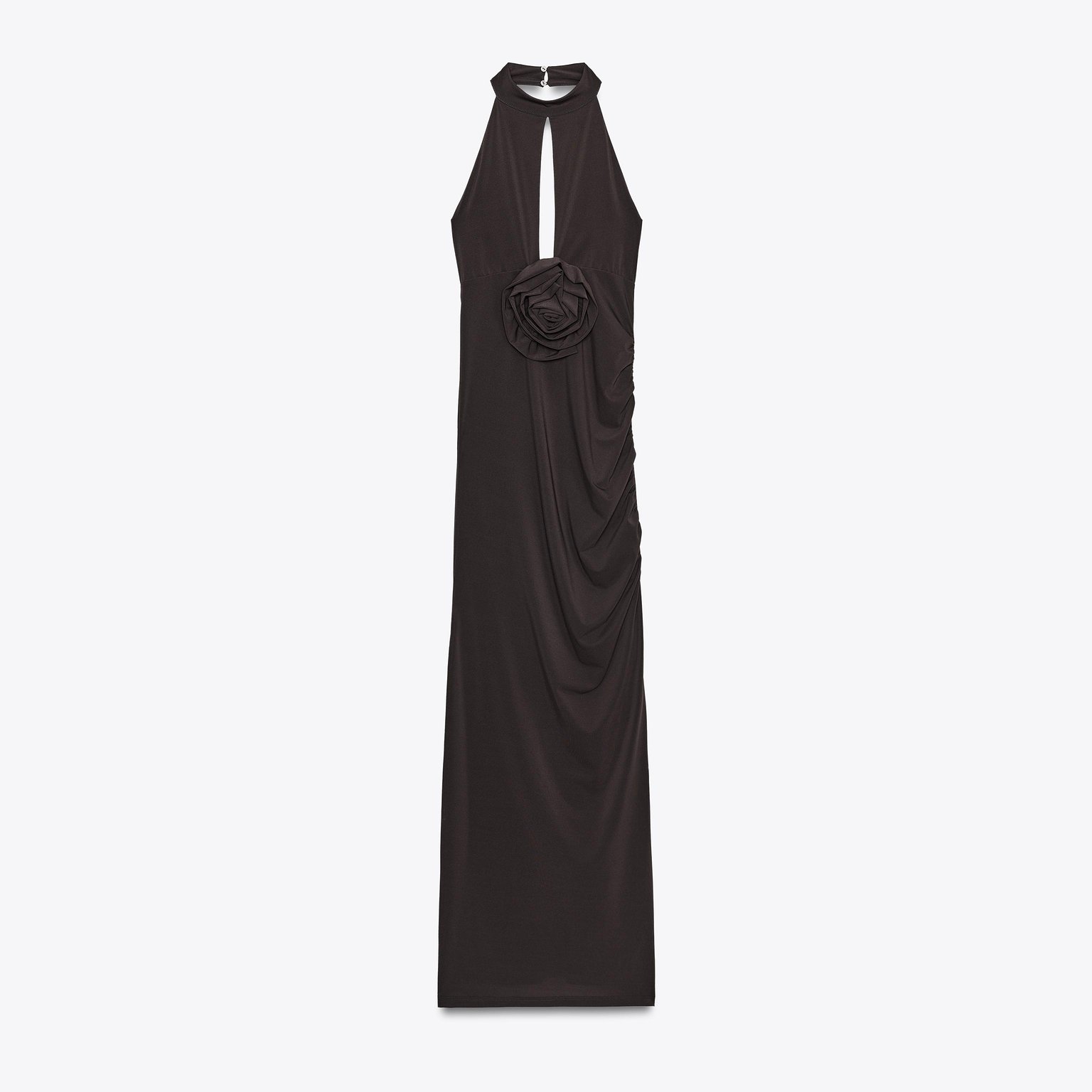 فستان طويل بربطة عنق مع زهرة أمامية – لون طبيعي (بني) – Brown (Halterneck Dress with Flower) فستان أنيق بلون بني طبيعي، مصنوع من خامة محبوكة بخليط بوليستر وإيلاستان يمنح مرونة وانسيابية. يتميز بتصميم بربطة عنق مع ظهر مفتوح، وزهرة بارزة من نفس القماش في الأمام تضيف لمسة أنثوية عصرية. الحافة مستقيمة مع شق جانبي يمنح حركة أنيقة. قطعة مثالية للمناسبات المسائية الأنيقة أو الحفلات الخاصة.