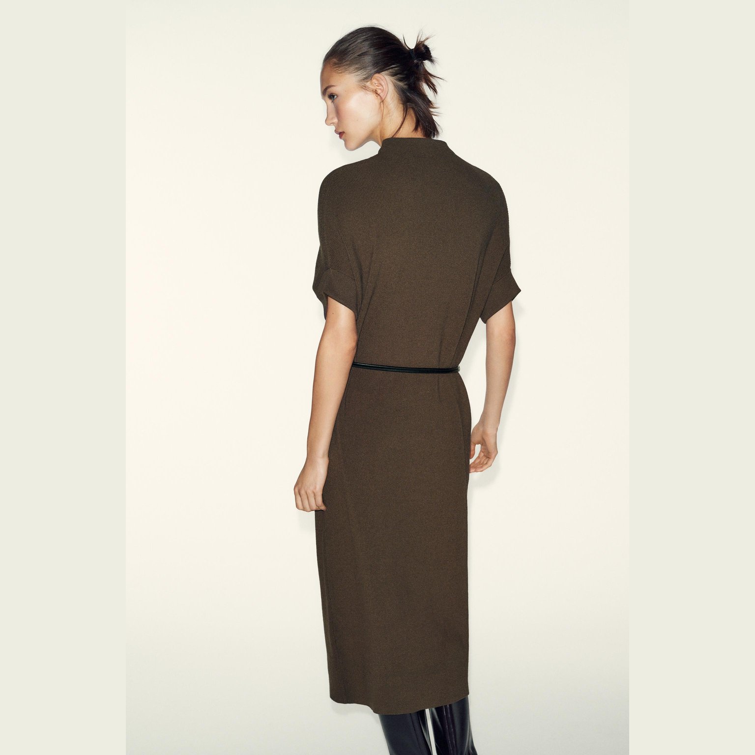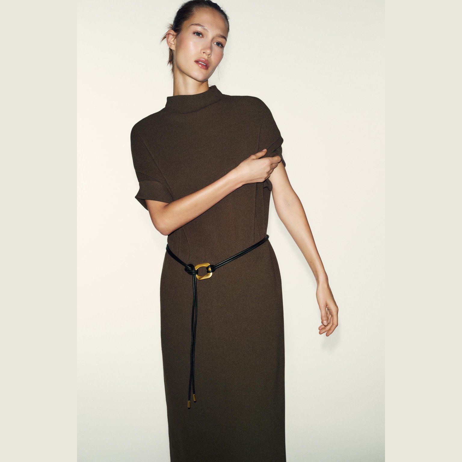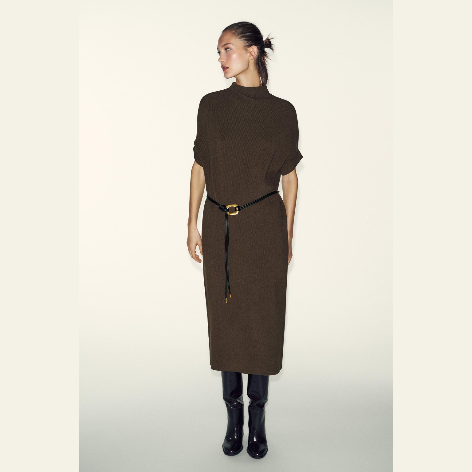 فستان محبوك مع حزام – لون طبيعي (Mink) – Mink (Knit Dress with Belt) فستان أنيق بلون بني فاتح مموج طبيعي (Mink)، مصنوع من خامة محبوكة بخليط فيسكوز وبوليستر يمنح ملمسًا ناعمًا وراحة عملية. يتميز بياقة عالية وأكمام قصيرة مع ثنية، وحزام من خامة جلد صناعي مزود بإبزيم معدني ذهبي. قصة مستقيمة بطول قصير تمنح إطلالة عصرية أنثوية مثالية للتنسيقات اليومية الكاجوال الأنيقة أو كإطلالة مكتبية راقية.