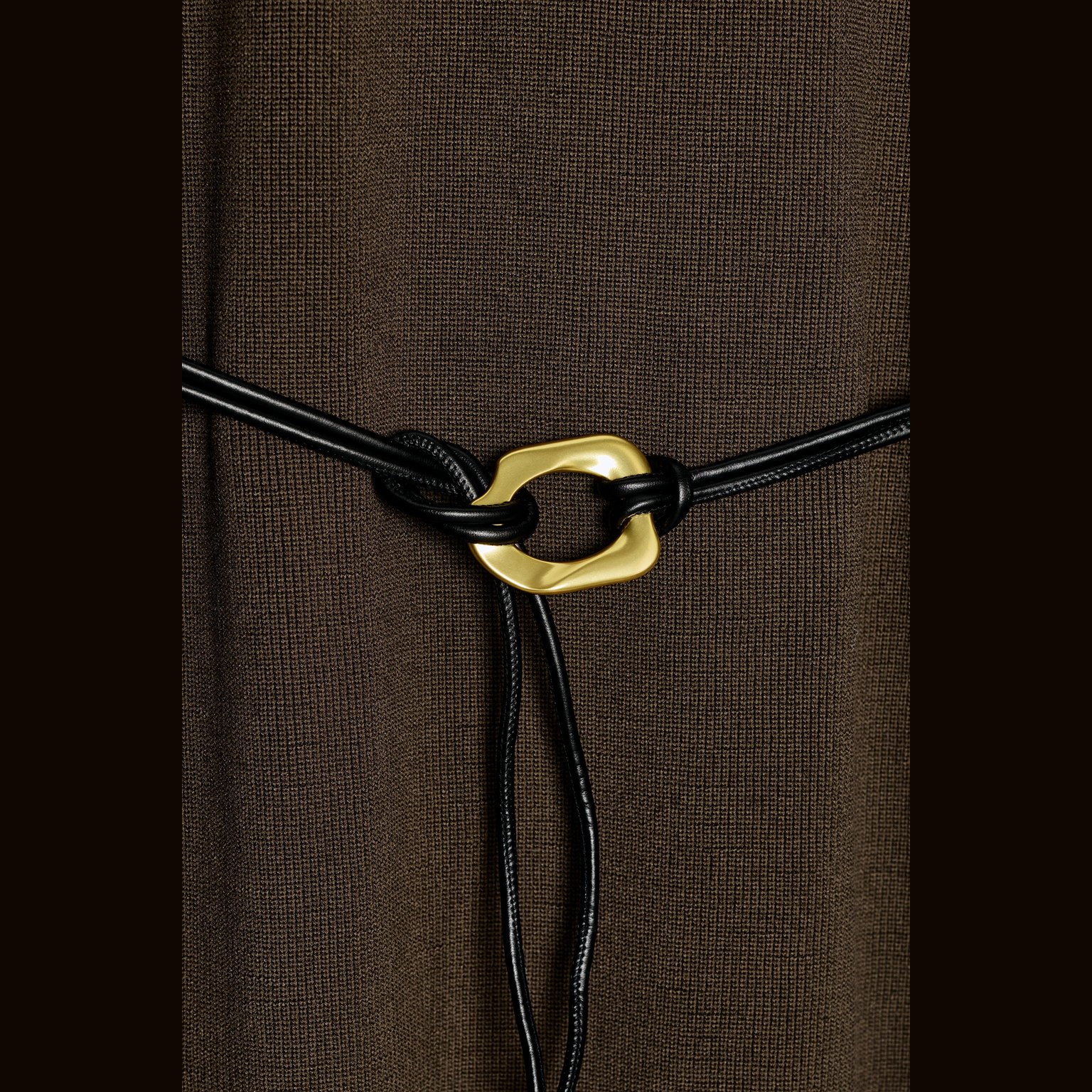 - التفاصيل: حزام جلد صناعي مع إبزيم معدني ذهبي (Leather-Effect Belt with Gold Buckle)