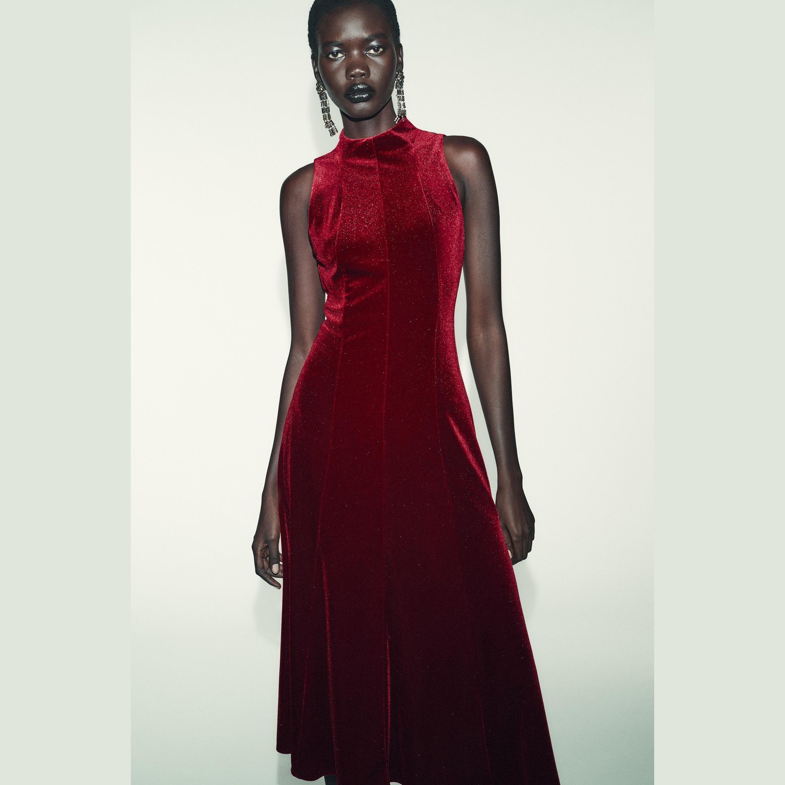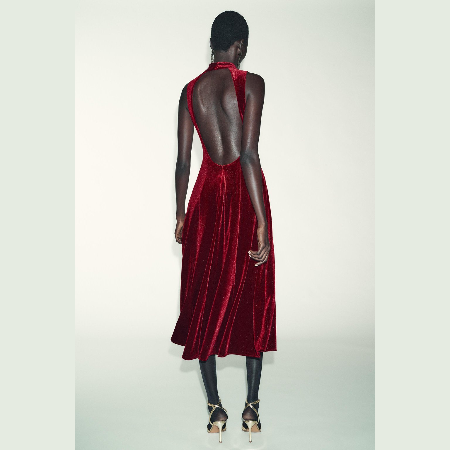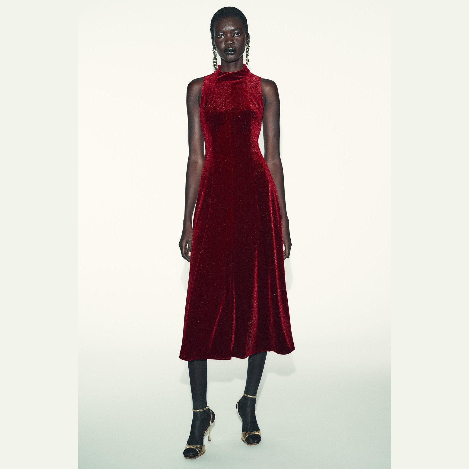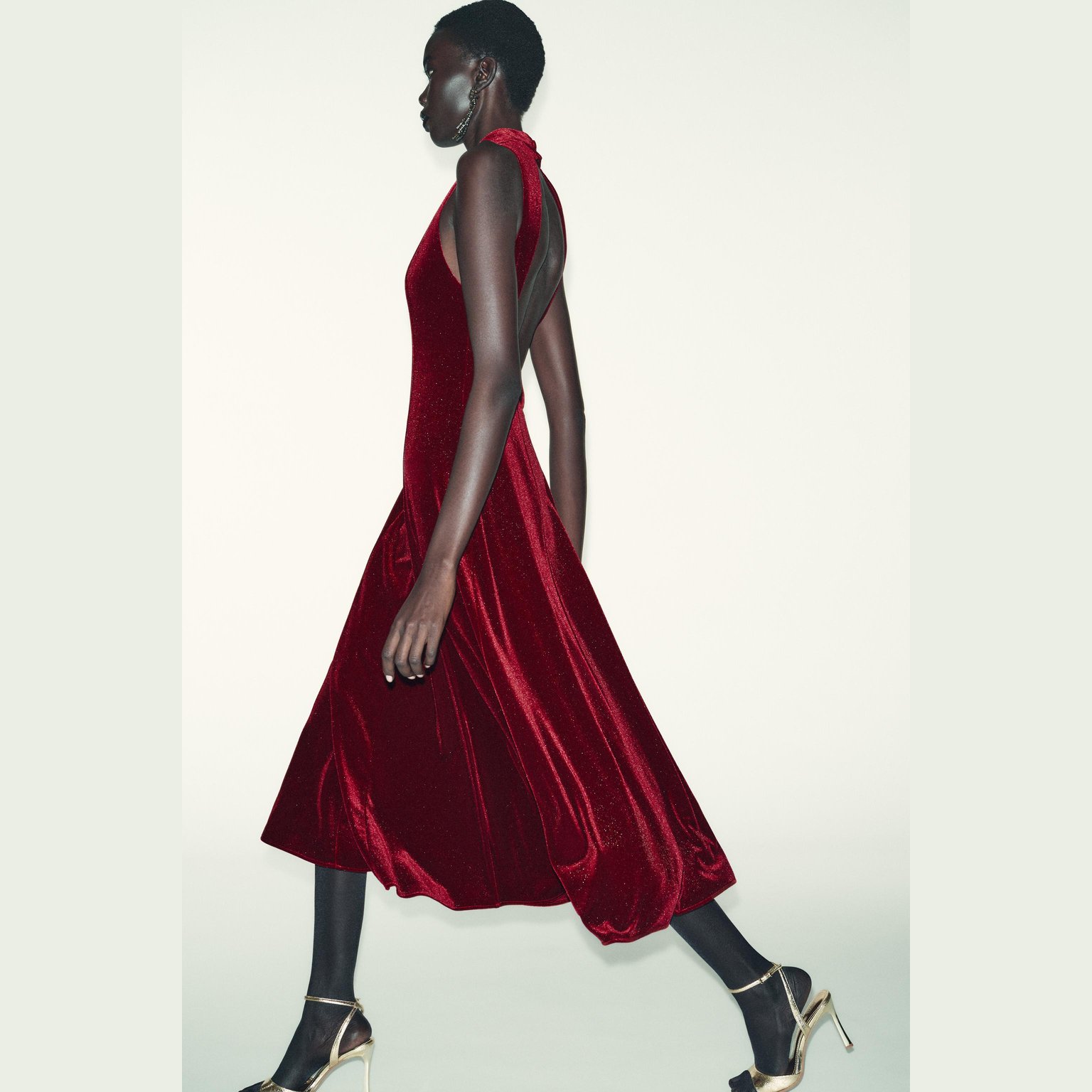 - التصميم: فستان ميدي مخملي (Velvet Midi Dress)