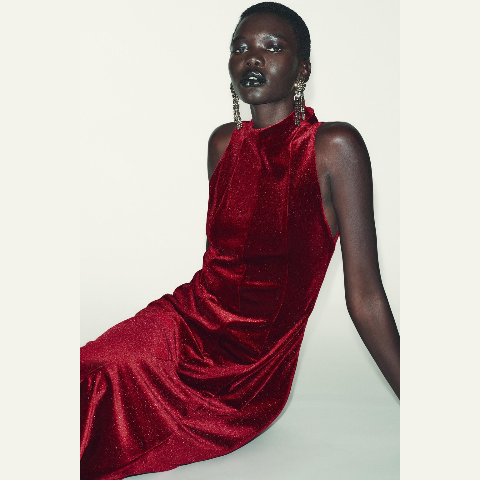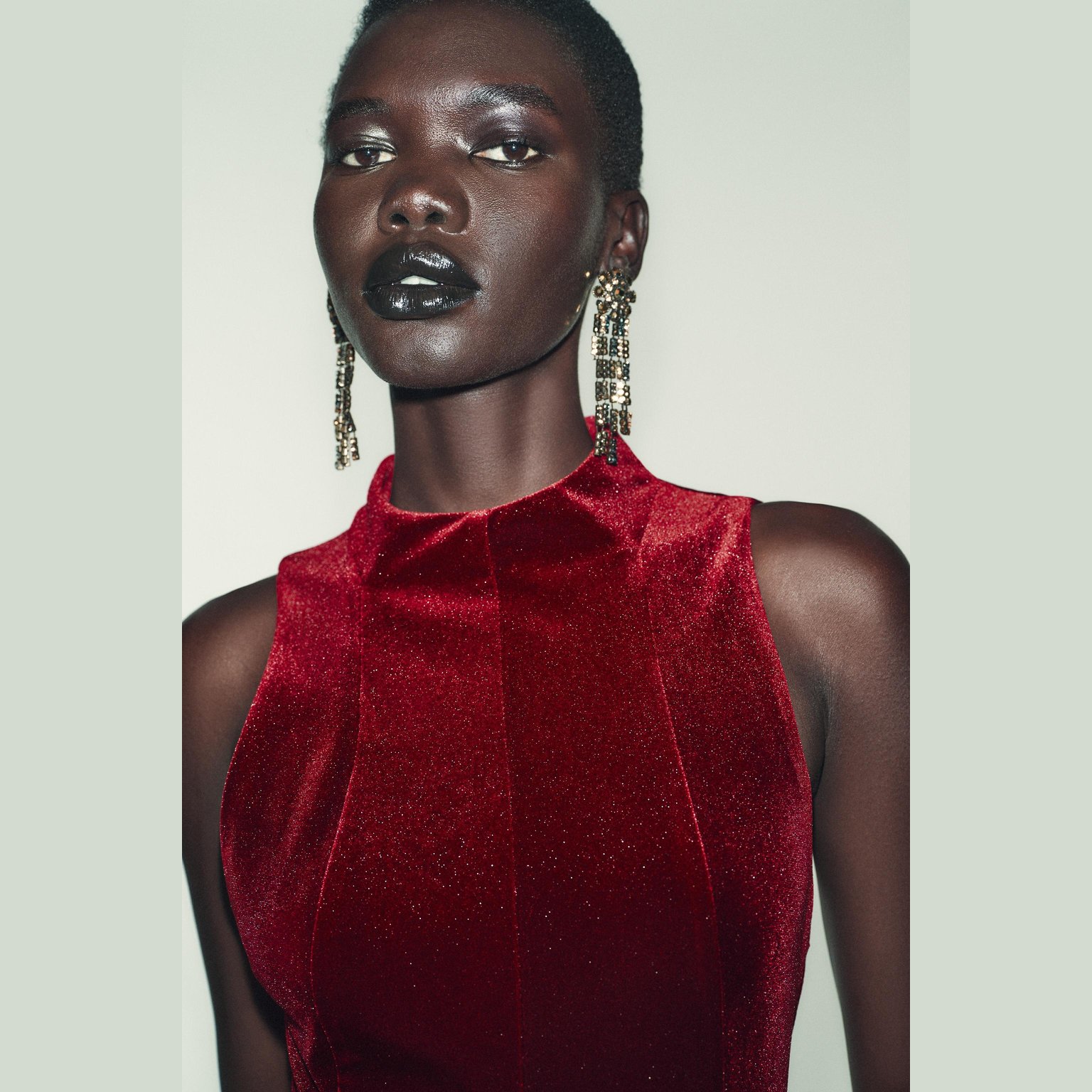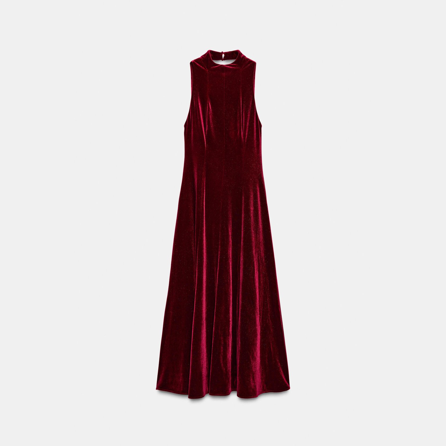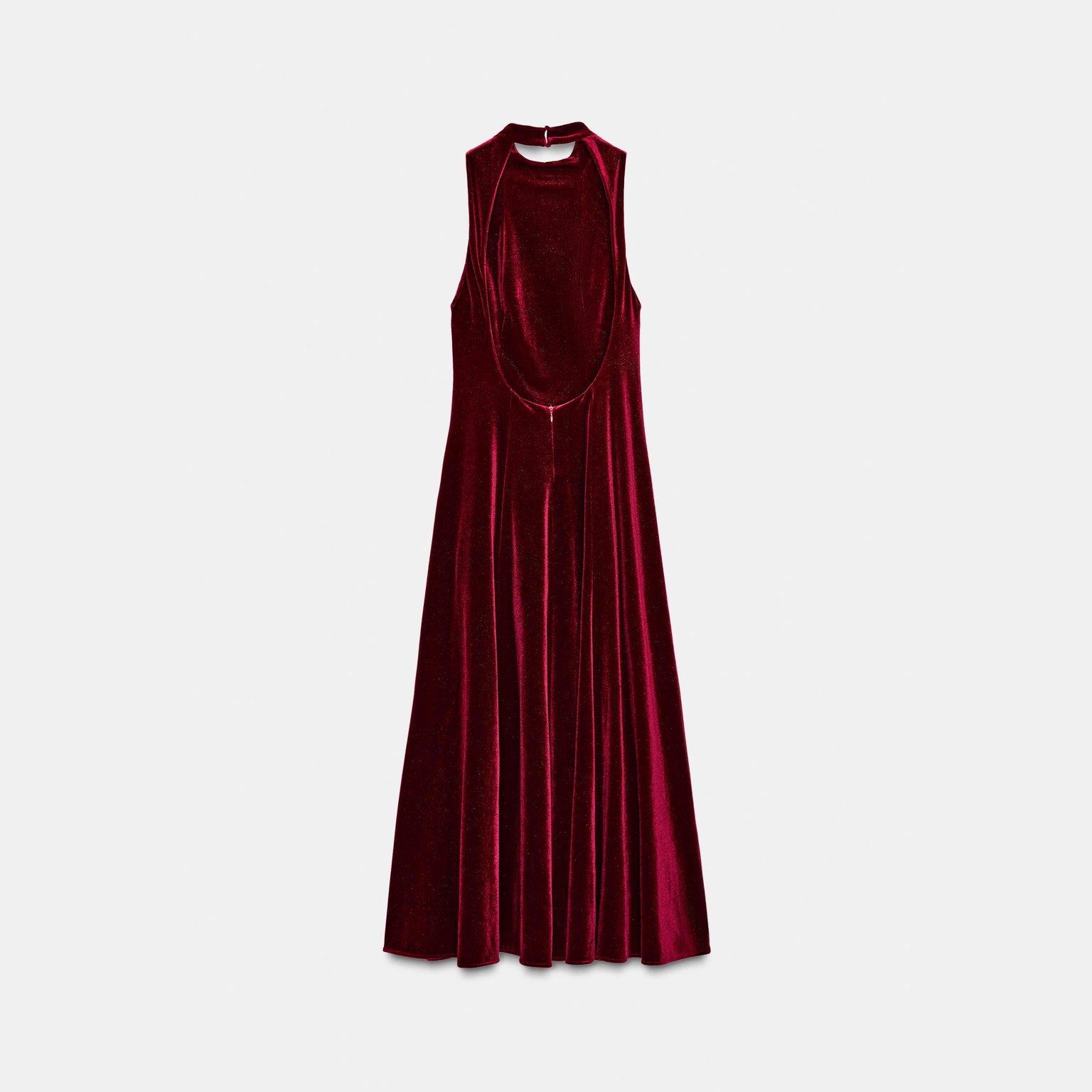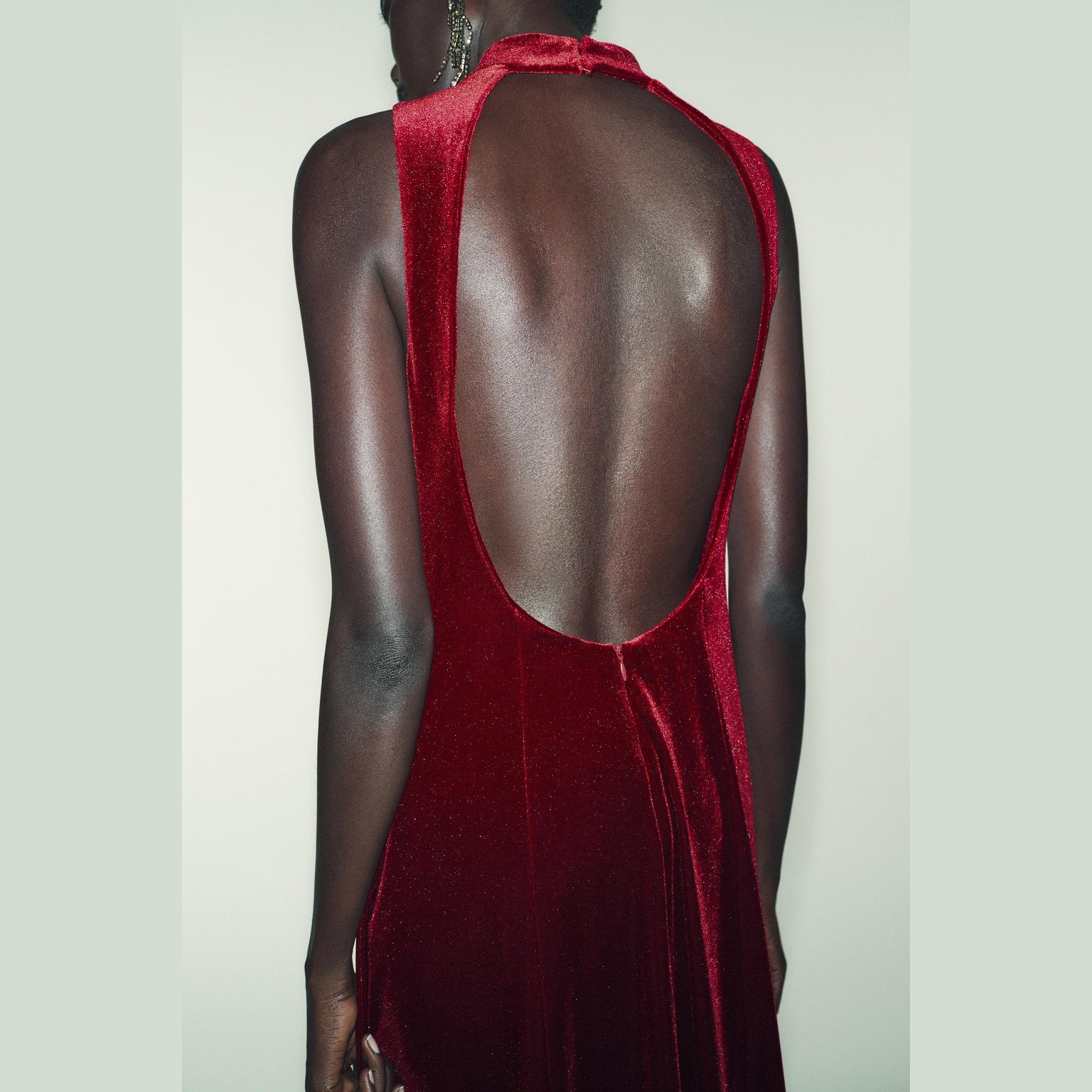 - التصميم: فستان ميدي مخملي (Velvet Midi Dress)