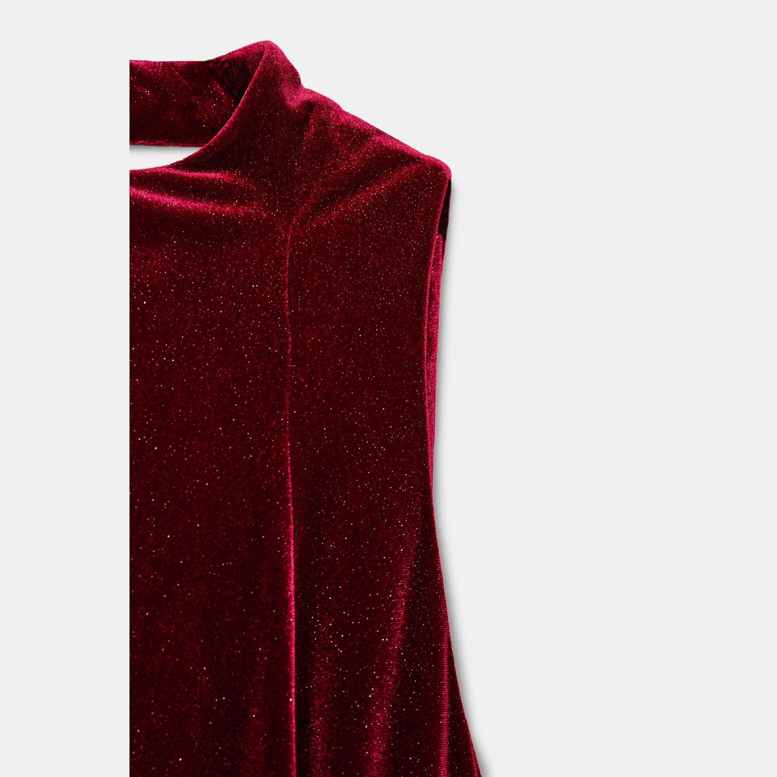 فستان ميدي مخملي – لون طبيعي (خمري) – Burgundy (Velvet Midi Dress) فستان أنيق بلون خمري طبيعي، مصنوع من خامة مخملية بخليط بوليستر وإيلاستان يمنح ملمسًا ناعمًا ومرونة عملية. يتميز بياقة مستديرة أمامية وخلفية مع فتحة صغيرة، وأكمام بلا أكمام، وحافة واسعة متدفقة. الإغلاق خلفي بسحاب مخفي مع أزرار صغيرة. قطعة مثالية للتنسيقات المسائية الأنيقة أو المناسبات الخاصة.