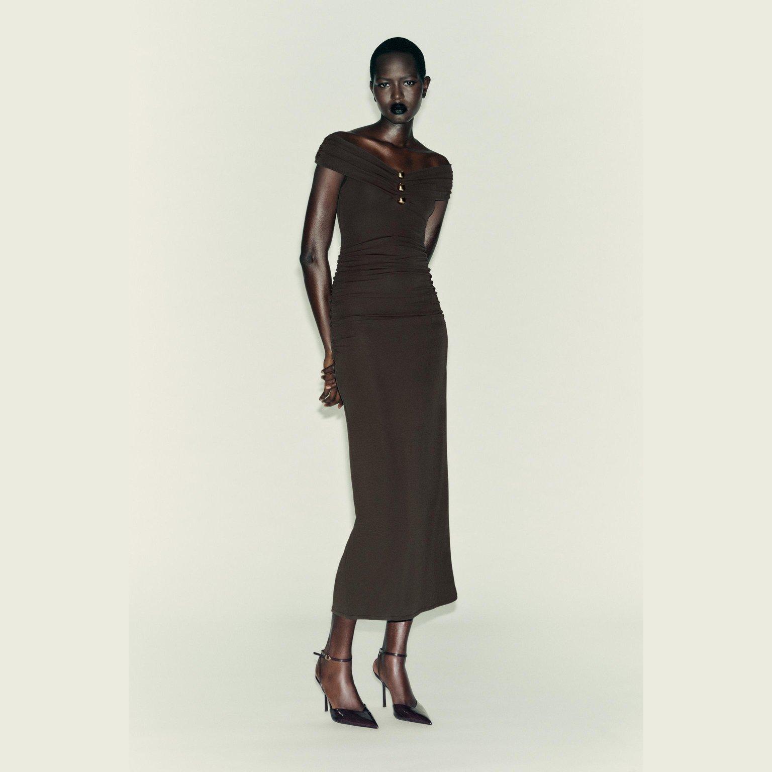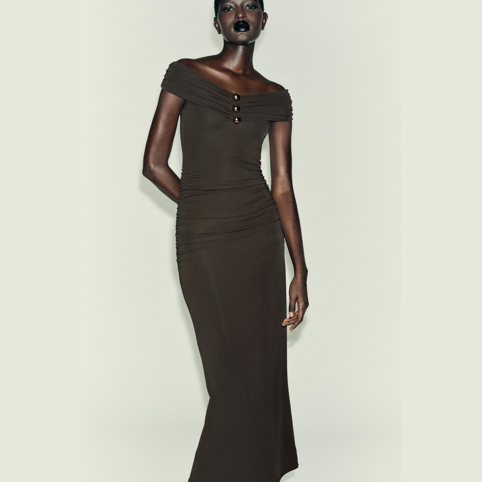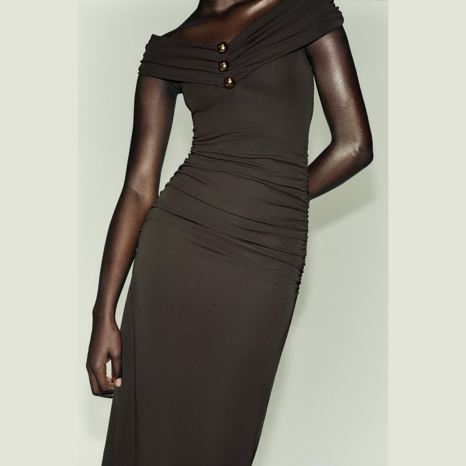 فستان طويل درابيه – لون طبيعي (كاكي داكن) – Dark Khaki (Long Draped Dress) فستان أنيق بلون كاكي داكن طبيعي، مصنوع من خامة محبوكة بخليط بوليستر وإيلاستان يمنح مرونة وانسيابية. يتميز بياقة مستقيمة مكشوفة الكتفين مع تفاصيل درابيه جانبية، وحلية معدنية أمامية تضيف لمسة فاخرة. الحافة مستقيمة بطول طويل تمنح إطلالة أنثوية راقية مثالية للمناسبات المسائية الأنيقة أو الحفلات الخاصة.