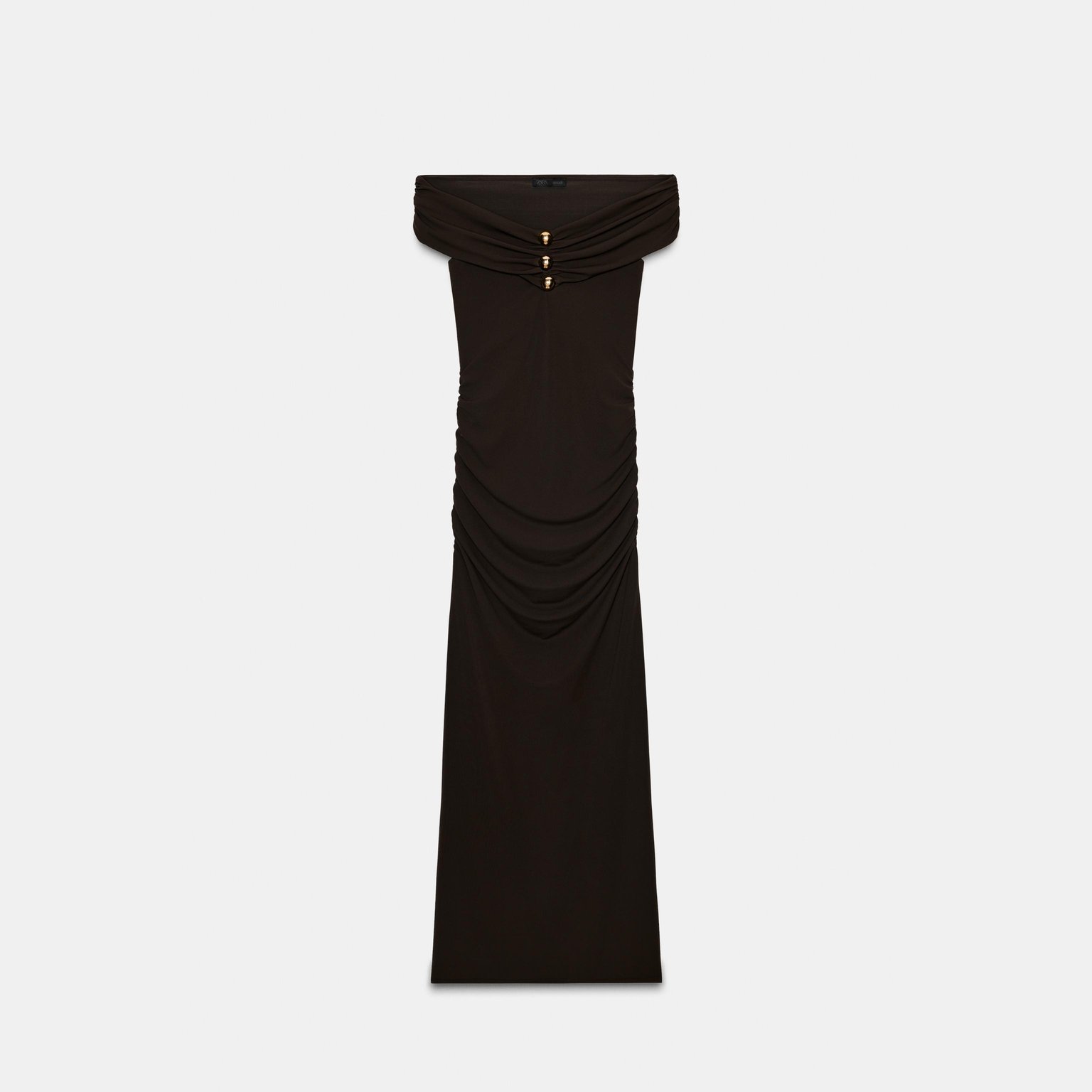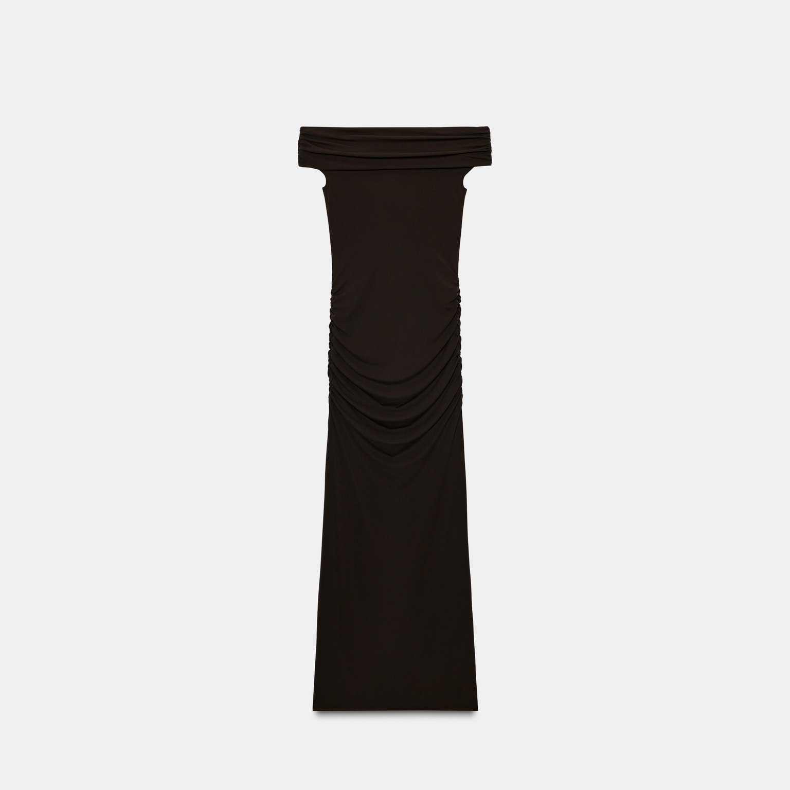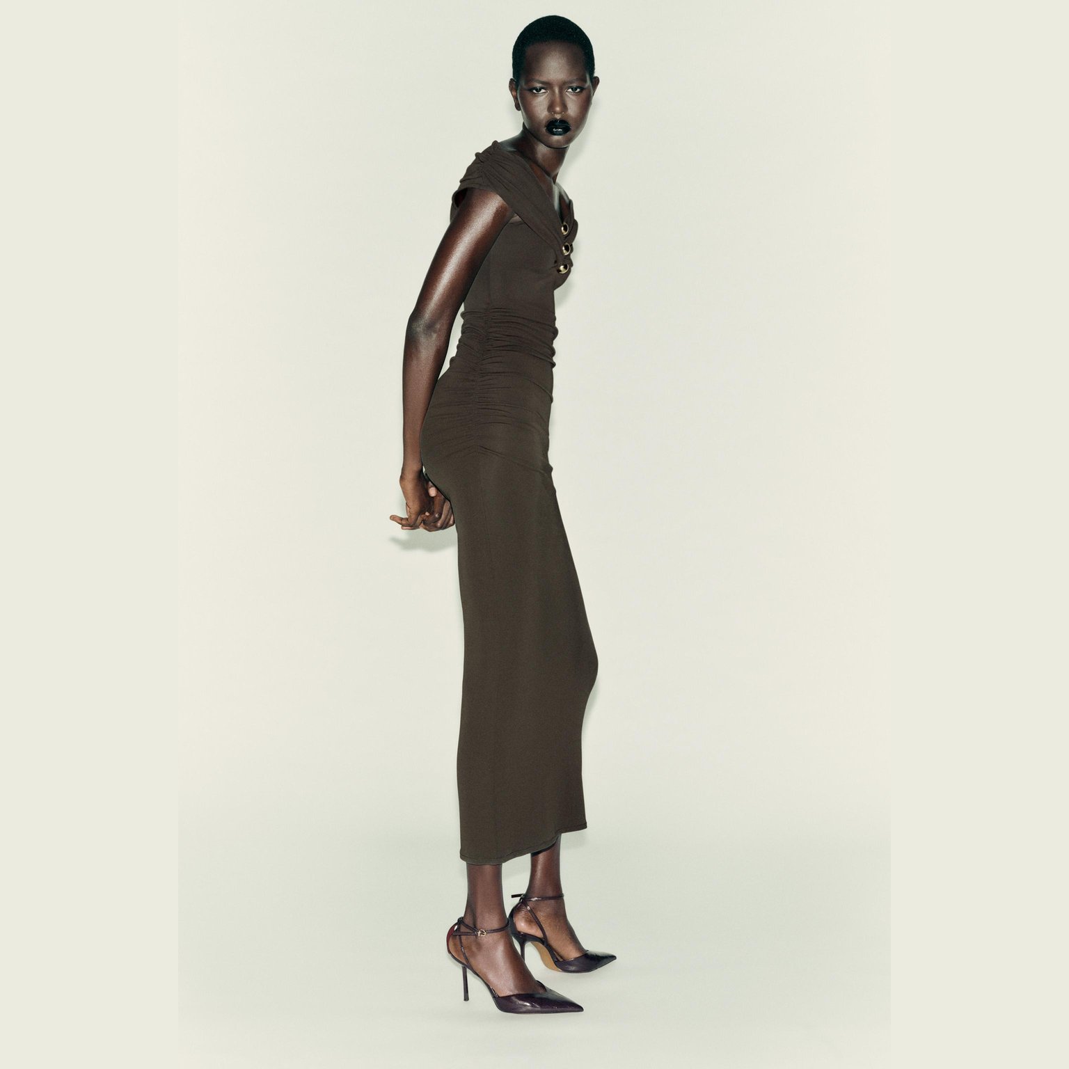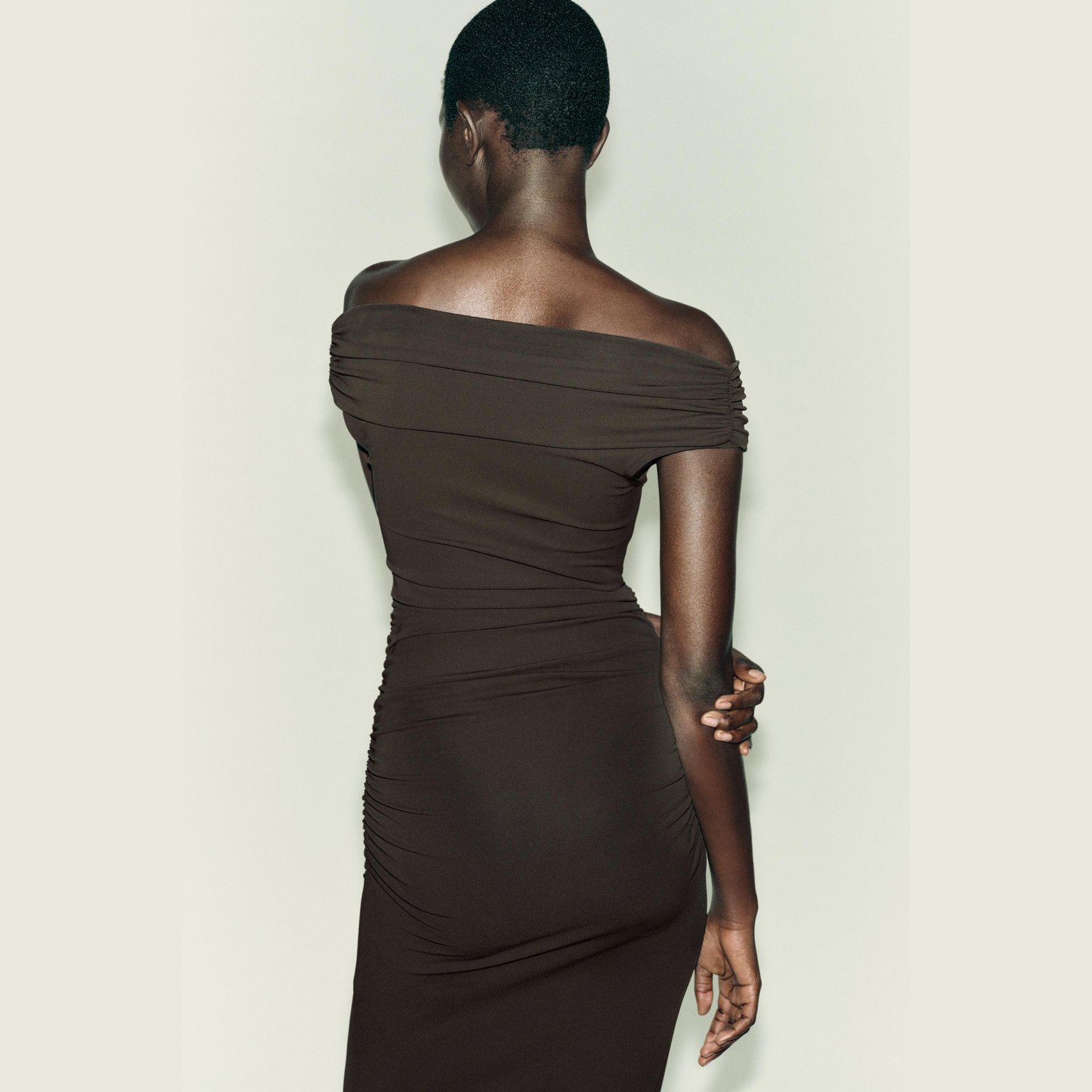 فستان طويل درابيه – لون طبيعي (كاكي داكن) – Dark Khaki (Long Draped Dress) فستان أنيق بلون كاكي داكن طبيعي، مصنوع من خامة محبوكة بخليط بوليستر وإيلاستان يمنح مرونة وانسيابية. يتميز بياقة مستقيمة مكشوفة الكتفين مع تفاصيل درابيه جانبية، وحلية معدنية أمامية تضيف لمسة فاخرة. الحافة مستقيمة بطول طويل تمنح إطلالة أنثوية راقية مثالية للمناسبات المسائية الأنيقة أو الحفلات الخاصة.