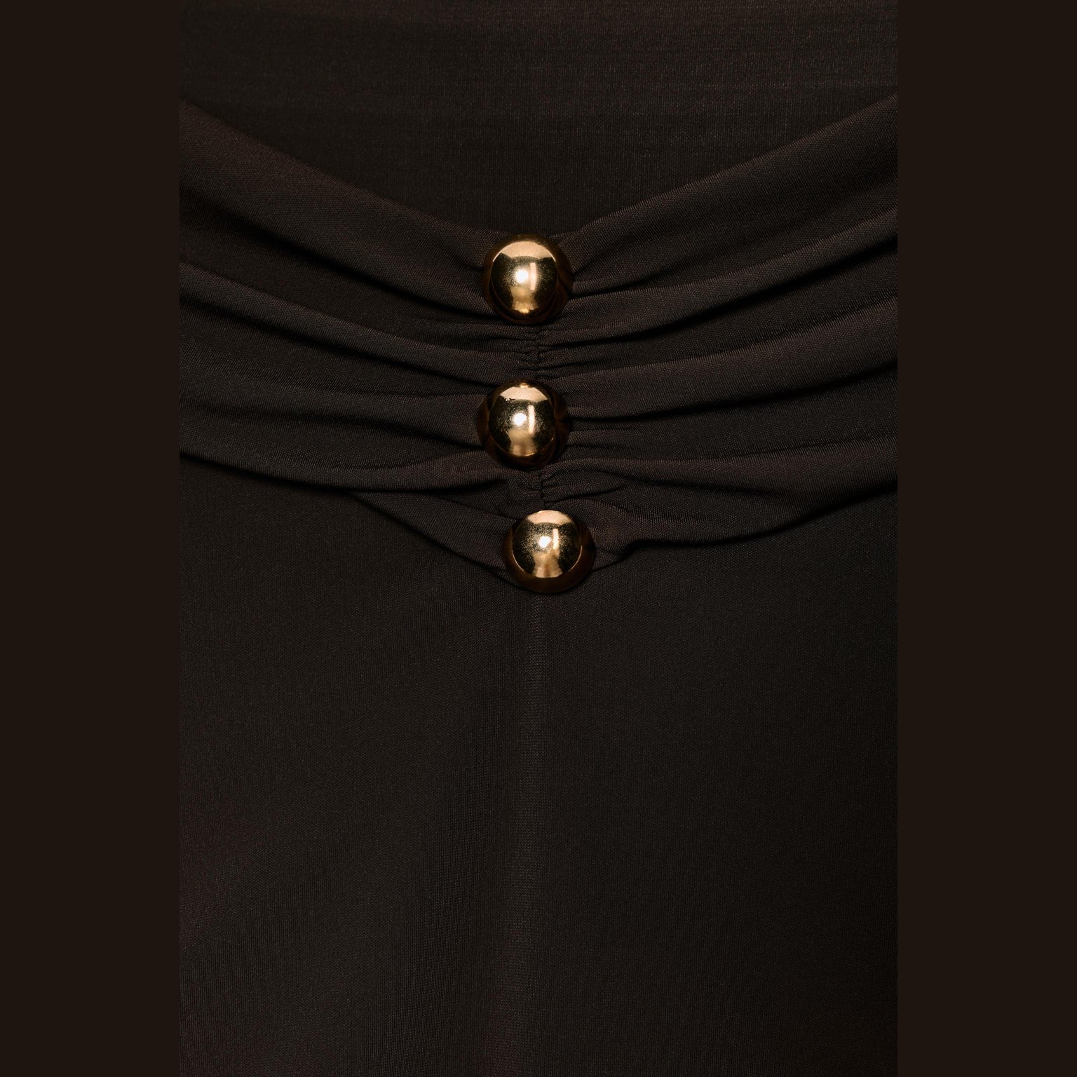 - التفاصيل: درابيه جانبية + حلية معدنية أمامية (Side Draped Detail + Metallic Appliqué)
