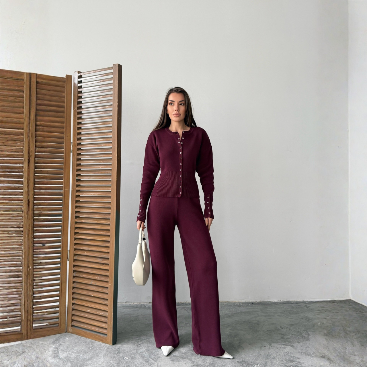 كنزة بأكمام طويلة وأزرار أمامية مع خصر مضلع يبرز القوام بشكل أنيق، وبنطال واسع بقصة مستقيمة عالية الخصر يمنح مظهراً طويلاً وانسيابياً.