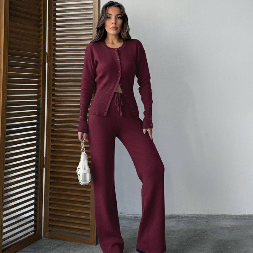 إطلالة أنيقة تجمع بين الراحة والفخامة بتصميم عصري بلون موحد يمنحك مظهراً مرتباً وسهلاً للتنسيق في مختلف الأوقات. الطقم مكوّن من كنزة بأزرار أمامية وقصة محددة عند الخصر مع بنطال واسع بقصة مستقيمة تمنح حرية بالحركة وأناقة يومية، مناسب للإطلالات الكاجوال الراقية أو للخروج والعمل والسفر.