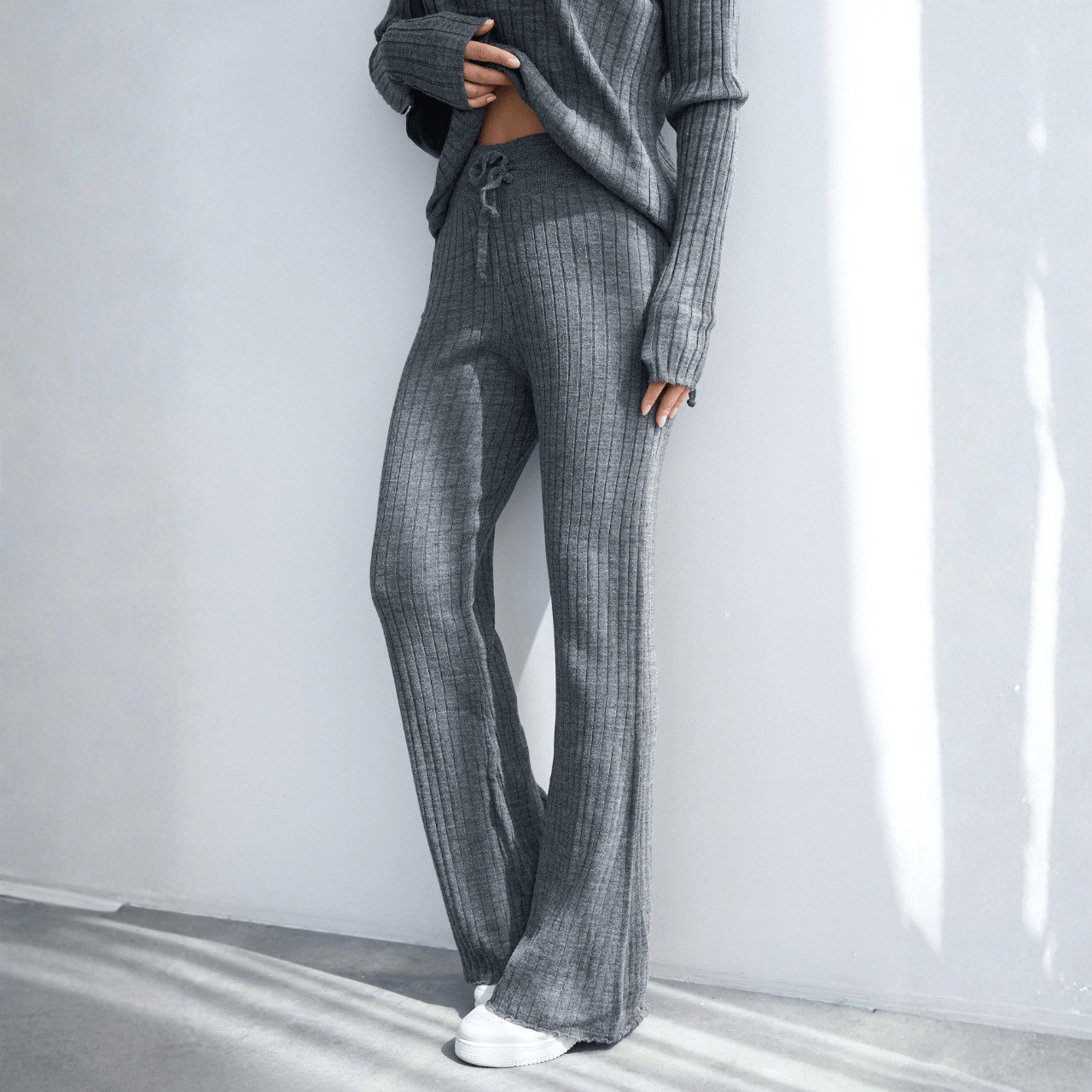 كنزة بقصة مريحة مع أكمام طويلة وتصميم مضلع، مع بنطال واسع بقصة مستقيمة وخصر مطاطي برباط يمنح راحة ومرونة بالحركة.