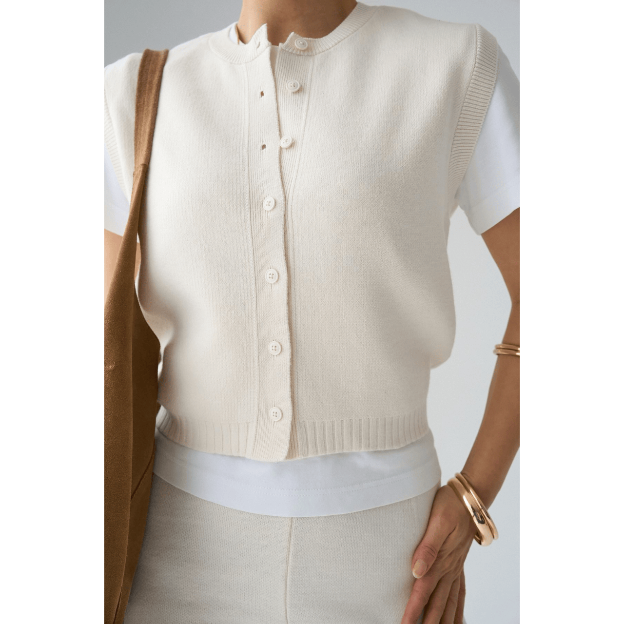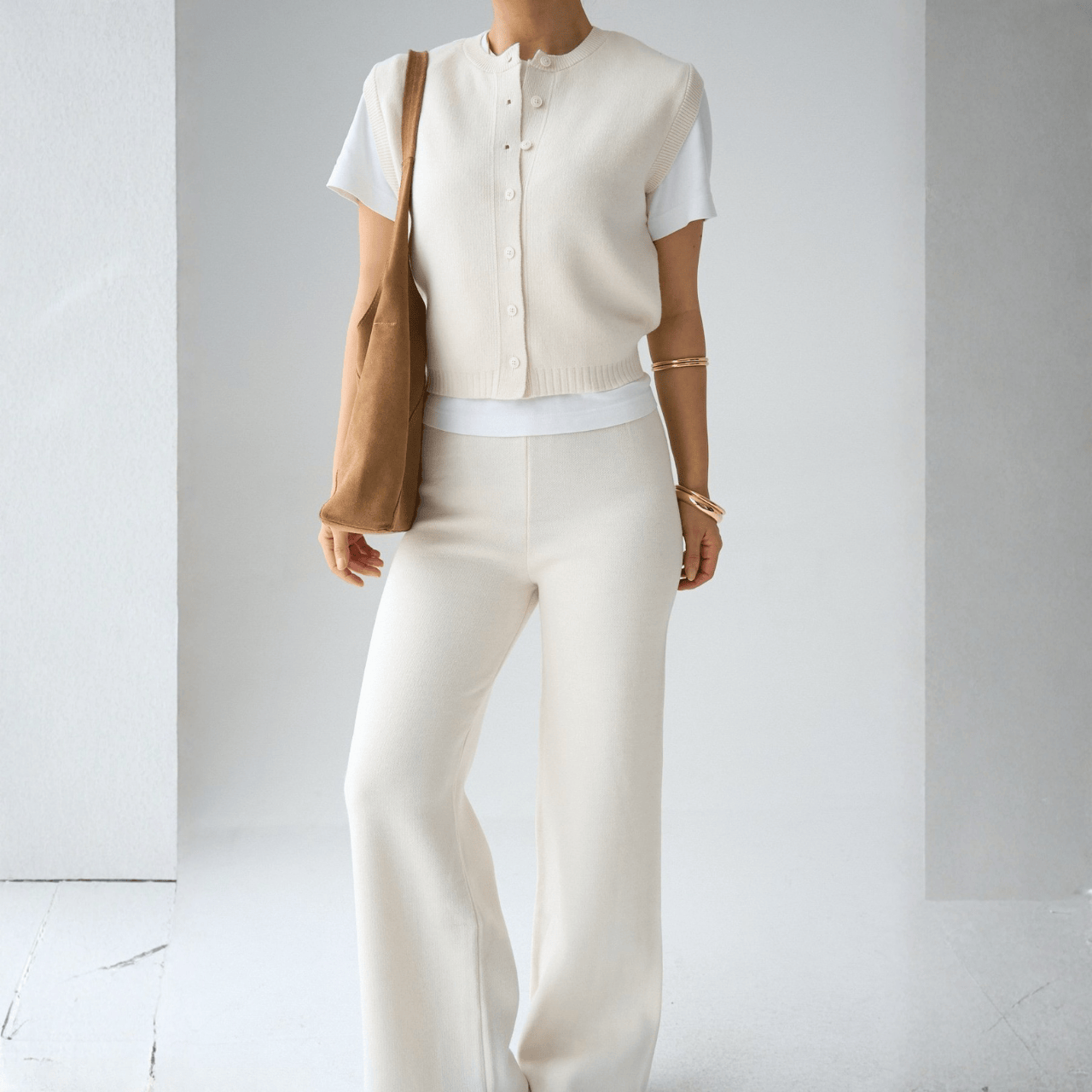 طقم أنيق بلون هادئ يمنحك إطلالة راقية وعصرية بلمسة من البساطة والفخامة. يتكوّن من فيست بأزرار أمامية بقصة مريحة يمكن تنسيقه بمفرده أو فوق تيشيرت أو قميص، مع بنطال واسع بقصة مستقيمة يمنح مظهراً طويلاً وانسيابياً. خيار مثالي للإطلالات اليومية الأنيقة أو للعمل والسفر مع سهولة في التنسيق مع مختلف القطع.