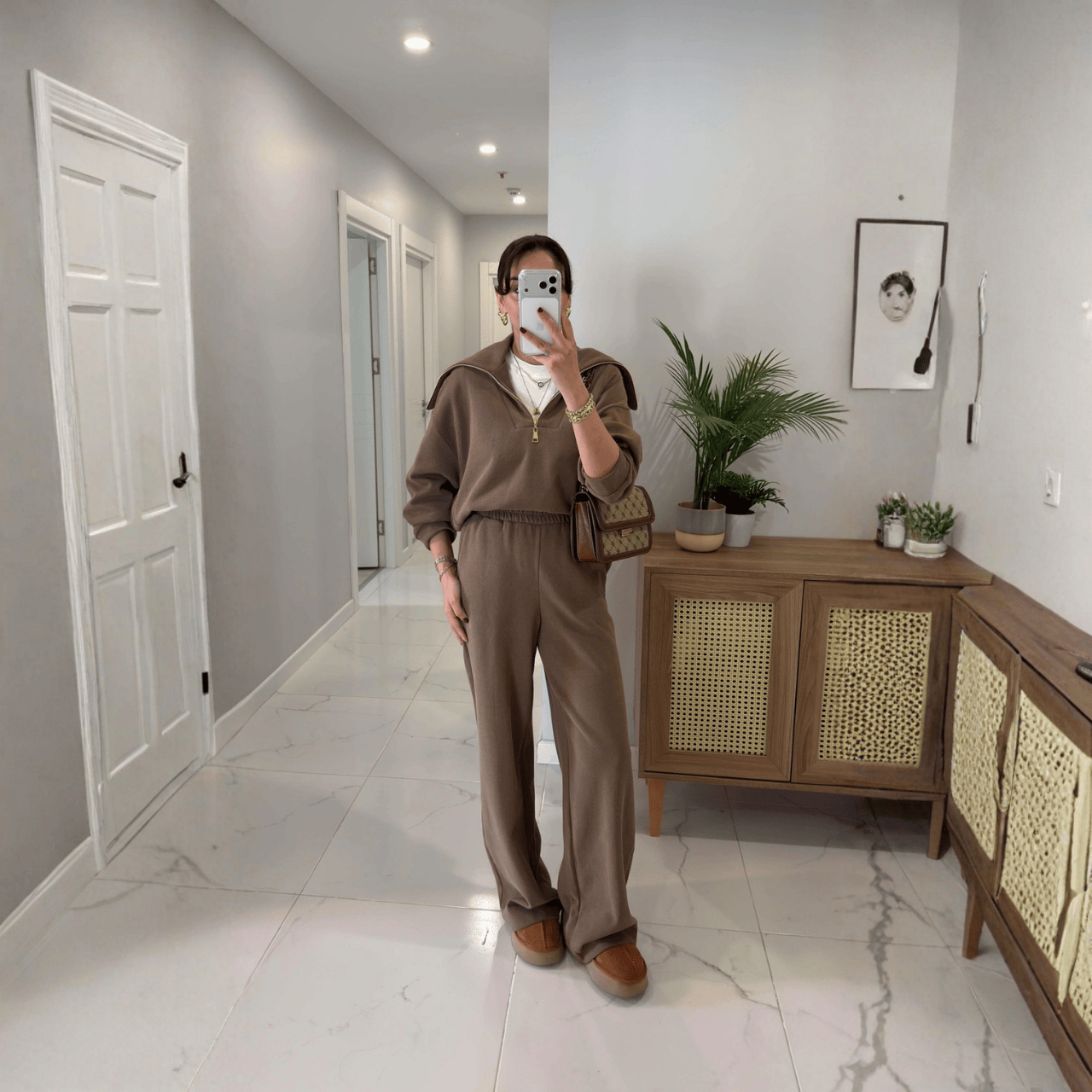 طقم رياضي أنيق يمنحك إطلالة عصرية ومريحة في آنٍ واحد، مثالي للإطلالات اليومية، السفر أو الأنشطة الخفيفة. يتميز بتصميم بسيط وعملي يتكوّن من سويت شيرت بسحاب أمامي مع قبعة، وبنطال مريح بقصة واسعة وخصر مطاطي مع رباط قابل للتعديل، ليمنحك حرية حركة ومظهراً أنيقاً طوال اليوم.