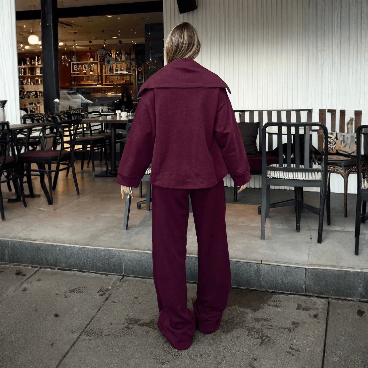 جاكيت بقصة مريحة مع سحاب أمامي وقبعة، مع بنطال بقصة مستقيمة واسعة وخصر مطاطي برباط لتثبيت أفضل وراحة أكبر.
