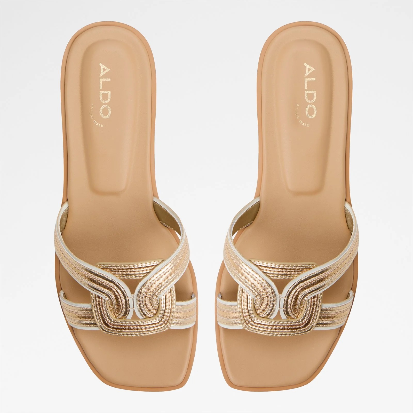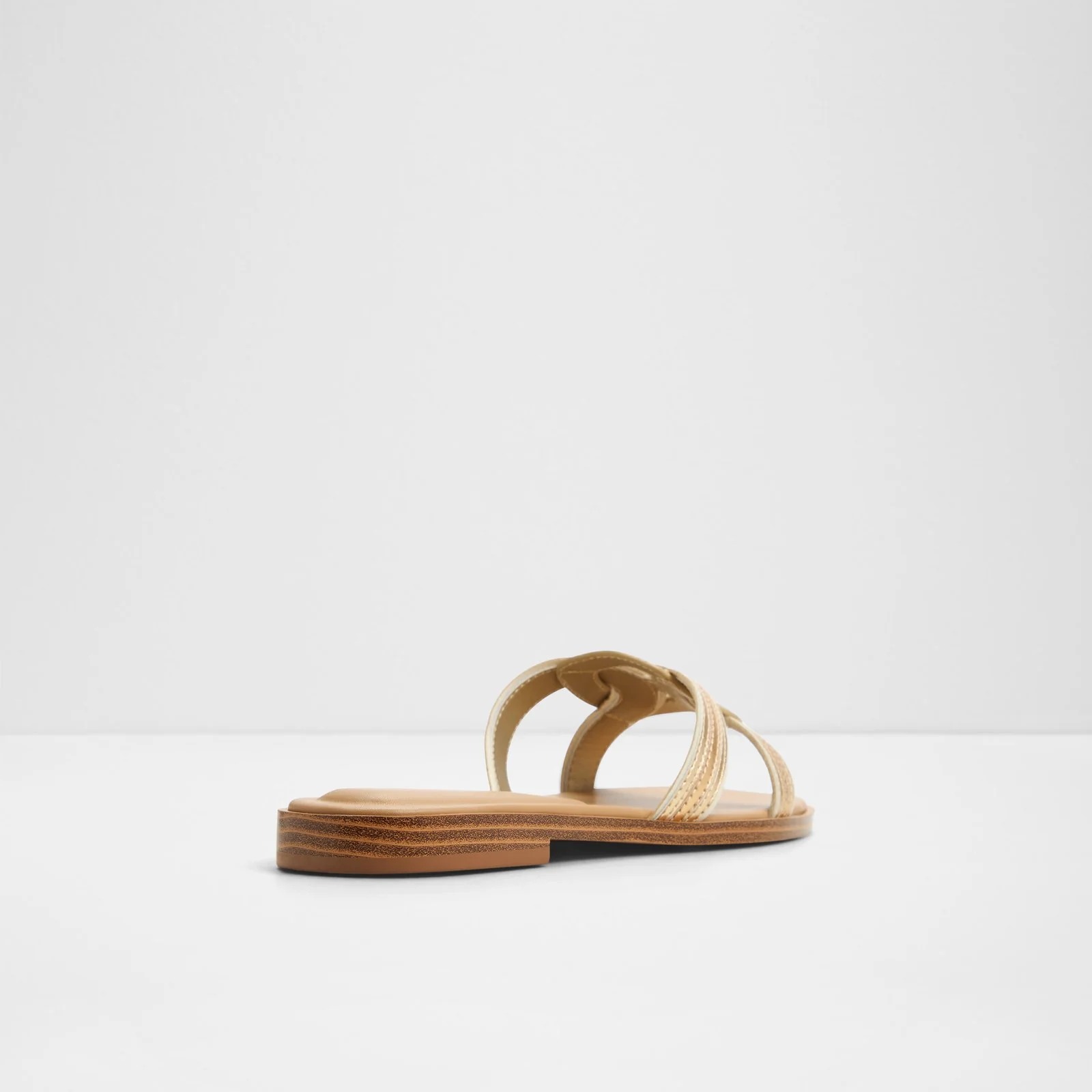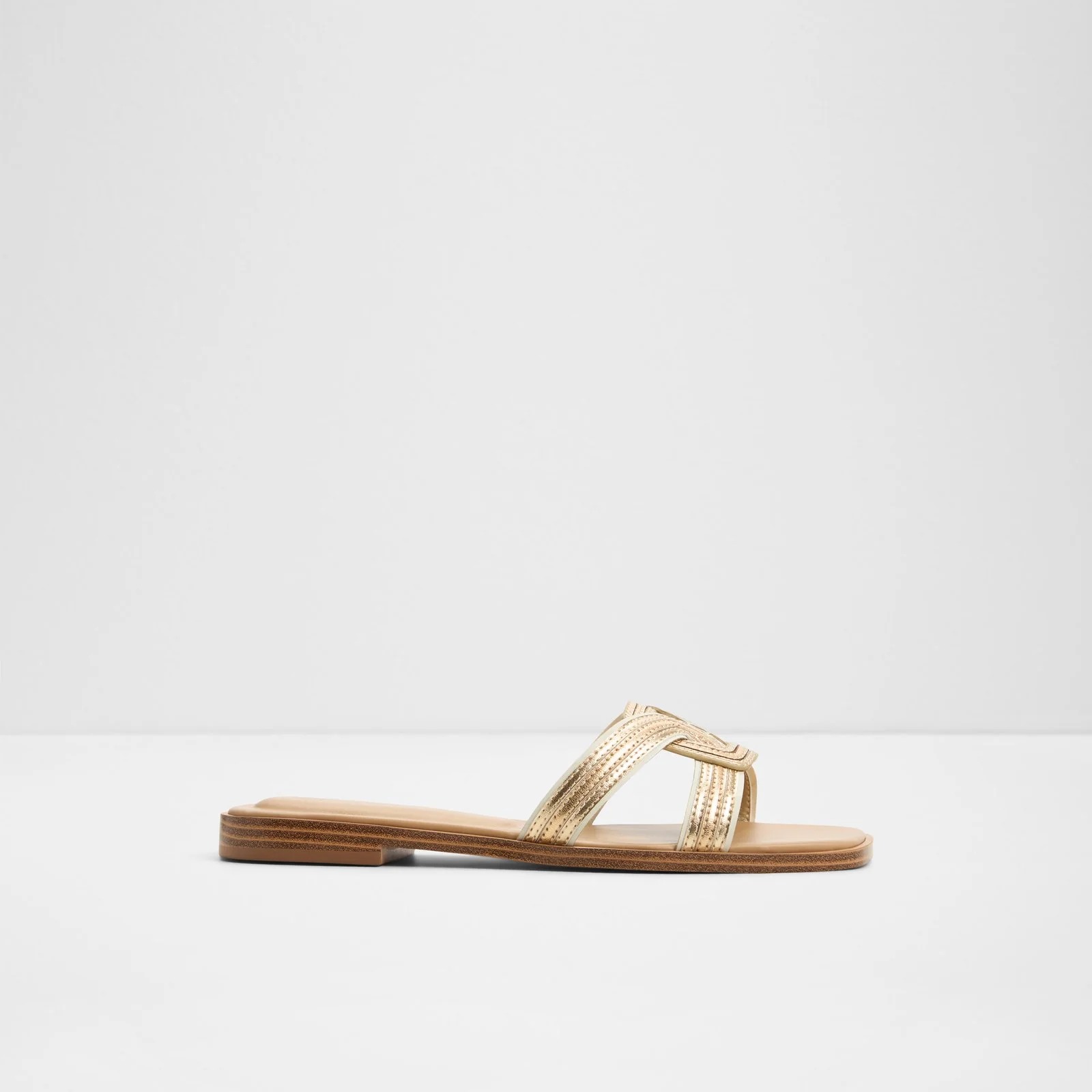 سليبر صيفي معدني الملمس بتصميم مسطح ولمسة مربعة عصرية يضيف تميّزًا أنيقًا.