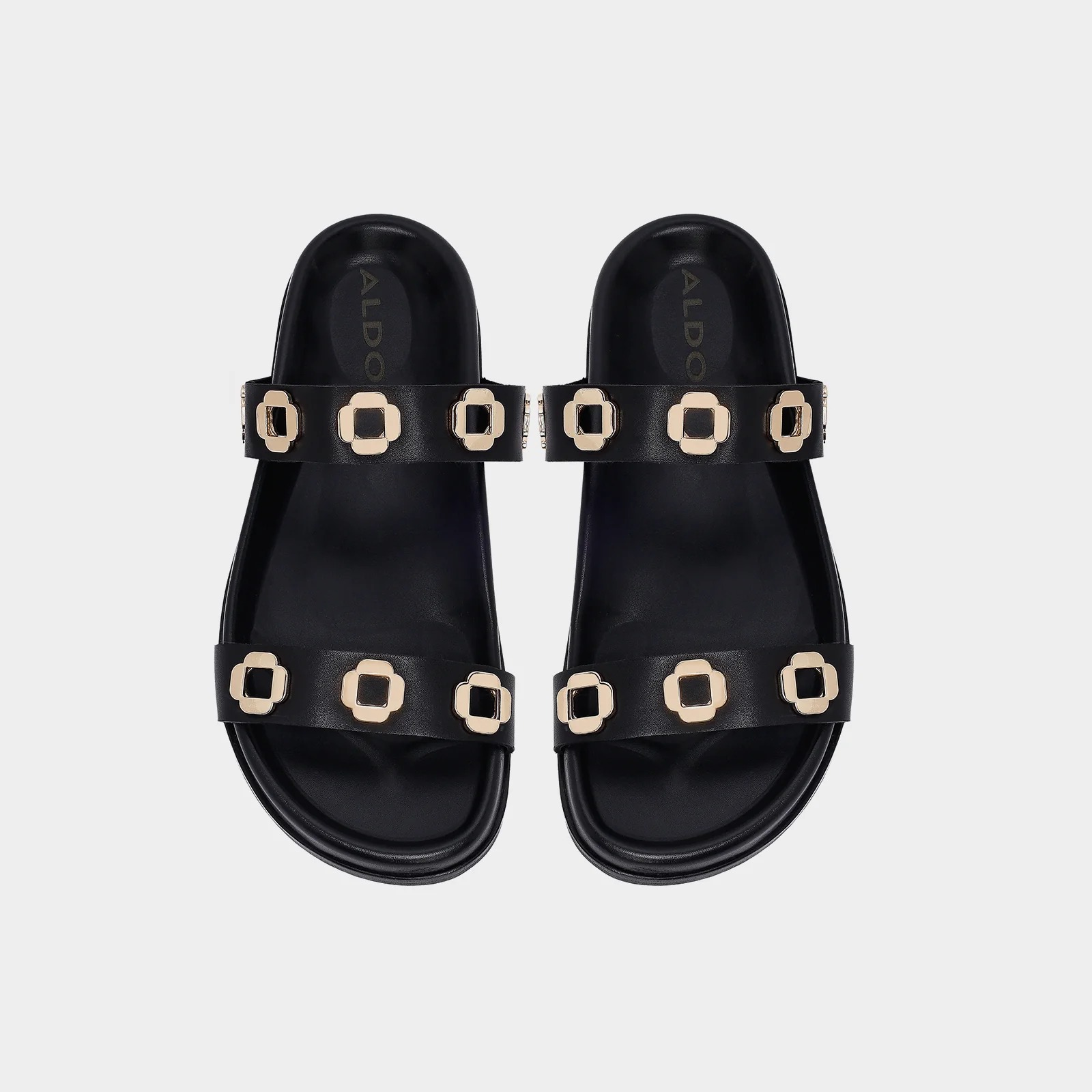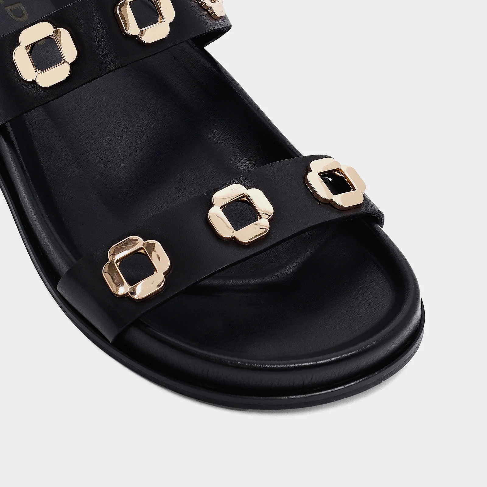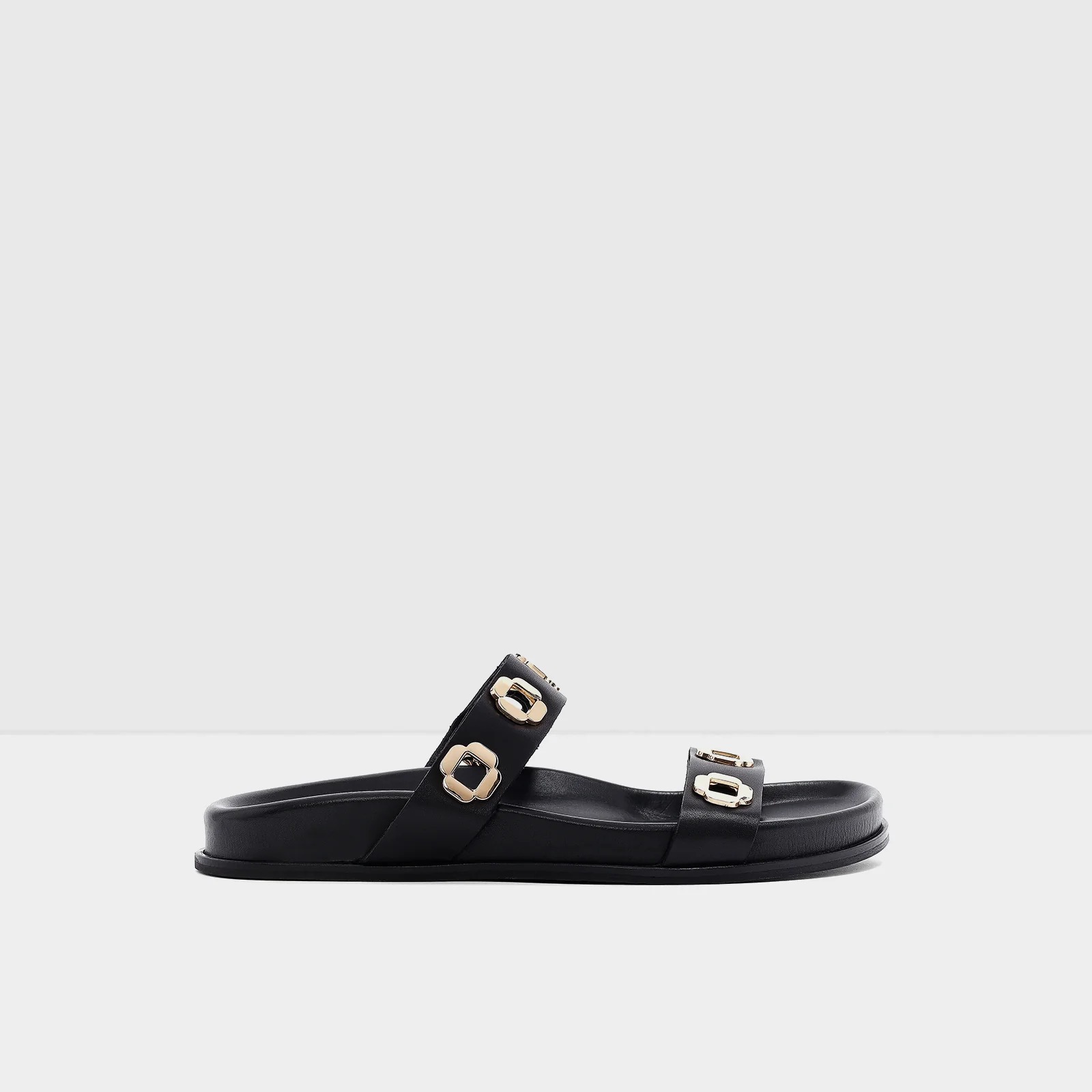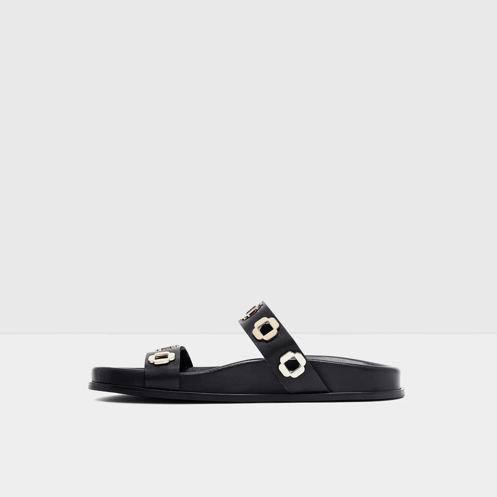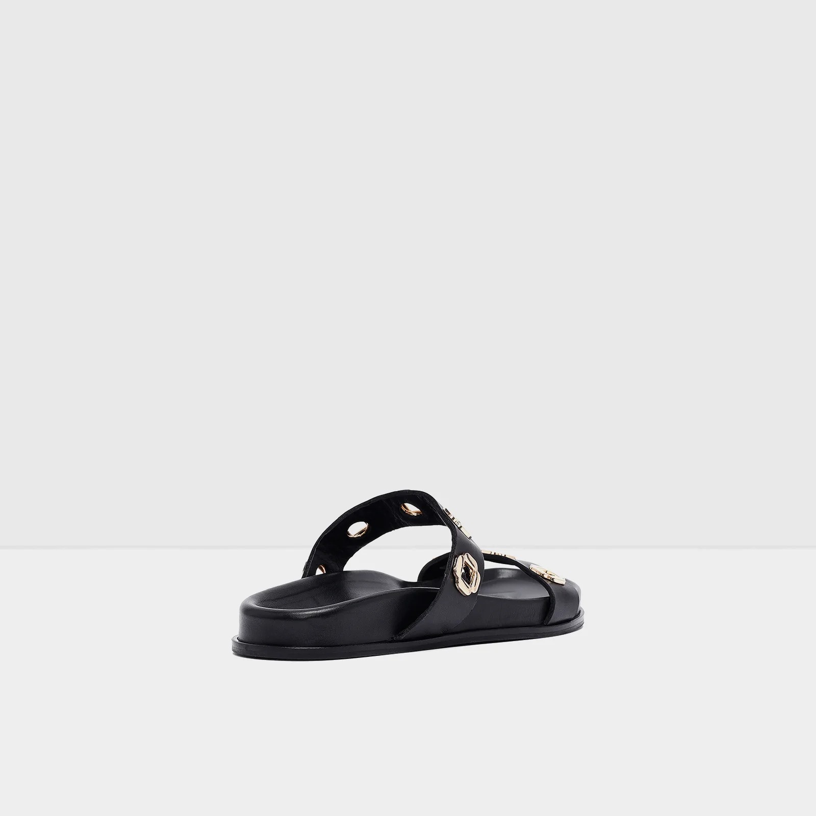 صندل مسطح أنيق بلمسة كاجوال مريحة وخامة من الجلد الصناعي.